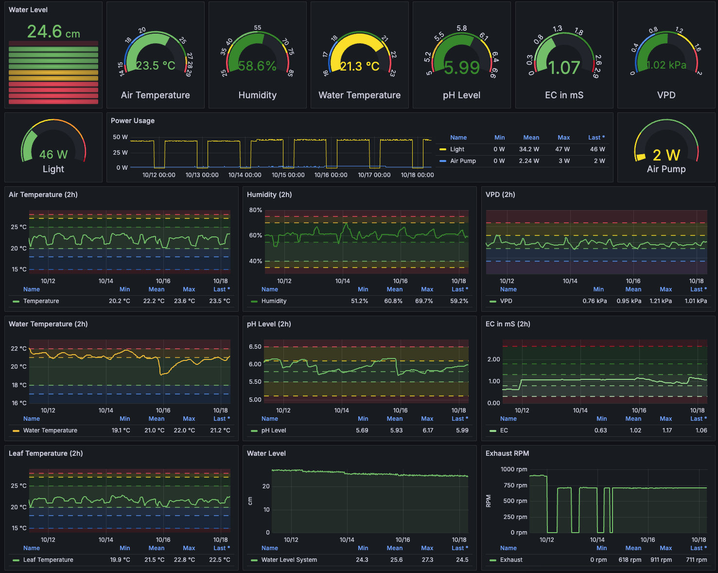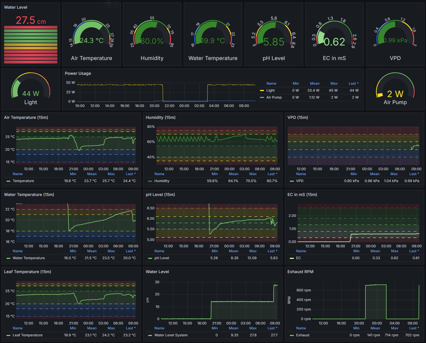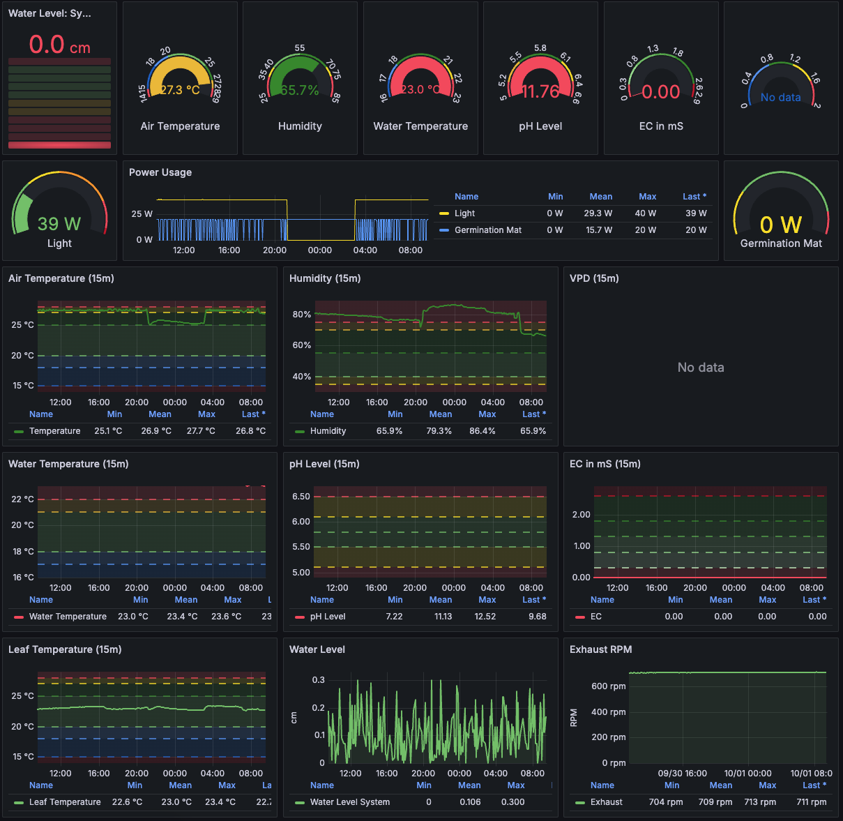 Der DWC-Eimer ist noch leer, daher sind pH und EC Quatsch und die Wassertemperatur entspricht der Umgebungsluft im Eimer. Gesteuert wird aus Home Assistant heraus, wobei da bisher lediglich das Licht ein- und ausgeschaltet wird.