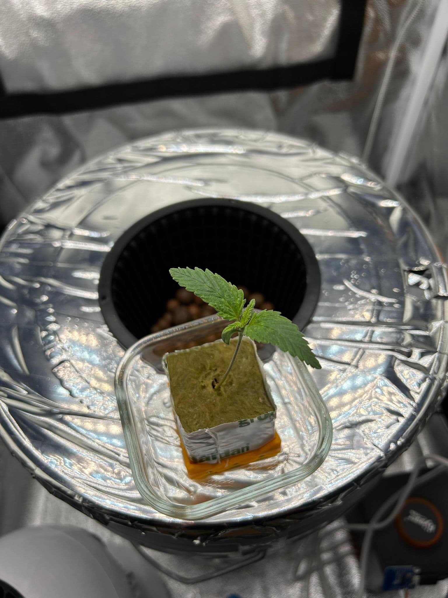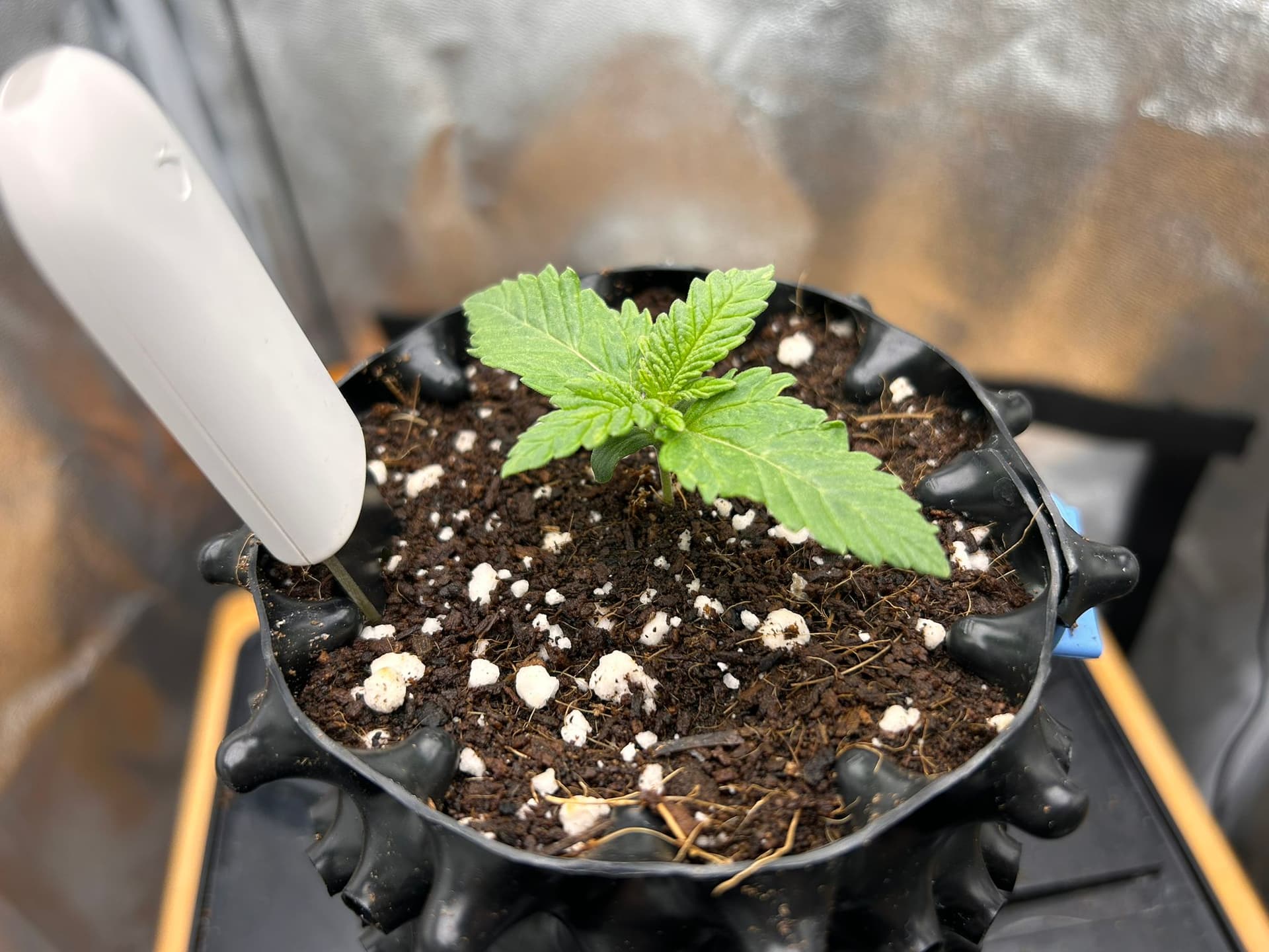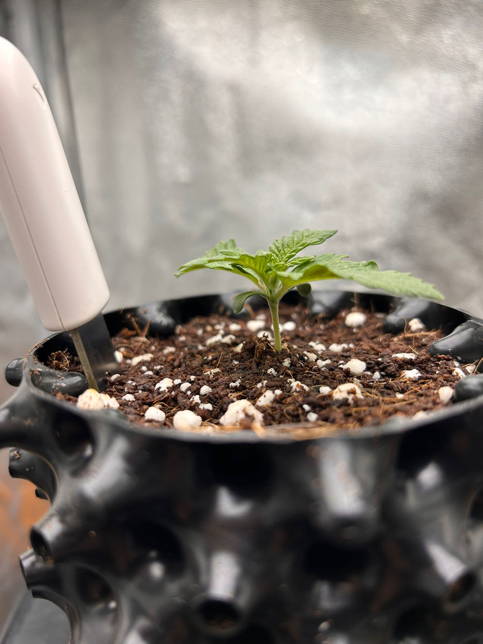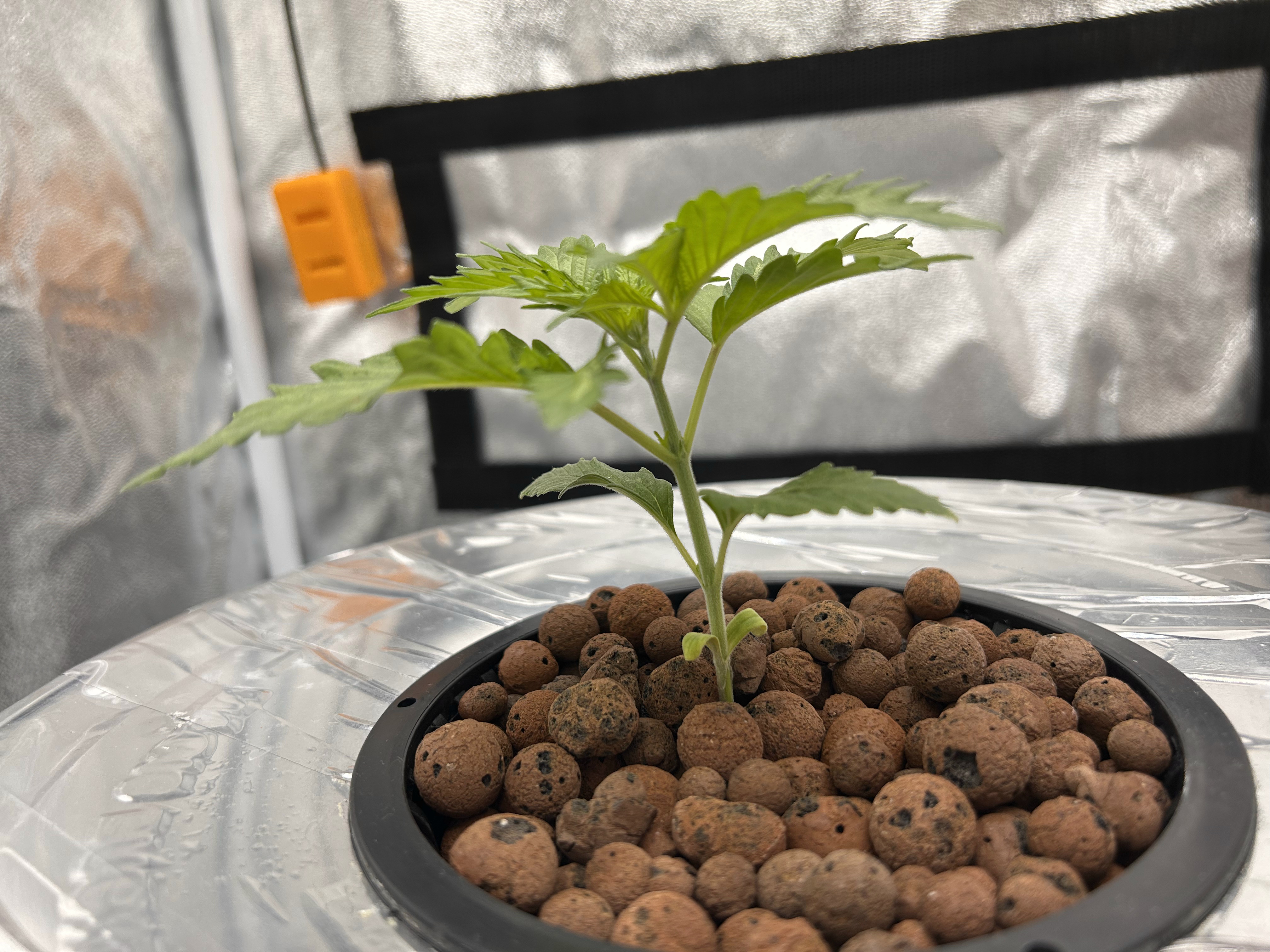 Ein kurzes Update: Bisher sieht alles super aus! Der Sämling ist am Freitag, also an Tag 5, in den ersten 1l Airpot gewandert und wächst nun fröhlich vor sich hin. Die ersten Dreifingerblätter nehmen langsam Form an: