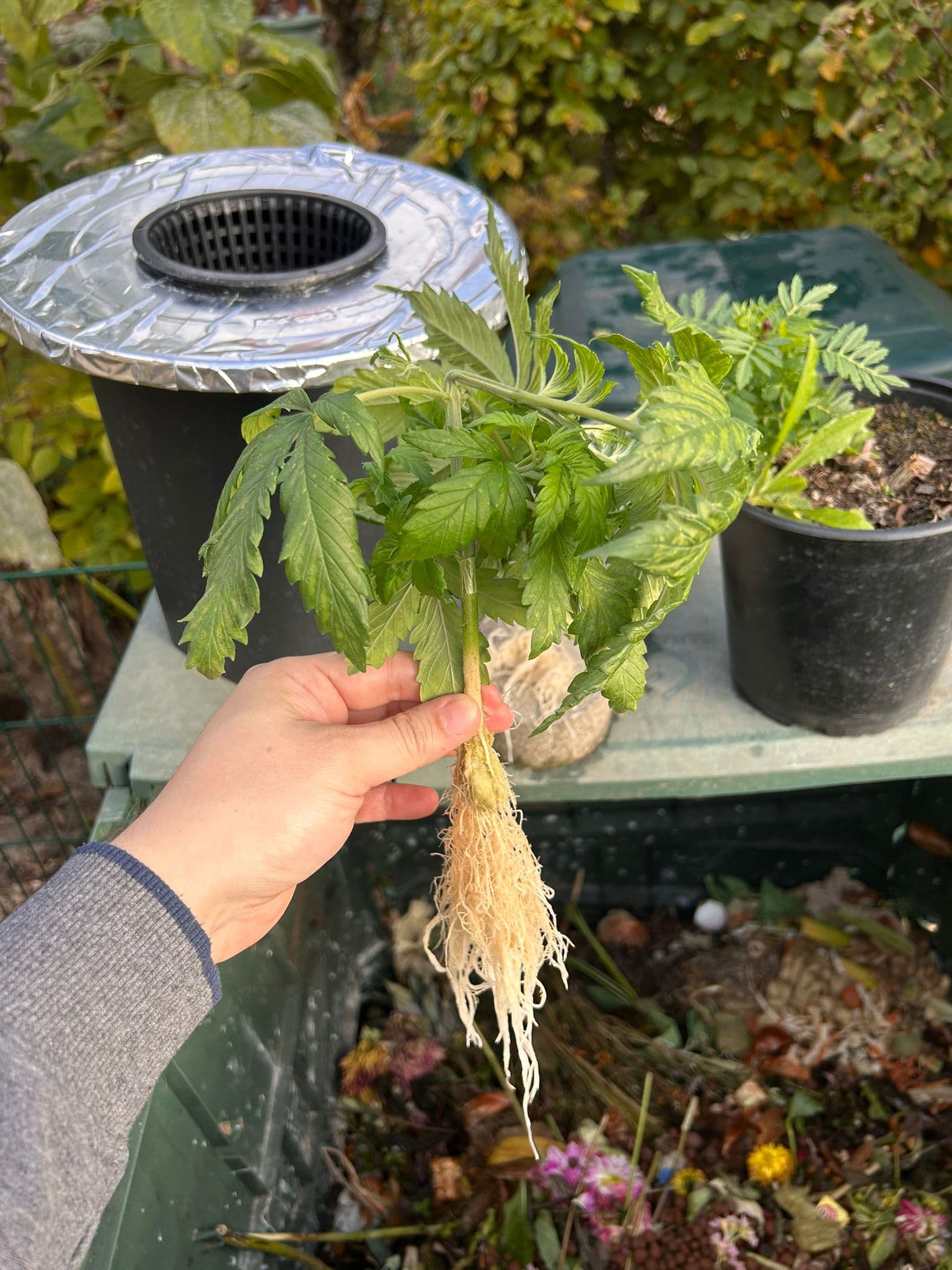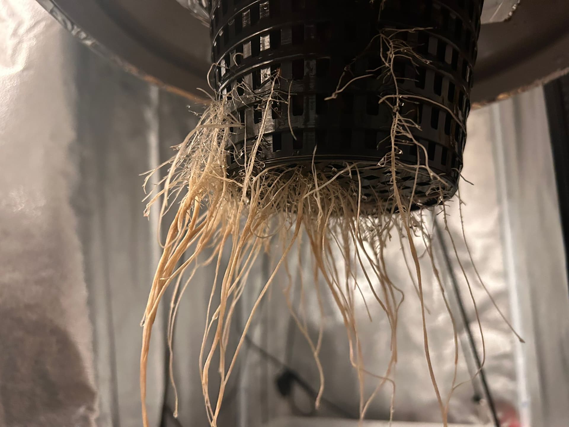 Deshalb war dann heute Umzug in den DWC-Eimer angesagt. Dort erwartet die Dame eine Närlösung mit 0.5ml/l TriPart, einem Schuss Root Booster und etwas H2O2 zur besseren Sauerstoffversorgung und um Keimen keine Chance zu geben.