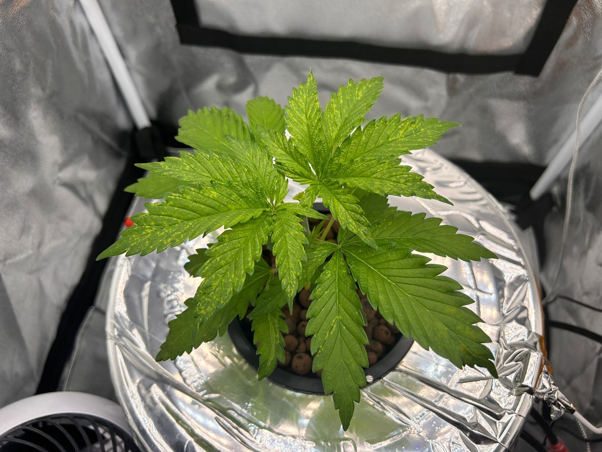 Sieht noch nicht ganz so gesund wie mein erster Grow in Coco aus, aber ich bin hoffnungsvoll. Hat sich anfangs alles etwas gezogen, nun kommen aber ordentlich Wurzeln aus dem Netztopf und sie wächst deutlich flotter. Wenn man mir die Pistole auf die Brust setzen müsste würde ich sagen am 11. Oktober war VT1, da waren die ersten Dreifingerblätter solide ausgebildet, aber irgendwie habe ich dieses mal gar nicht so doll Lust auf Vegetationstage zählen.