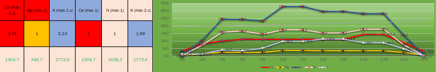 zu sehen ist das VerhÀltnis zwischen Ca zu Mg = 3,74 : 1 (max 5 : 1) K zu Ca = 2,13 : 1 (max 2 : 1)