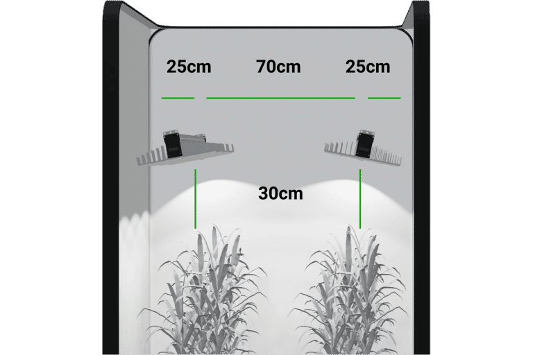 Die Leuchten sind 25cm von den Wänden zu positionieren, damit zwischen den Lampen ein Abstand von 70cm beträgt. Der Abstand zur Lampe sollte 30cm betragen.