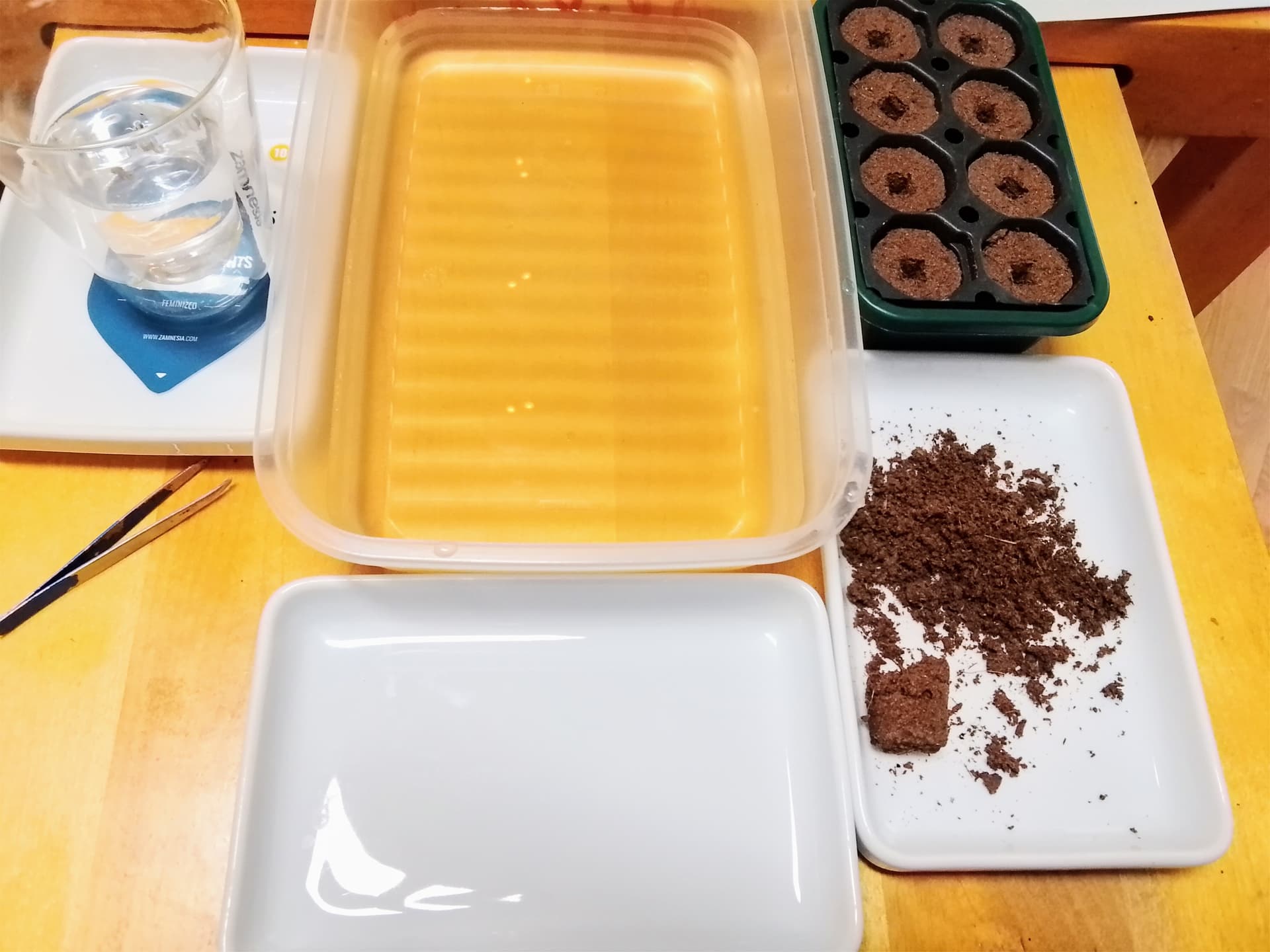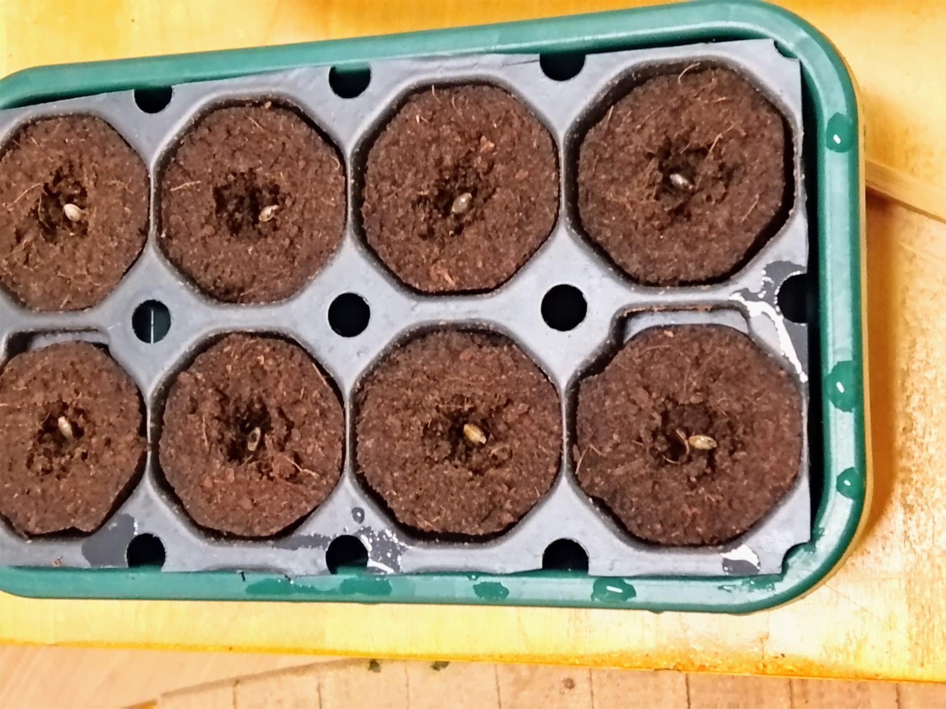 So, genug gelabert. Gestern am 06.09. hab ich die Seeds erstmal ins Glas mit Wasser geschmissen. Nach 24 Stunden ging’s weiter: alle in feuchte EasyPlugs gelegt, leicht mit Erde bedeckt und nochmal ordentlich mit dem Sprüher befeuchtet.