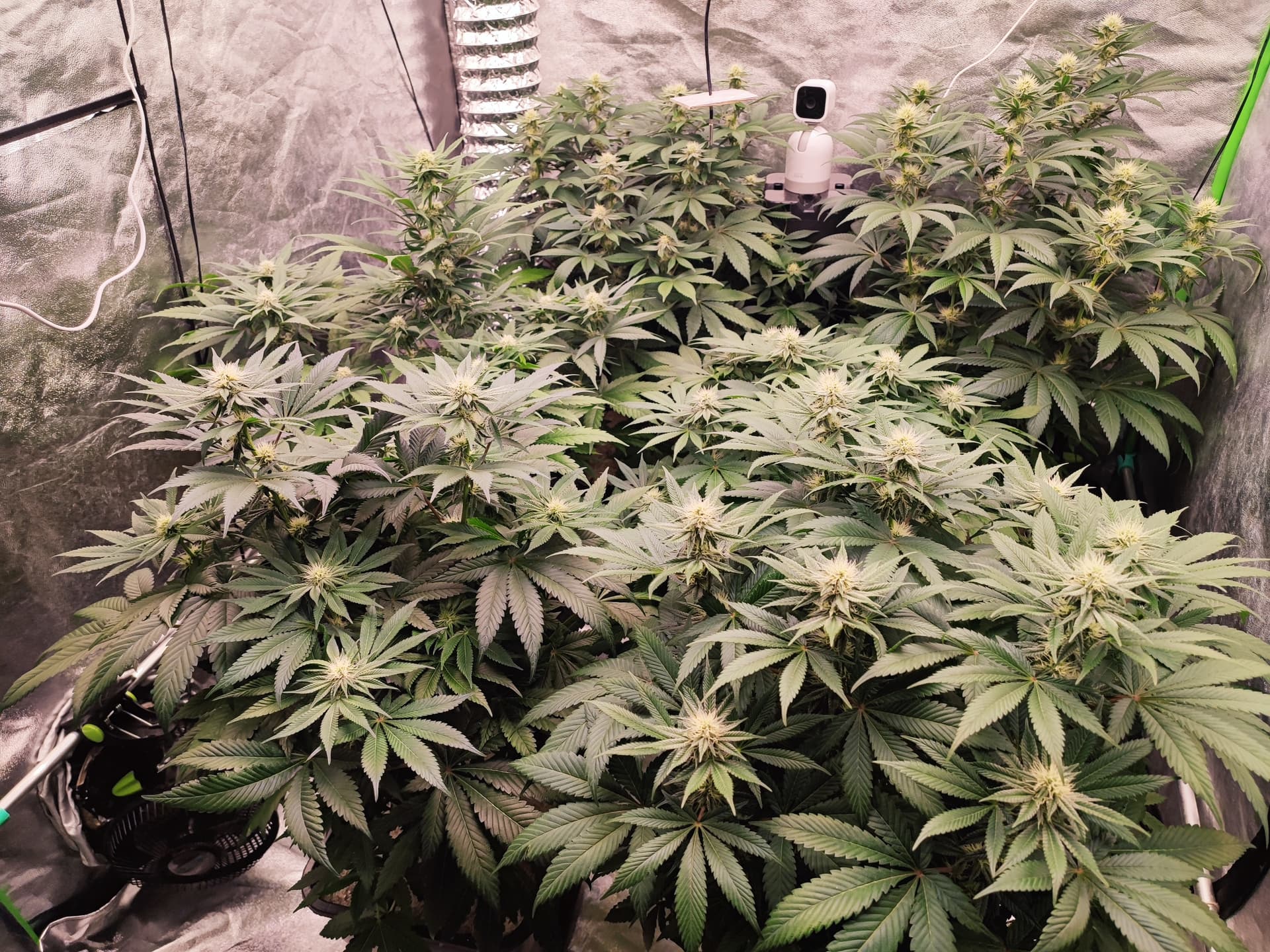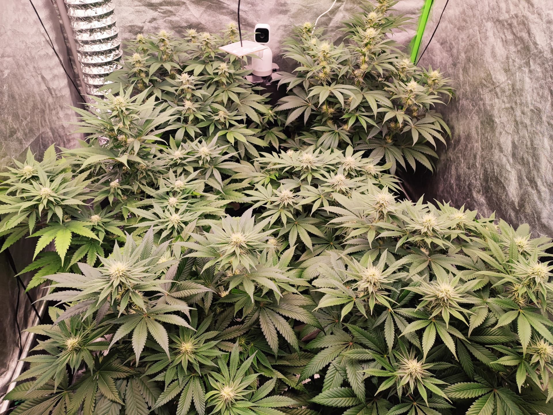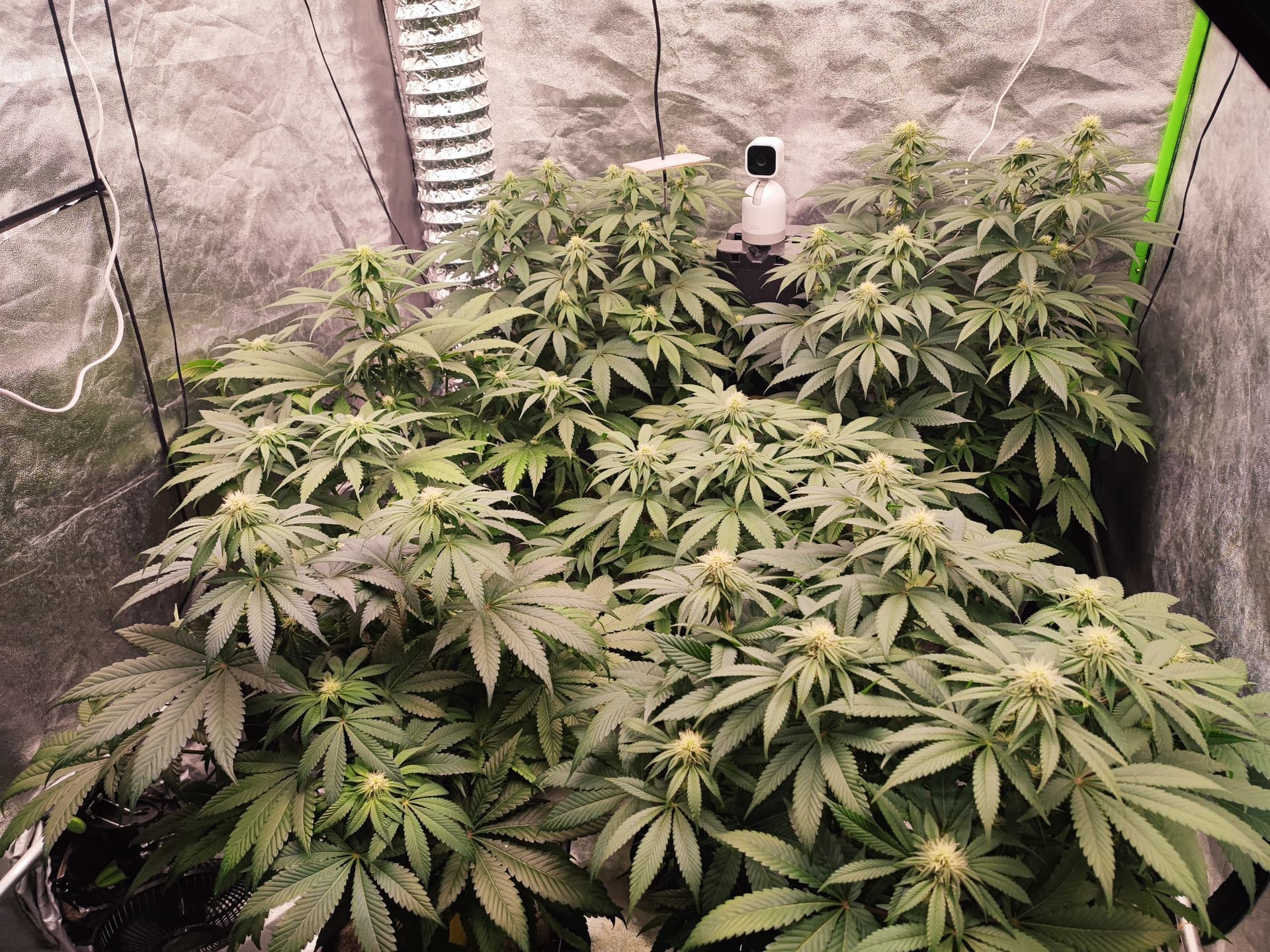 Canopy weitgehend geschlossen, Buds gut angesetzt, Stretch praktisch abgeschlossen. Die Pflanzen stehen jetzt stabil im generativen Modus â keine Spargel, keine hĂ€ngenden BlĂ€tter.