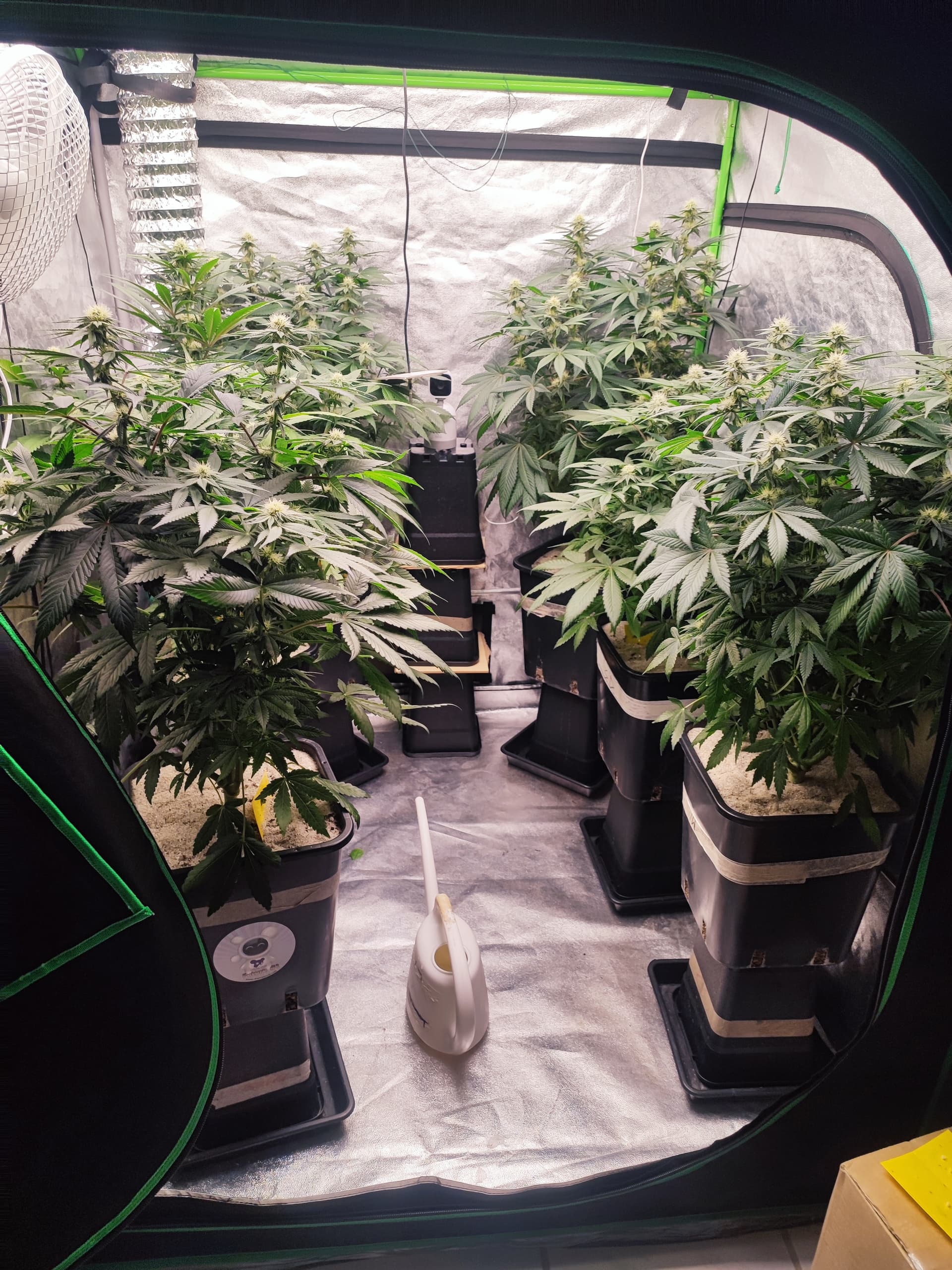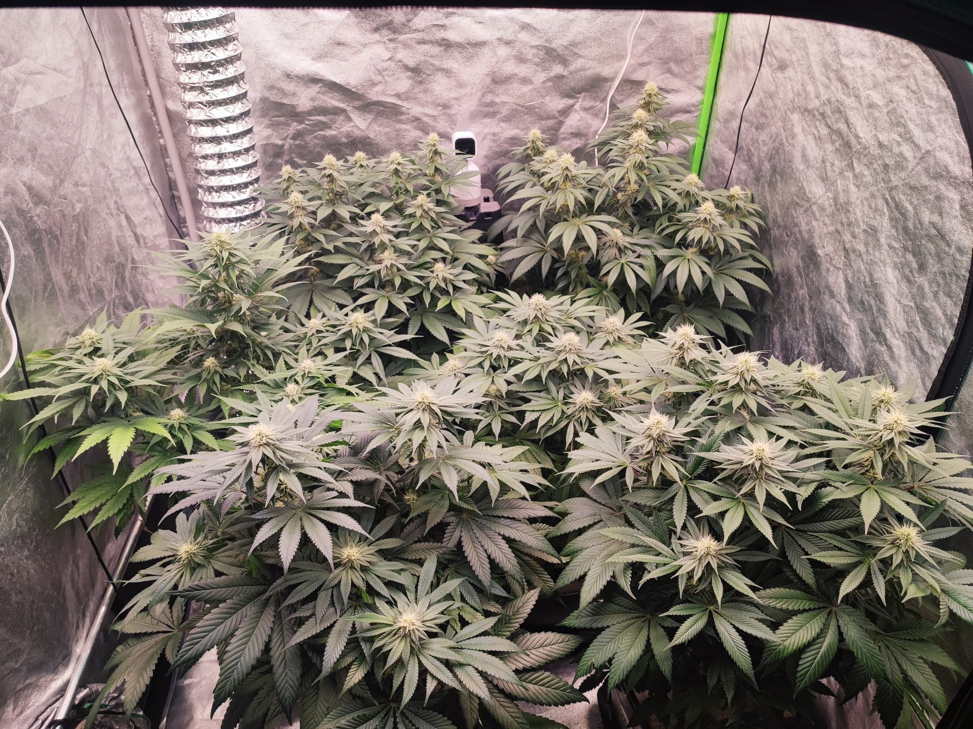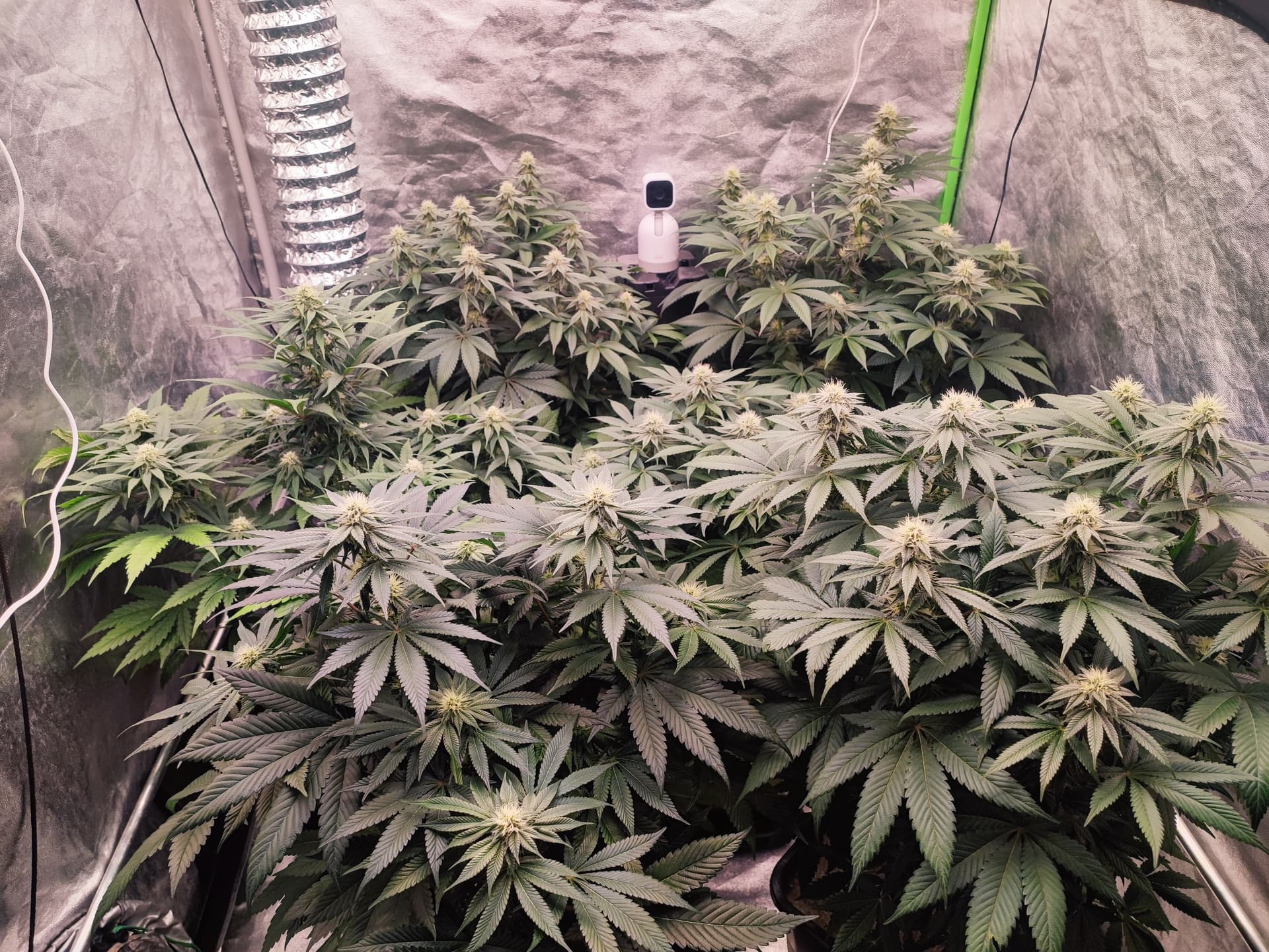 Canopy weitgehend geschlossen, Buds gut angesetzt, Stretch praktisch abgeschlossen. Die Pflanzen stehen jetzt stabil im generativen Modus â keine Spargel, keine hĂ€ngenden BlĂ€tter.