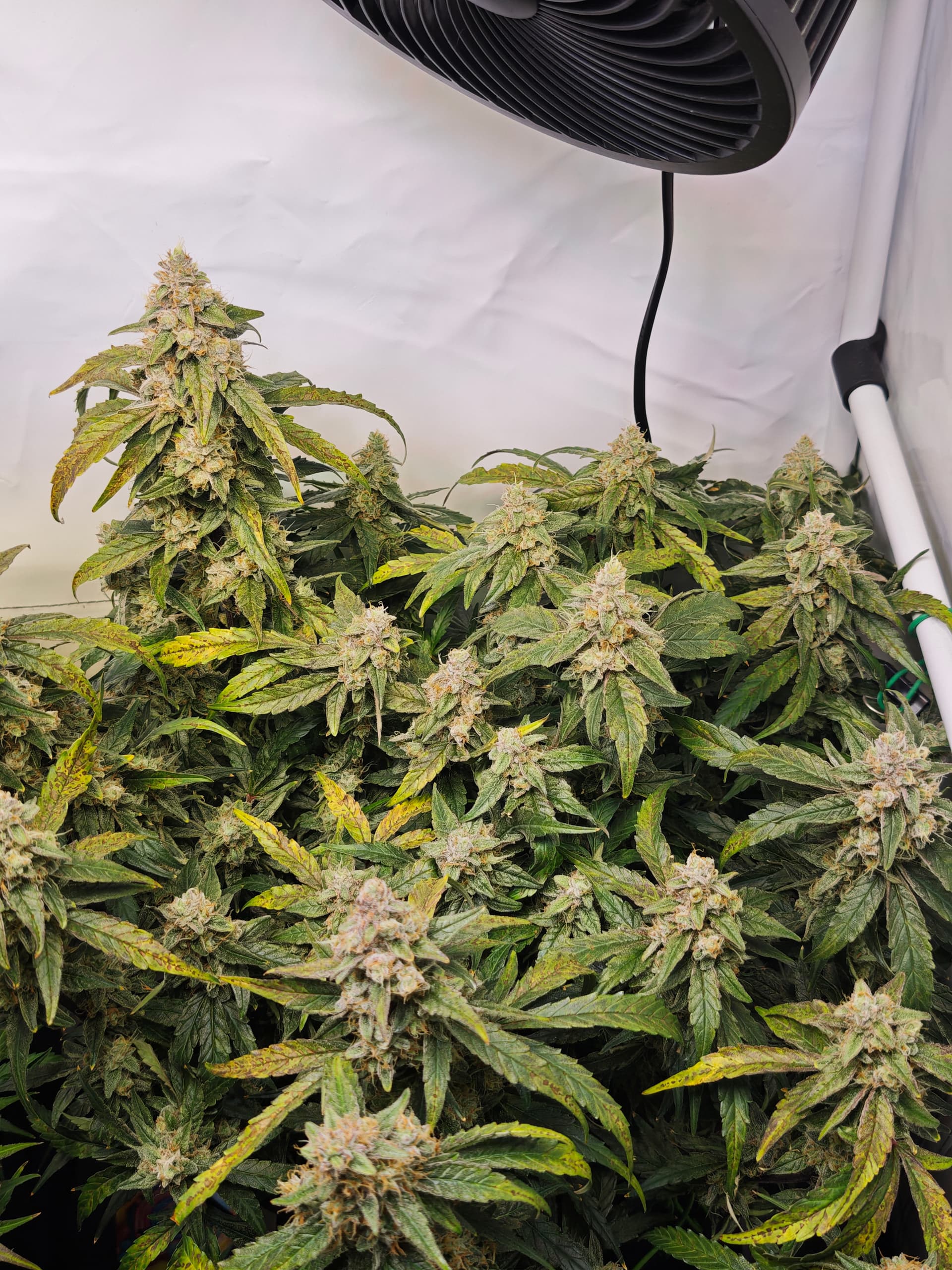 . Der Stretch zeigt mir öfters den Mittelfinger wenn ich überlege zu Entlauben,der Lümmel.Bin mindestens jeden Zweiten dran den Tank wieder zu befüllen,die Ladys haben Durst. Biege täglich das ein oder andere Blatt runter das die Köpfe schön Sonne tanken können. Das einzige was sich im Moment als schwierig rausstellt ist das ich die LF nicht unter 54-56% gedrückt bekomme ohne das mir die Temperatur viel zu hoch knallt,nachdem entlauben wird das passen. Die Ventis pusten derweil aus zwei Richtungen und sorgen dennoch für eine gute Umluft.