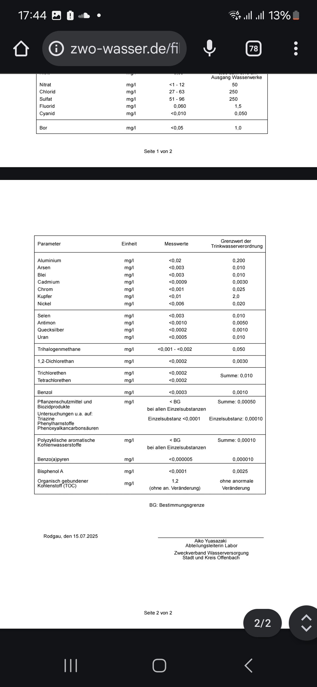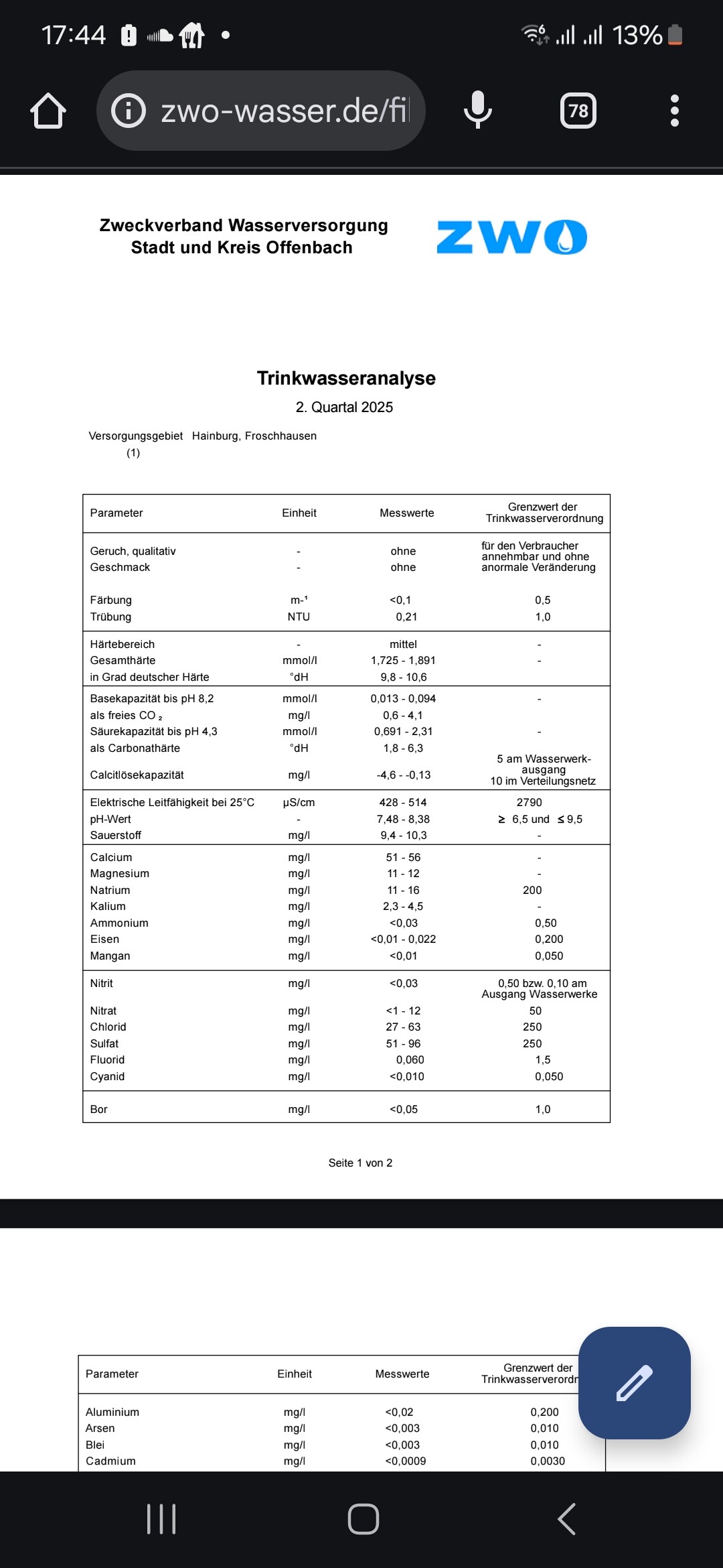 Wasser wird vom örtlichen Versorger genommen, dieses hat gute Werte! Datenblatt hänge ich an.