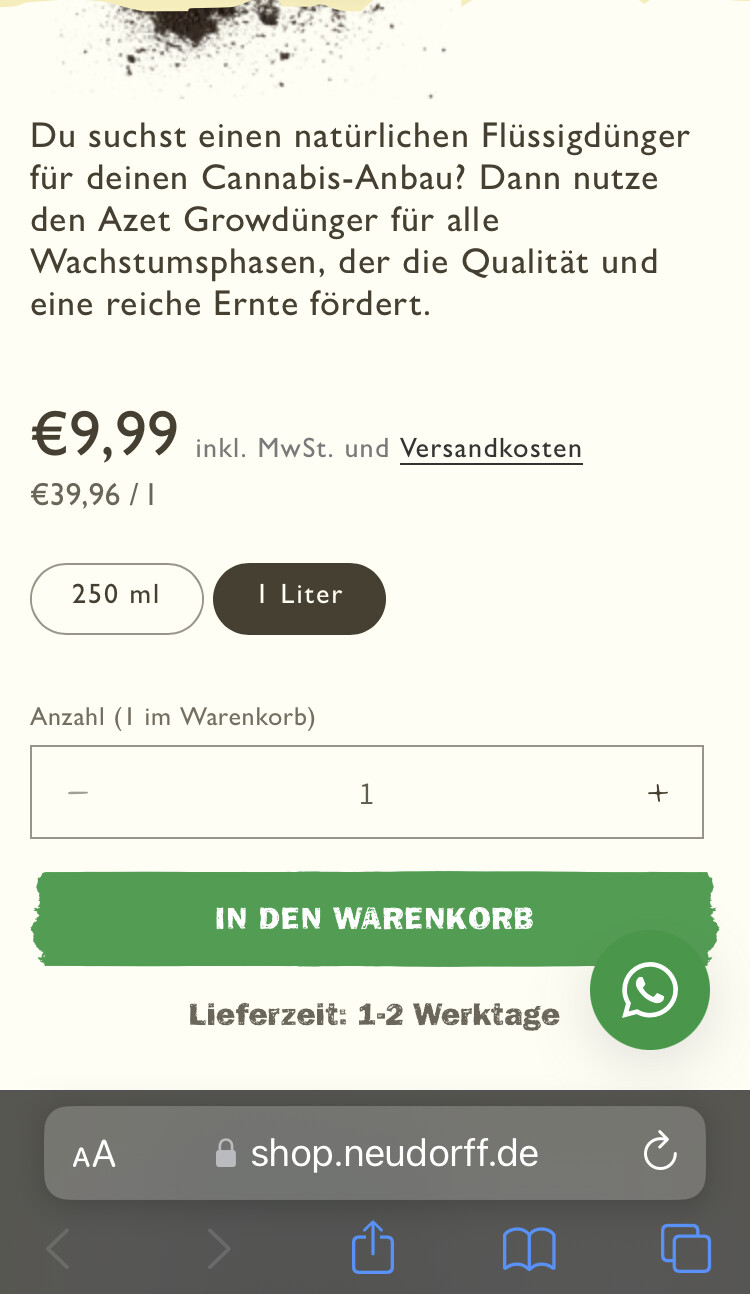 Nun schaue ich mir deinen Neudorff Dünger an und stelle fest, dass es ein ganz normaler Basis N-P-K Dünger “für alle Phasen” ist. Dazu auch nur 250 ml. Der Literpreis wäre hier also 25,96 Euro.