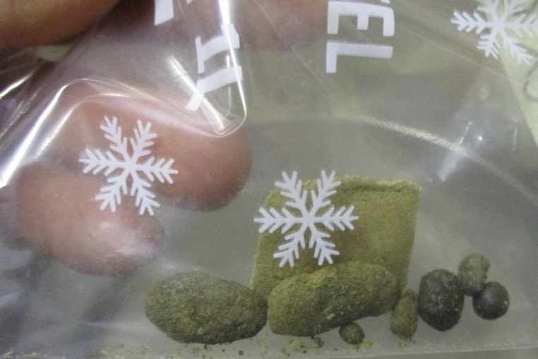 Hier sieht man witzigerweise klar einen Unterschied zwischen gesiebtem und von den Fingern gekratzem Hasch: die drei kleinen, dunkelsten Kugeln sind von den Fingern.