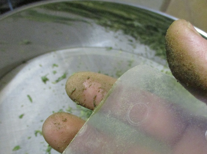 Das Bröseln geht schneller und mit etwas weniger verharzten Fingern über die Bühne, wenn man die gut getrockneten Buds von oben nach unten zusammendrückt. Seitlich quetschen dauert länger und schmiert mehr.