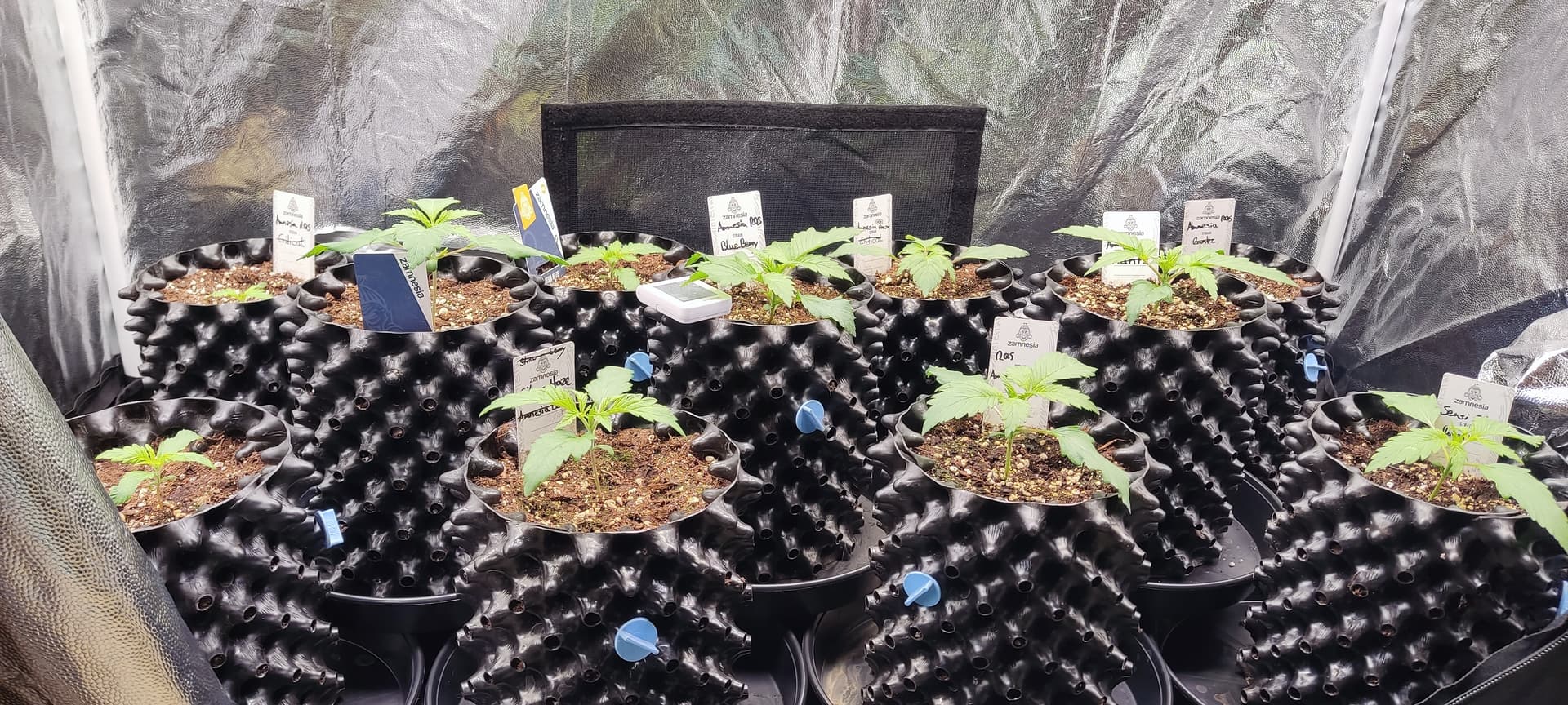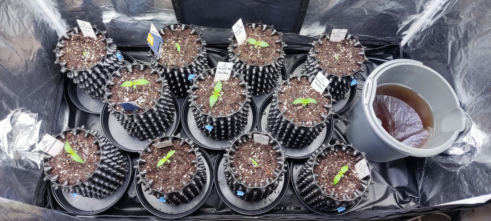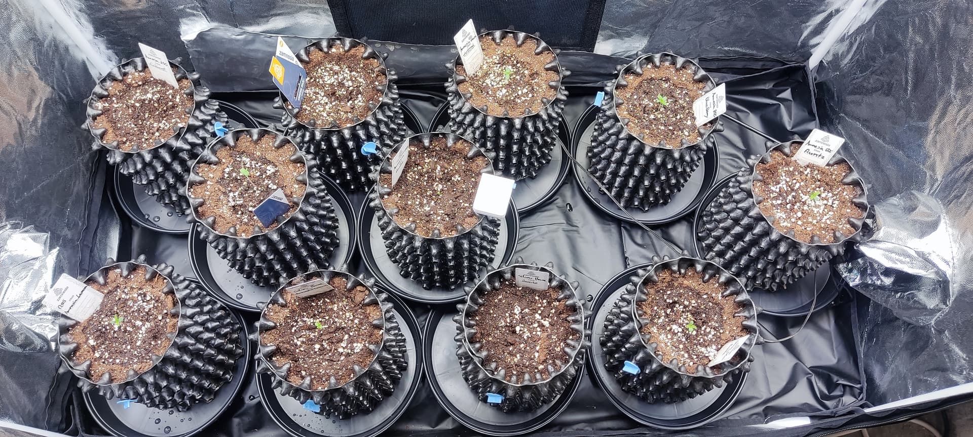 Jetzt sind sie in 3L Airpots gelandet und in einem 120x60 Zelt in Zwischenbehausung gezogen, bis der Raum fertig ist - und siehe da, die ersten Köpfchen recken und strecken sich ![]()