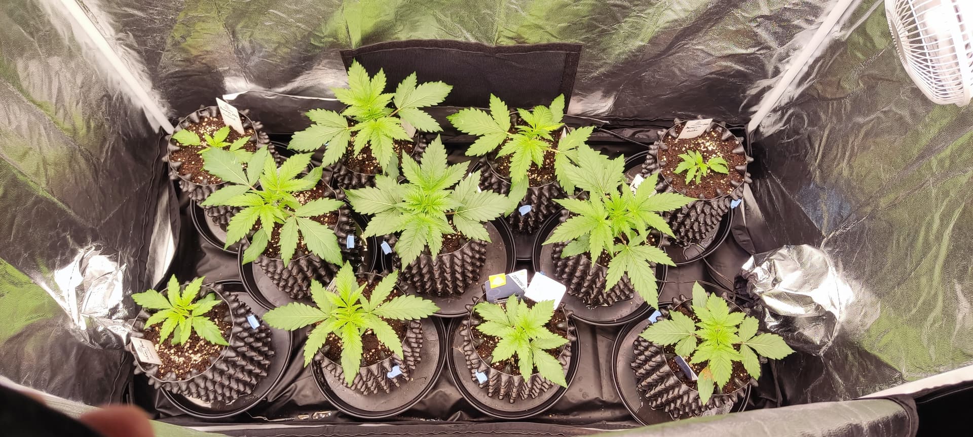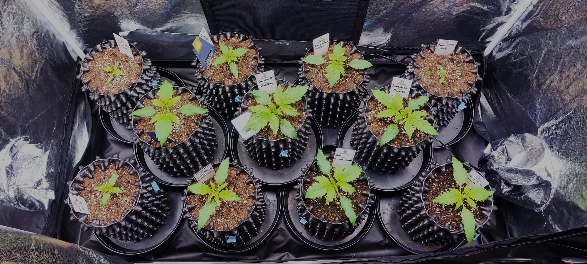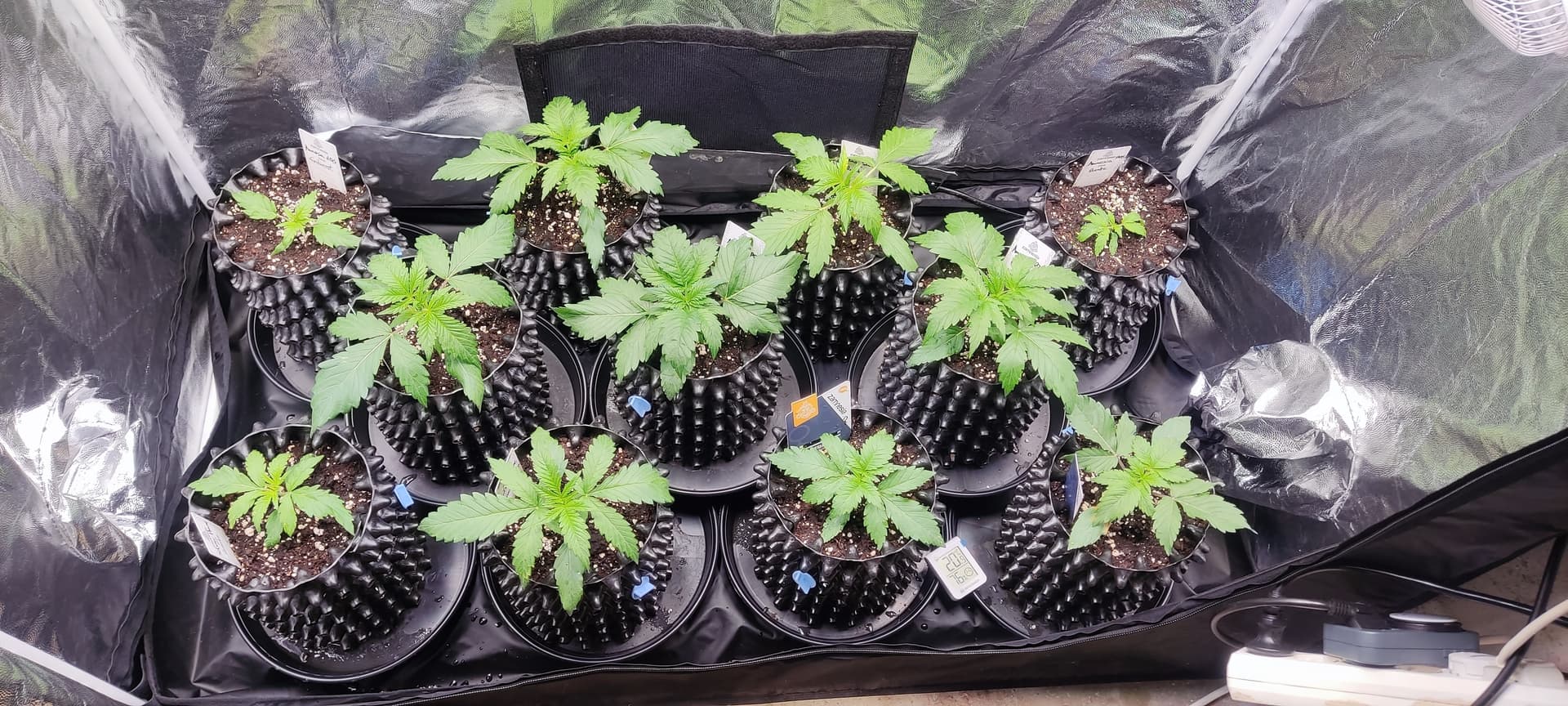 Jetzt sind sie in 3L Airpots gelandet und in einem 120x60 Zelt in Zwischenbehausung gezogen, bis der Raum fertig ist - und siehe da, die ersten Köpfchen recken und strecken sich ![]()