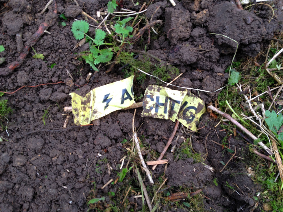 Ich nehme an, dass das noch ein ganzes Stück tiefer liegt und robust verkleidet ist. Trotzdem hab ich da natürlich nicht weitergegraben. Hab das Band wieder in die Erde getan und ein Ende rausgucken lassen, damit ichs nicht vergesse.