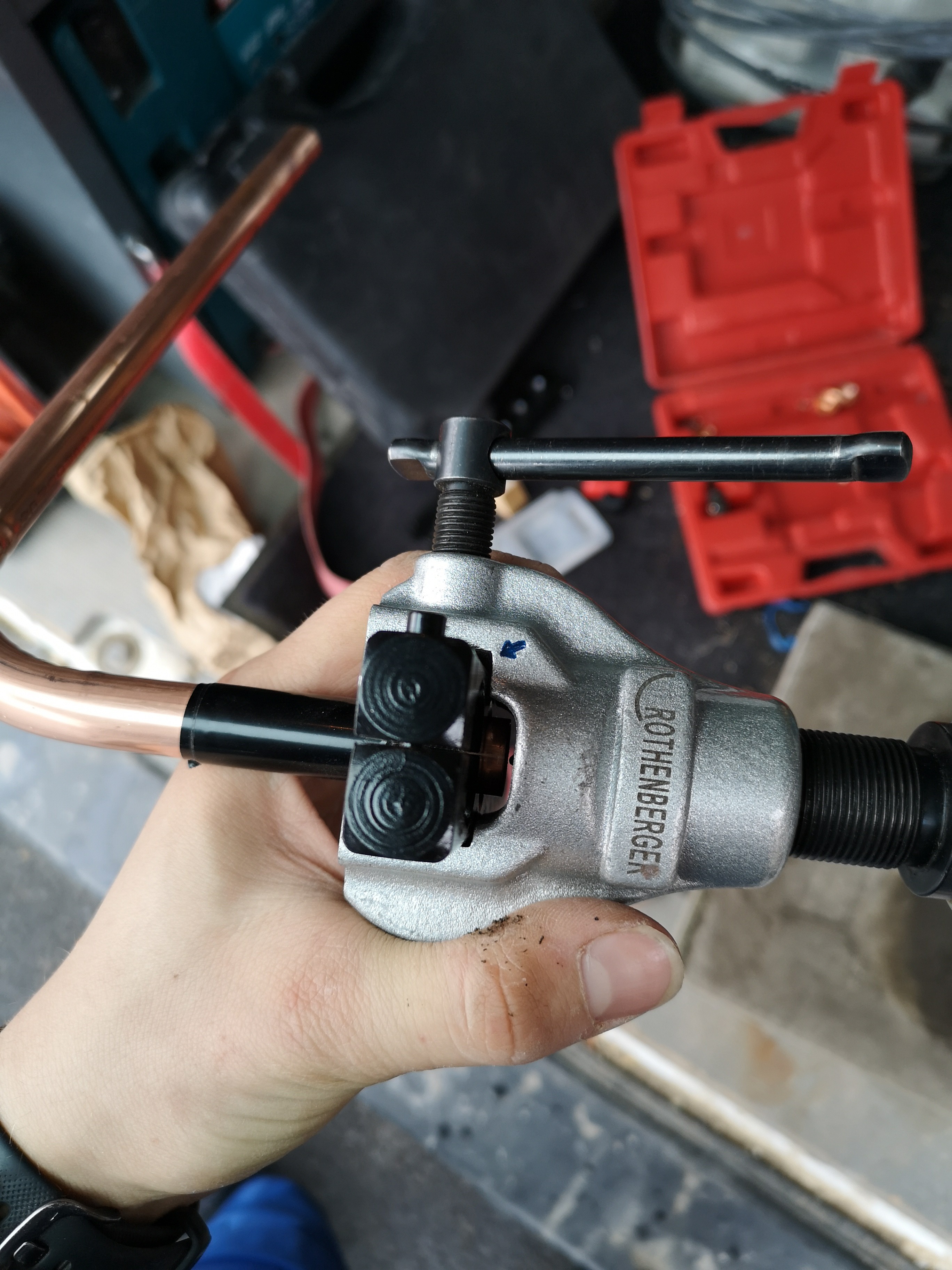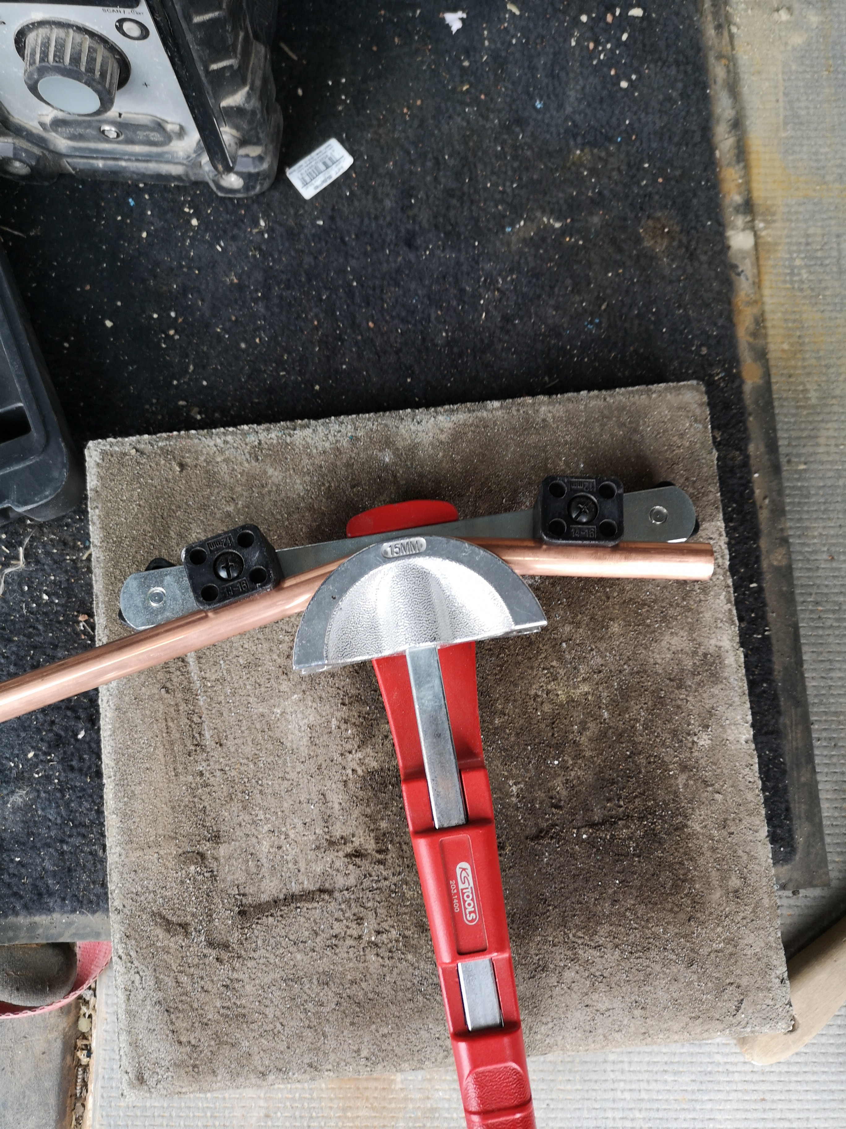 Erst habe ich mit dem Biege-Apparat einen 90° Bogen gebogen. (Man ignoriere bitte die Speckfalten am Rohr, der Apparat hat ne Macke