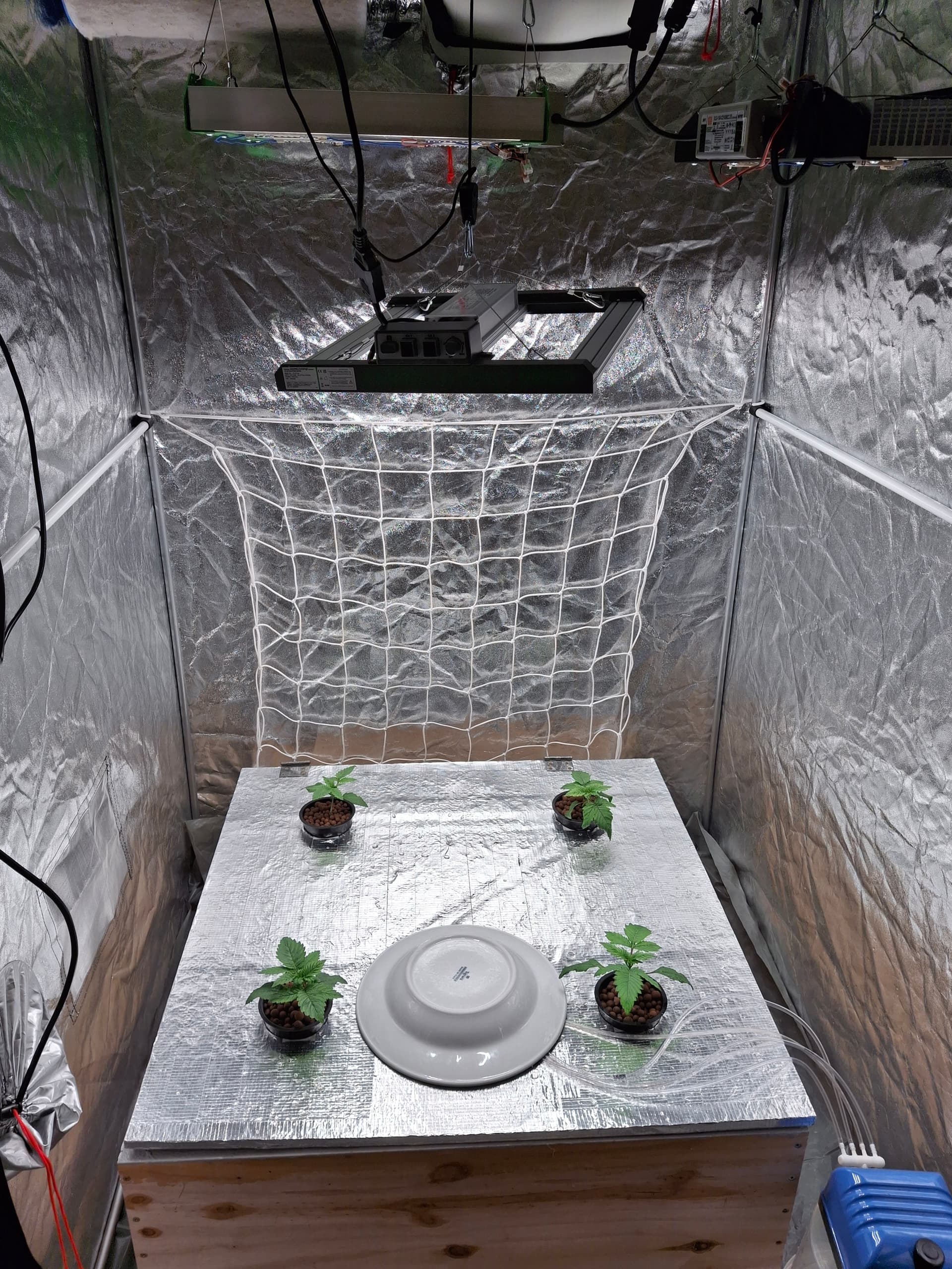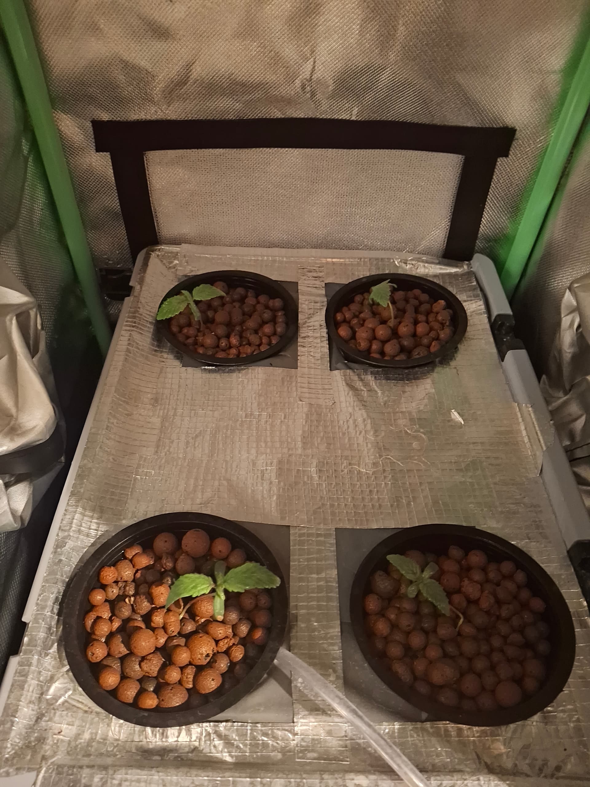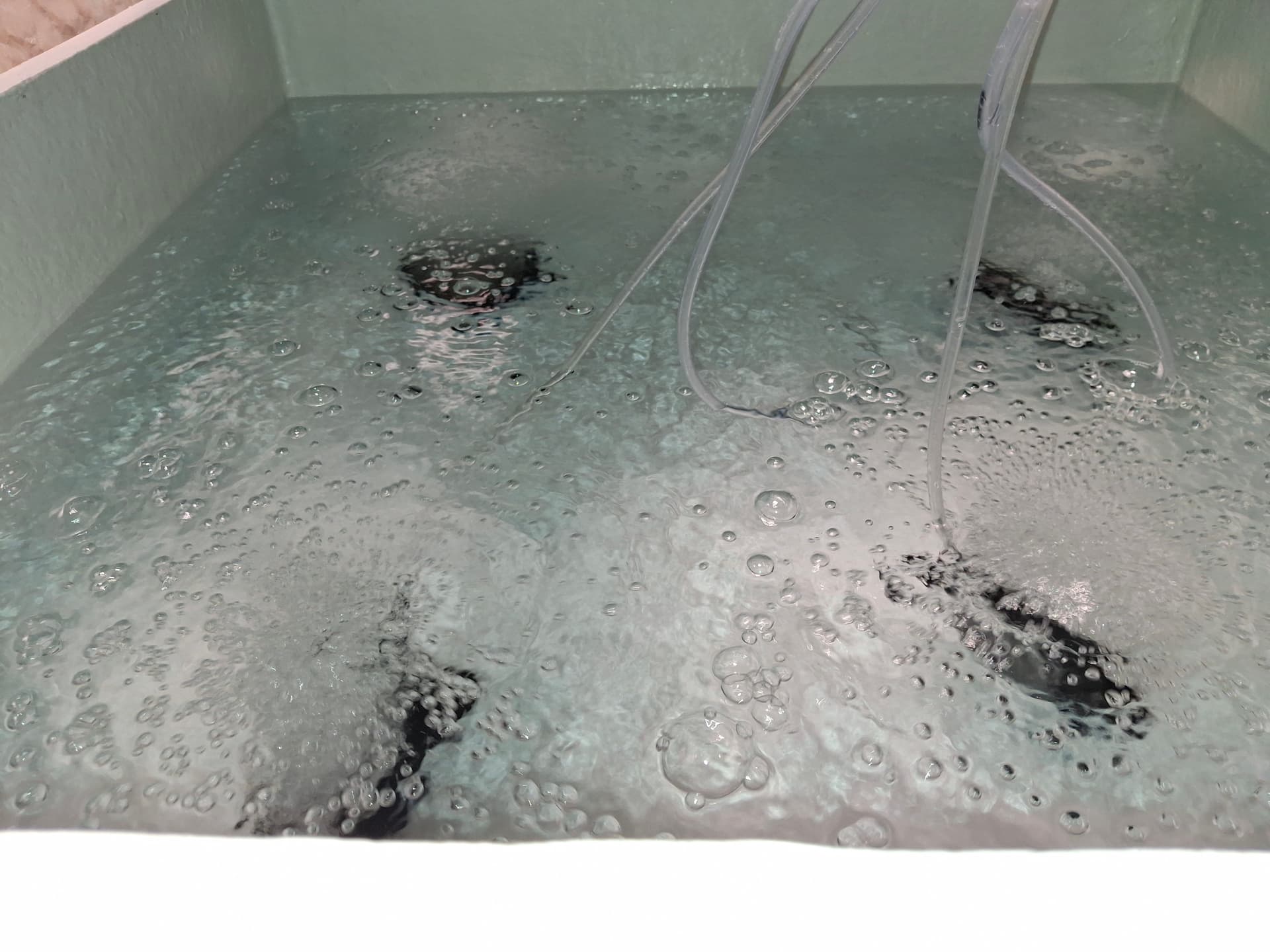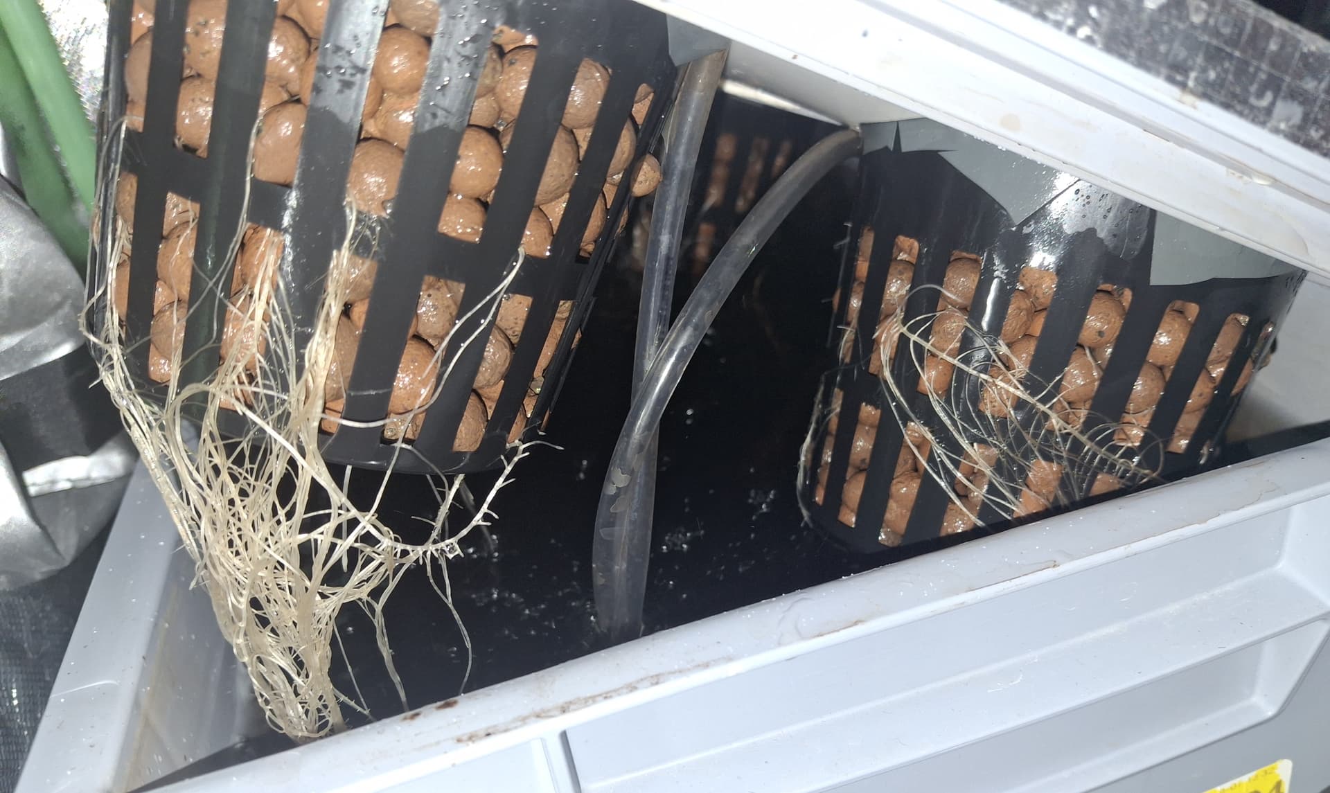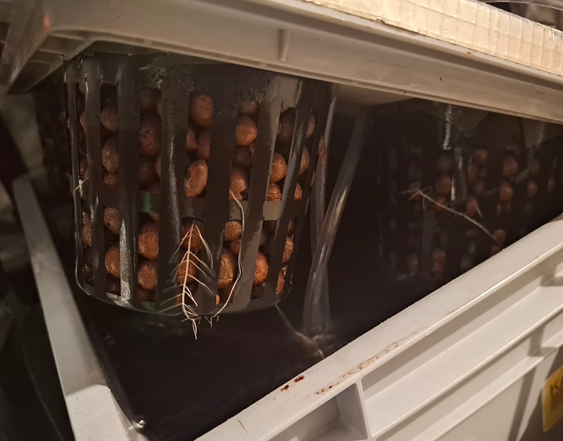Heute wurde spontan umgetopft. Die Wurzeln kamen sich zu nah und sind schon leicht ineinander gewachsen. Also habe ich den großen Tank erst mal mit Wasser aufgefüllt und die Aquasteine eingelegt. Ins Substrat kommen über die V 30 ca. 12 l Luft / min.