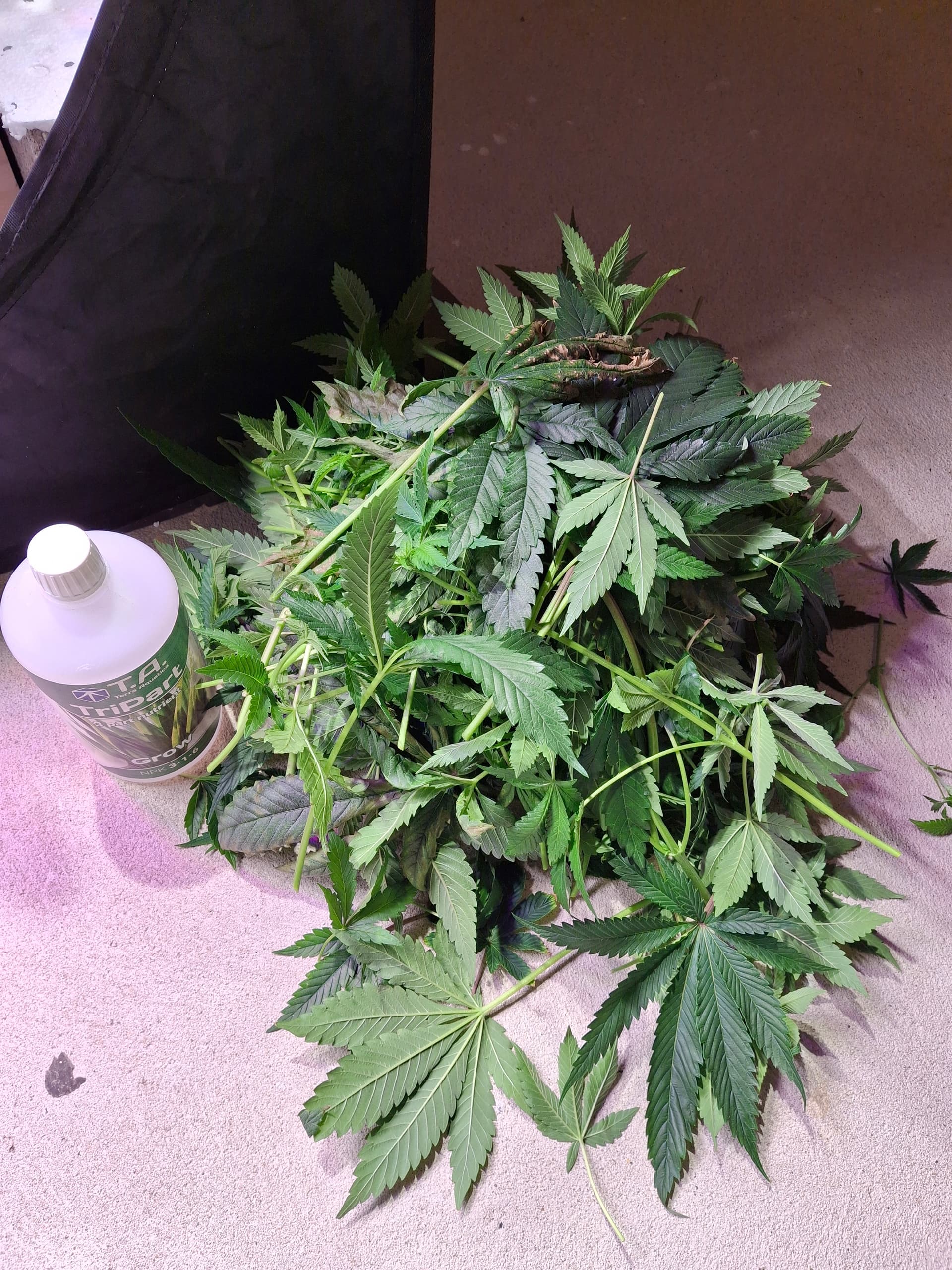So siehts nach dem Beschneiden aus. Zum Vergleich noch die Masse die raus kam. Diese Menge fällt aktuell wöchentlich an. Überwiegend Sonnensegel und Mini Triebe von weit unten.