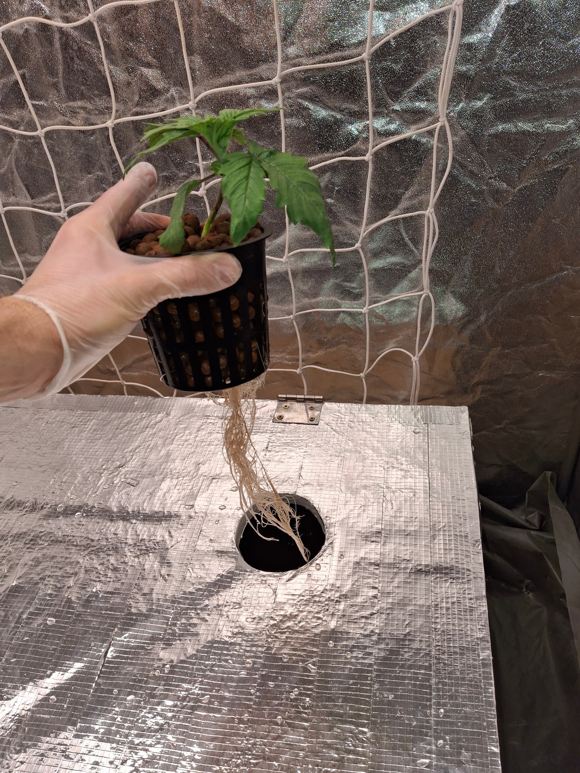 Ich hebe den Netztopf aus dem kleinen Tank und setze den in das Loch im großen Tank. Dabei kommt natürlich etwas Bewegung in den Blähton, weshalb das Wurzelwerk schon halbwegs passen sollte. Werde den Schritt dokumentieren.