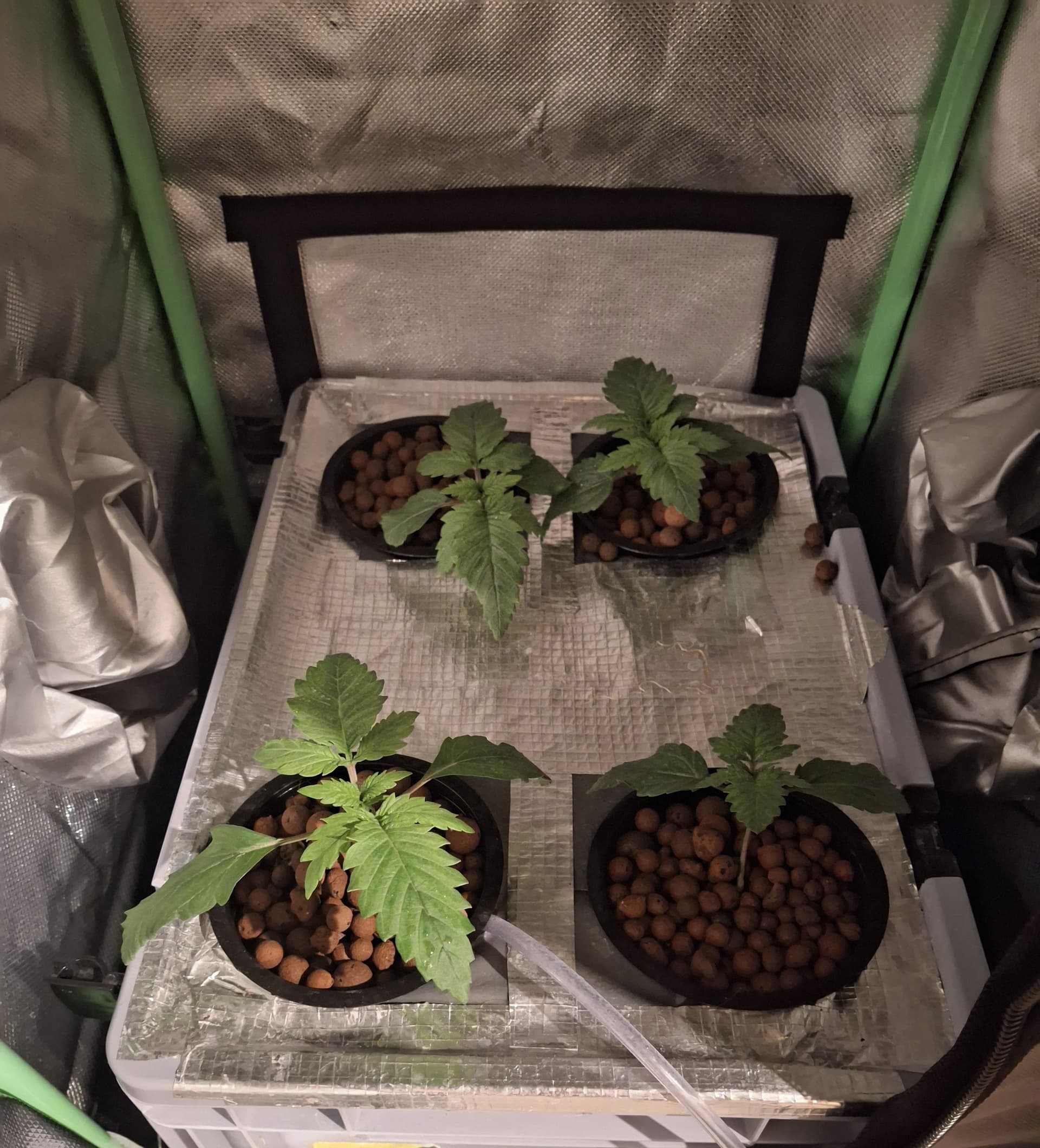Parameter soweit unverändert, EC leicht erhöht. Die Kleinen haben es allmählich geschafft und sind keine Sämlinge mehr. Habe den Ventilator zu spät in Einsatz genommen, wodurch die leicht krumm wurden. Wollte die Setup bedingt was spargeln lassen, damit ich die Stelle zum Toppen höher bekomme. Aber was noch nicht ist kann ja noch werden.