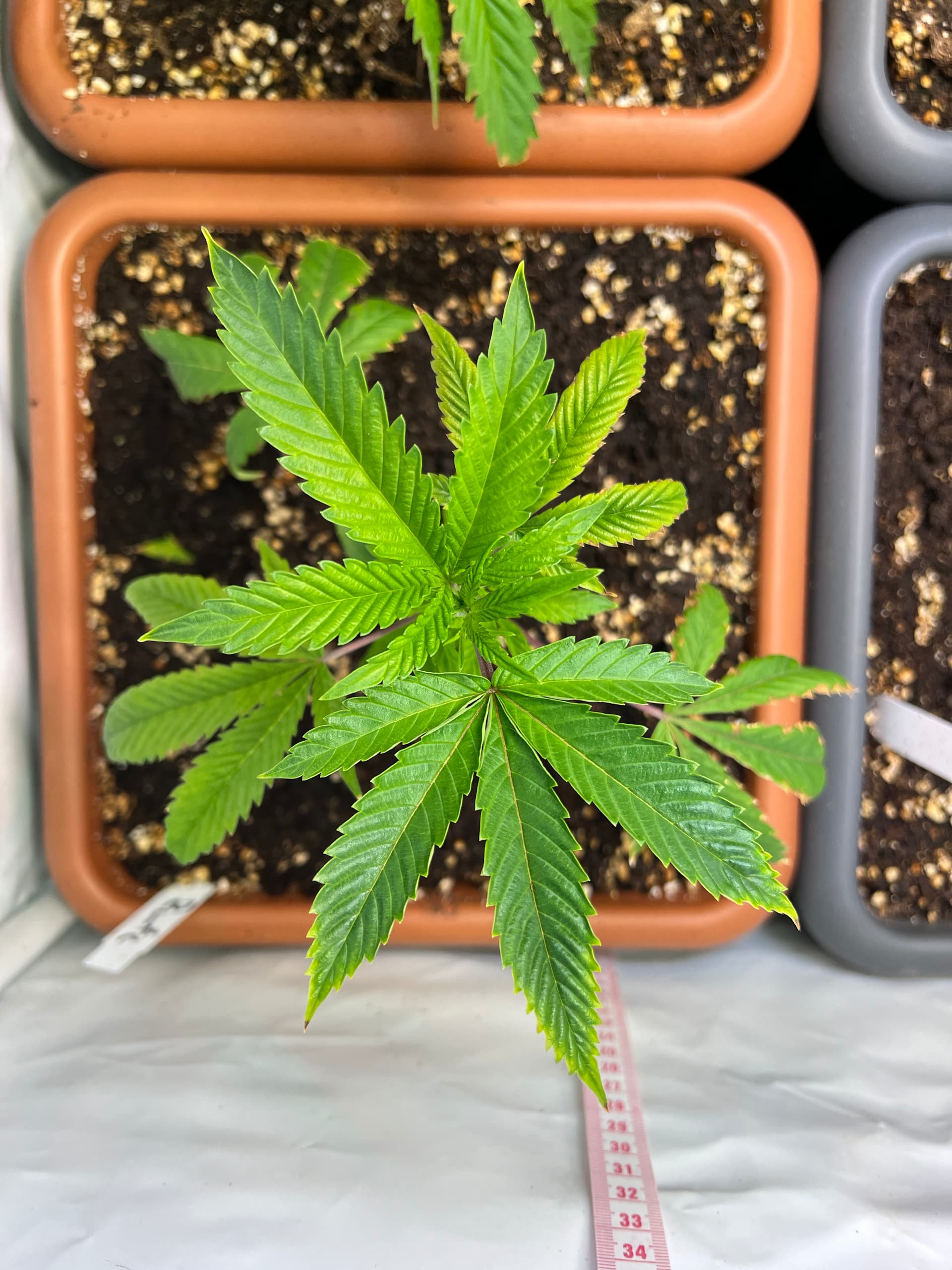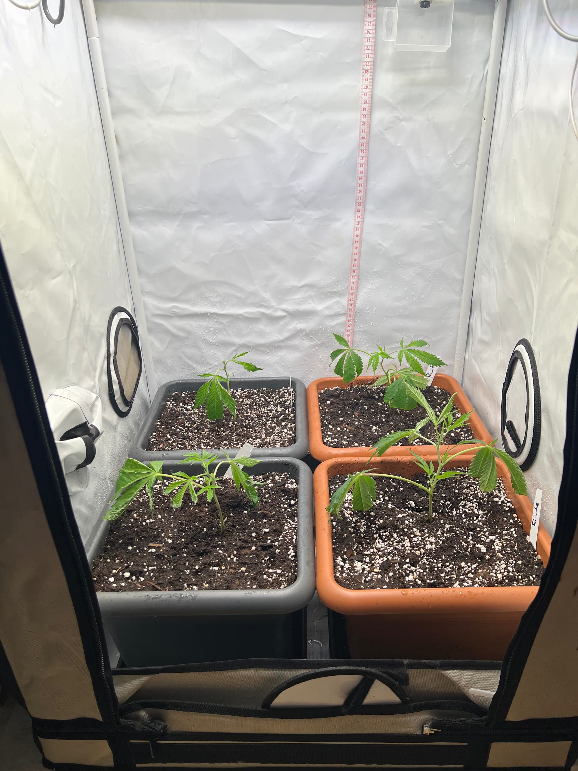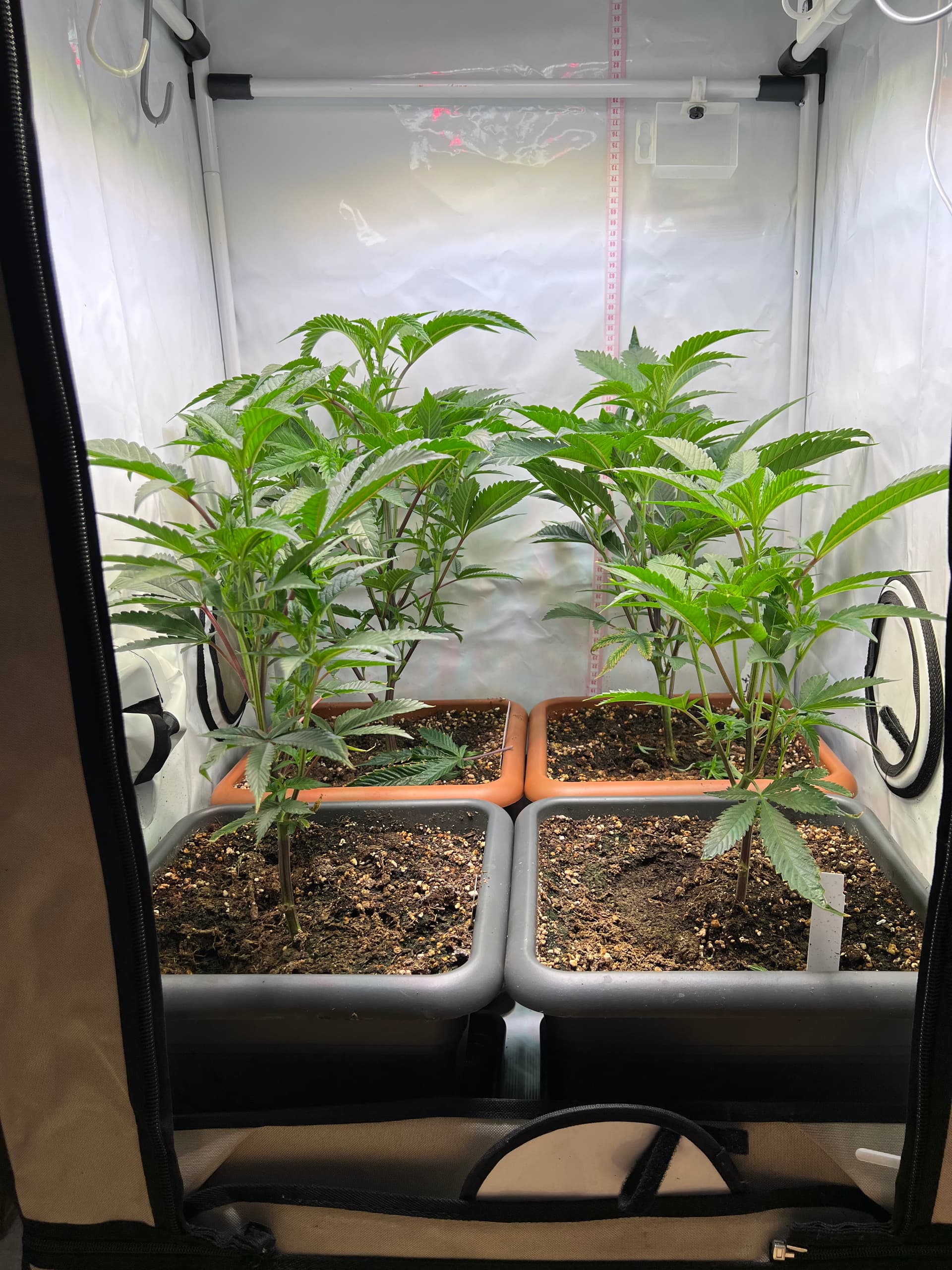 die vier neuen sind dann in Ihre Endpötte gekommen. Warum direkt in die? Weil ich mit dem Format 30x30x30 gute Erfahrungen gemacht habe. Volumen max ausgenutzt und die Topfgröße lässt die Pflanzen nicht zu hoch werden. Zumindest bis jetzt meine Erfahrung.