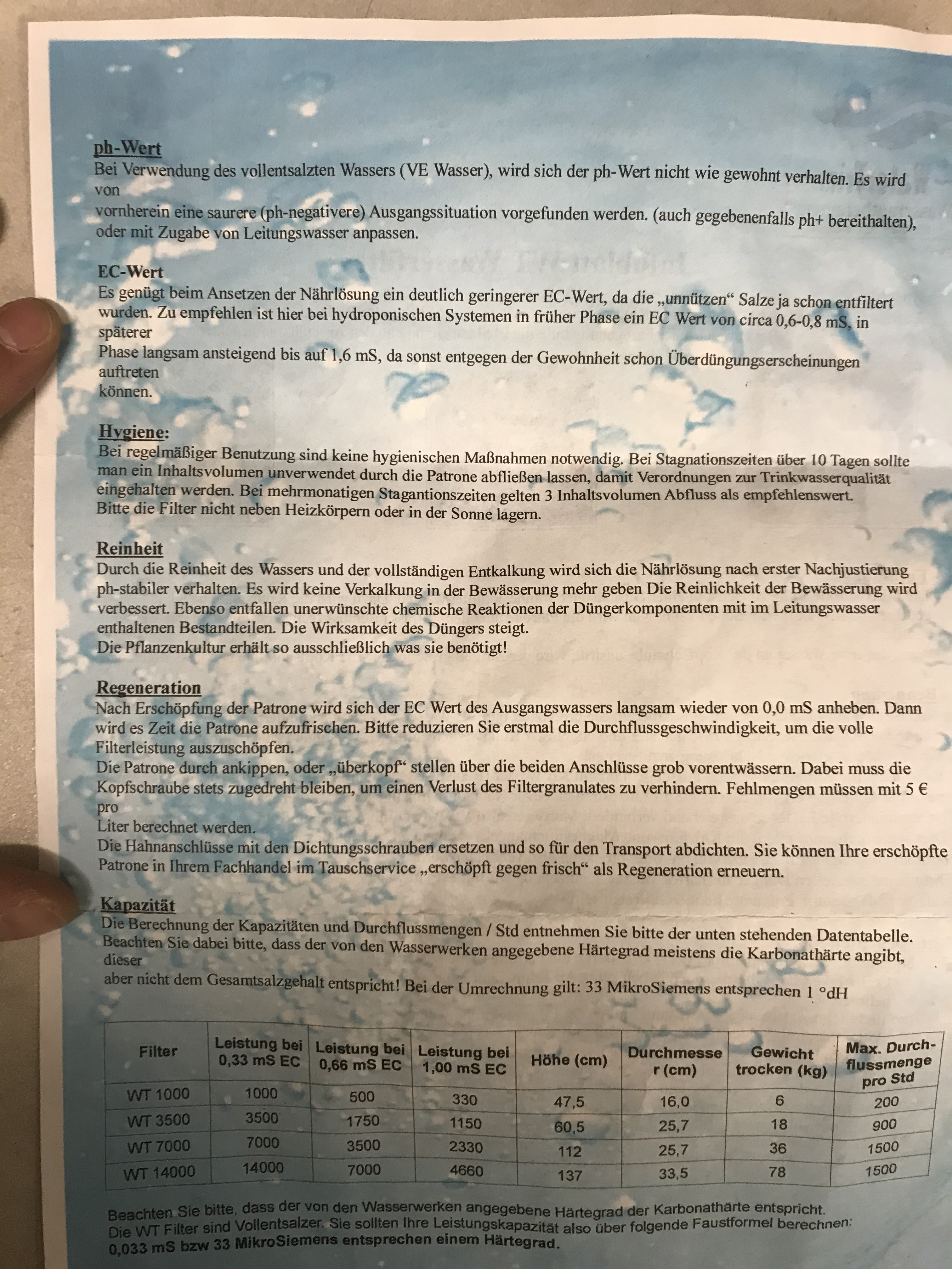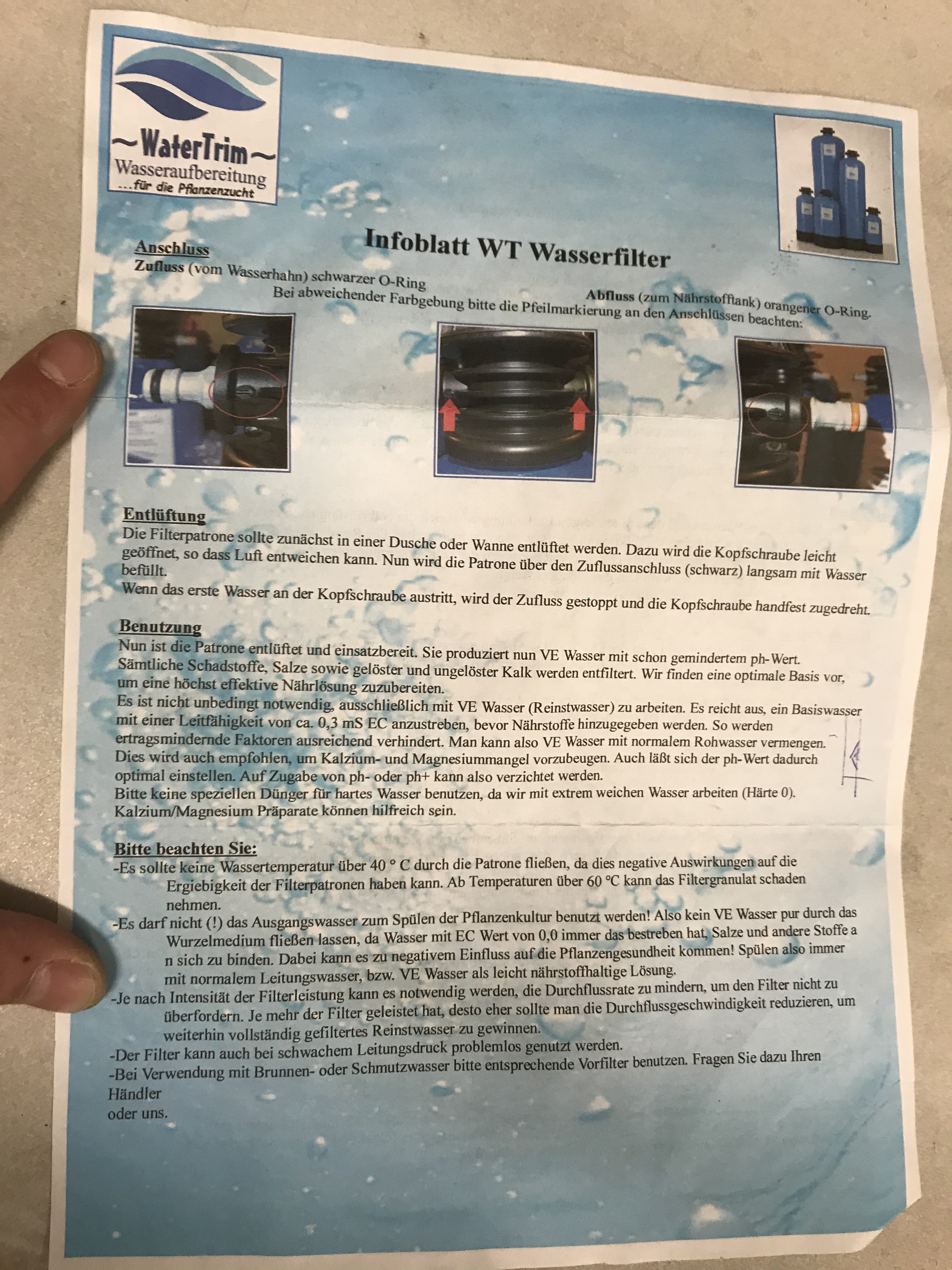 Ich habe den Watertrim, kann ich nur empfehlen!!! Die Kartusche hält lange und man kann die für wenig Geld immer tauschen. Ich habe den Watertrim direkt am Hahn angeschlossen und habe fast kein Druckverlust:muscle:t2: Der Ec liegt bei 0-1 ppm. Ich habe mir einen angeschafft da mein Leitungswasser ein AusgangsEC von 360-380 ppm hat. Hatte nur Probleme … jetzt mische ich es immer so das es einen AusgangsEC von 200 ppm hat. Ich messe mit einem ADWA AD 31. LG hoffe konnte helfen