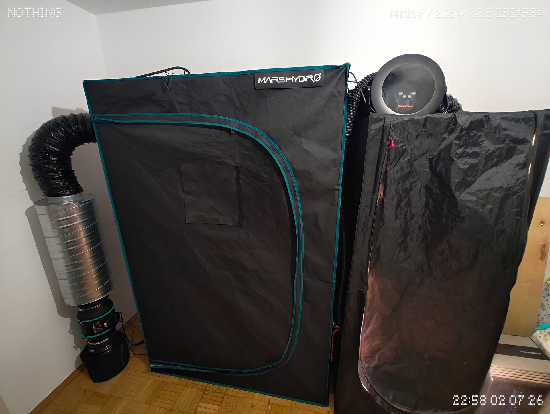 Wie das ganze momentan funktioniert? Ganz einfach! Sagen wir das kleine Hydroshoot ist Zelt A und MarsHydro Zelt B. Die Zuluft (Spiderfarmer Heater) bläst die gewärmte Frischluft in Zelt A. Von Zelt A geht dann ein Alu Rohr rüber zu Zelt B. In Zelt B sind beide Luftröhren mit einem Netz versehen damit keine Insekten und sonstige Fremdkörper in die Lüftung geraten. Dann geht von Zelt B ein gedämmtes Rohr zum Schalldämpfer. Dieser ist mit ner Gummimuffe mit dem Lüfter verbunden. Dieser ist wiederrum mit einer Gummimuffe mit dem Aktivkohlefilter verbunden. Somit saugt der Überdimensionierte Lüfter die Luft aus beiden Zelten und das funktioniert echt gut! Ich muss allerdings noch den Luftbefeuchter entfernen. Die Feuchtigkeit vom Gießen wird reichen.
