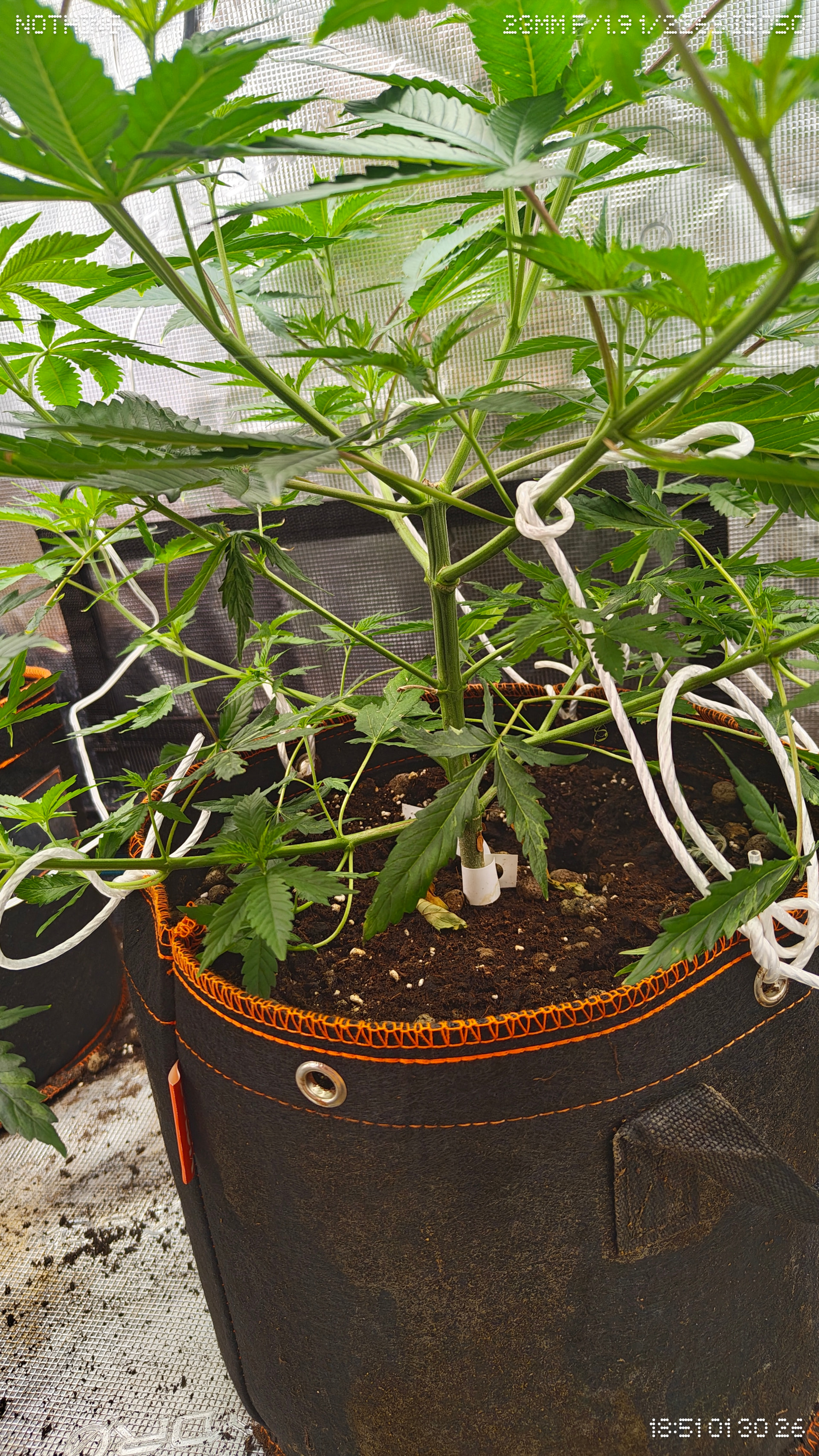 Vor etwas mehr als 2 Wochen habe ich die Dame getoppt. Vor 5 Tagen habe ich LST angewendet und die Äste nach unten gebunden. In den letzten 5 Tagen habe ich manche Äste noch etwas weiter nach unten gebogen. Nun folgt der Zwischenstand