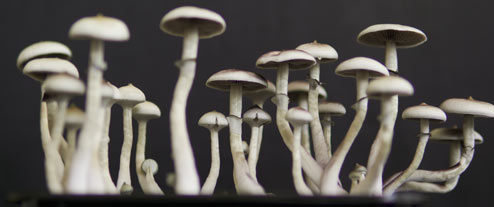 Lässt man die Pilze im komplett dunklen wachsen, wachsen diese wild durcheinander, wie ein Knäuel.