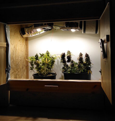 Bei einem kleinen Geldbeutel bietet es sich an das Mini Growzelt im Kleiderschrank zu verstecken. In dem Fall sollte man sich Gedanken um den Luftaustausch machen. Entweder der Schrank muss durchgehend offen bleiben (und nur bei Besuch geschlossen werden) oder man sägt Öffnungen für Zuluft und Abluft in den Schrank.