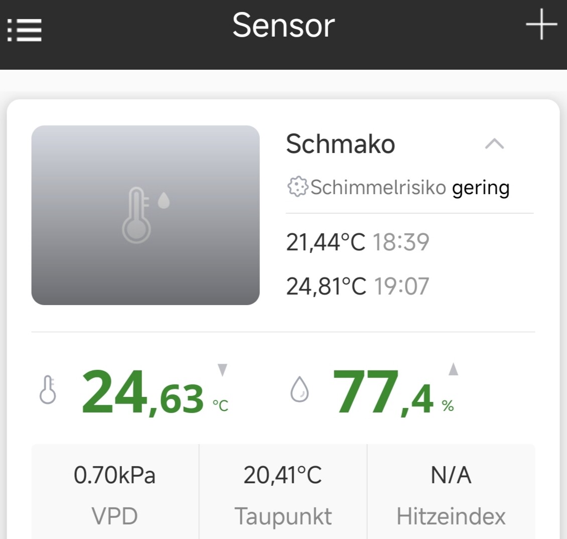 Die Werte sind gerade etwas schwierig zu messen.Der Luftbefeuchter ist auf 65%eingetstellt . Ein Hygrometer hängt ziemlich nah am Befeuchter das andere auf einen Topfrand. Denke die gesunde Mitte wird es sein.