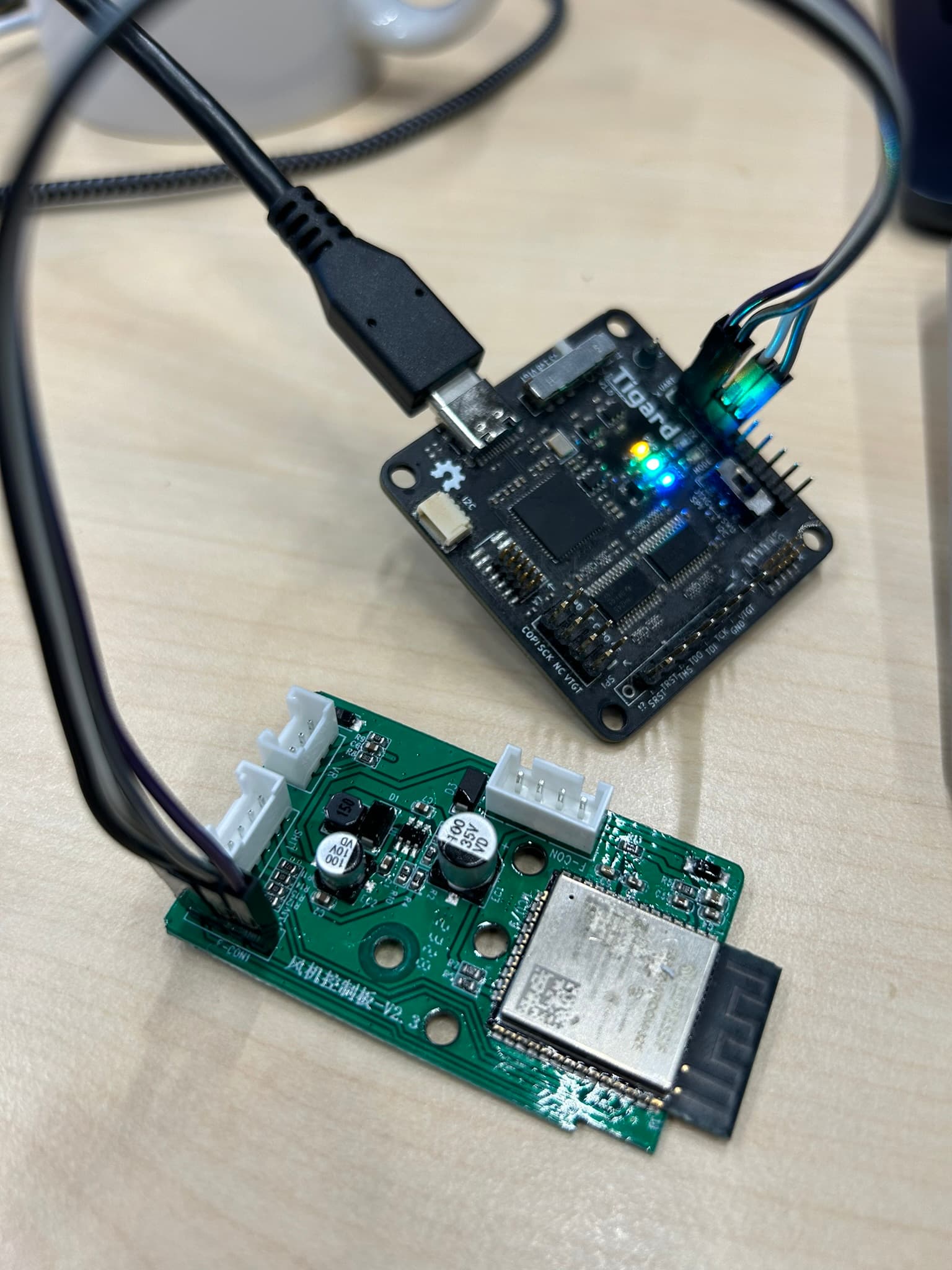 F-CON1 rechts unten ist dankenswerter weise sogar beschriftet: Von oben nach unten +3.3V, TX, GND, RX. Das ist der UART, über den man dann auch esphome flashen kann.