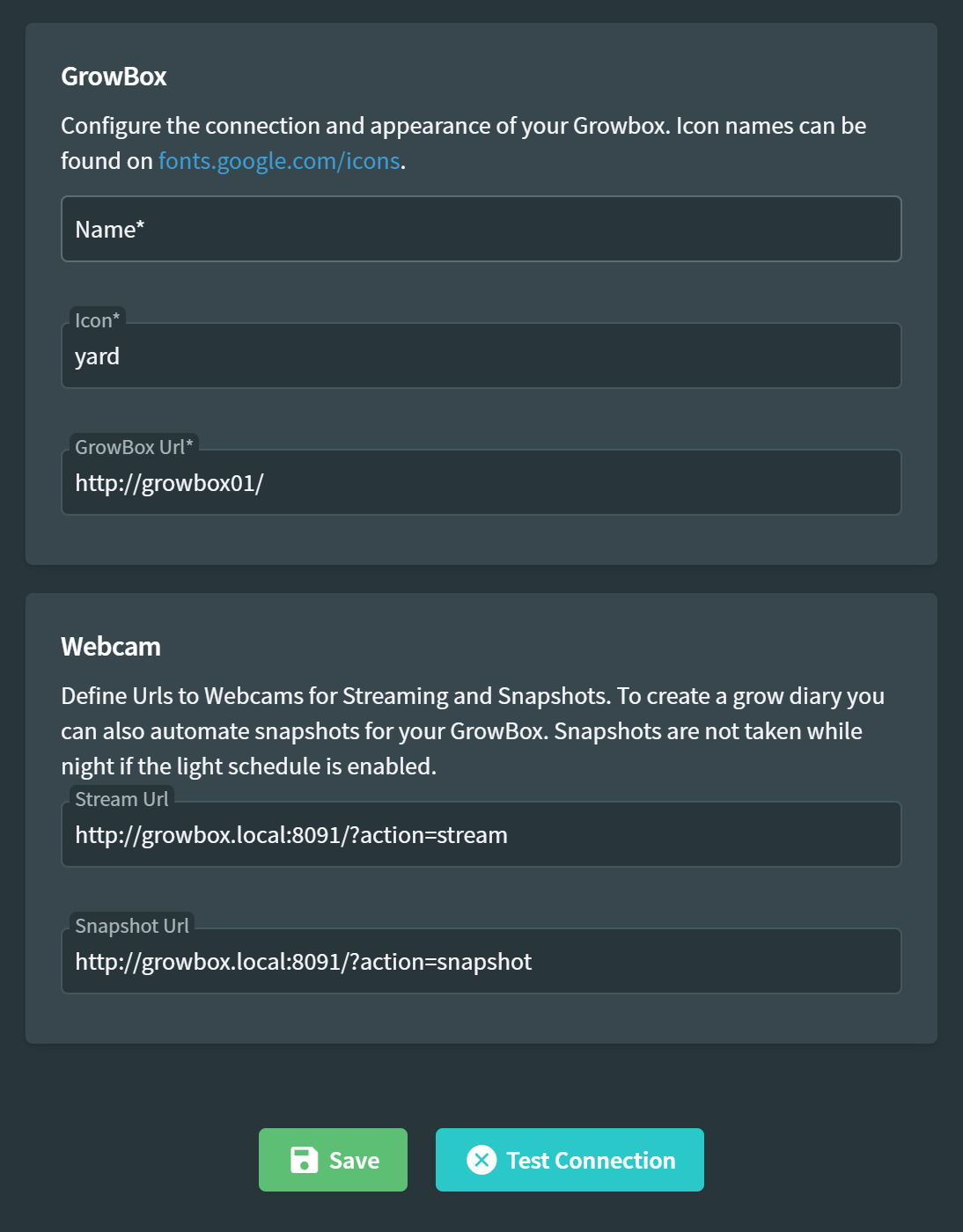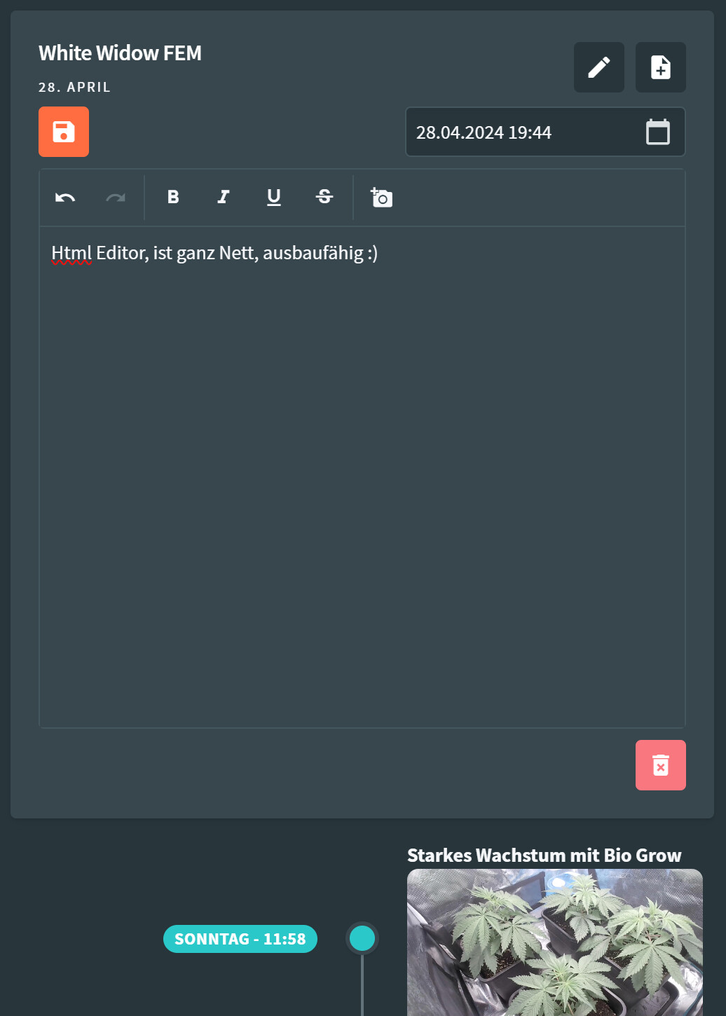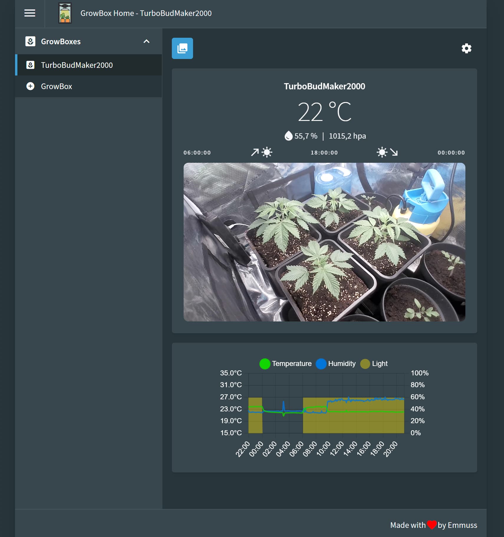 Sieht ja auch mega interessant aus, ich hab mich am Wochenende auch dazu entschieden das der ESP für eine Website zu klein ist und ich wollte mehr features bauen können, mehr Sensor daten verwalten, kurzer Hand hab ich dann einen RaspberryPi genommen und mittlerweile ein Docker Image und eine Compose die den GrowBox-Server bereitstellt PGSQL, Webcam streams, aspcore backend, blazor frontend. Die Software ist konzipiert mehrere GrowBoxen zu verwalten. Der Diary Mode legt automatisch Schnappschüsse in ein konfigurierbares Verzeichniss (bei mir das Media NAS). Sensordaten werden in einer sql tabelle retained, alles mit Rest-Apis verwaltbar. Hier mal ein paar Screenshots: