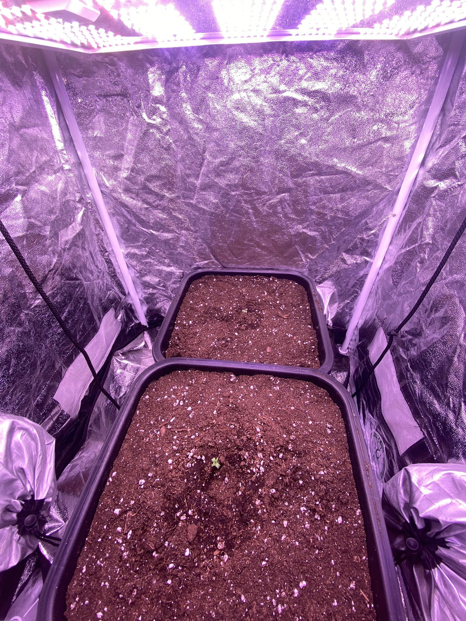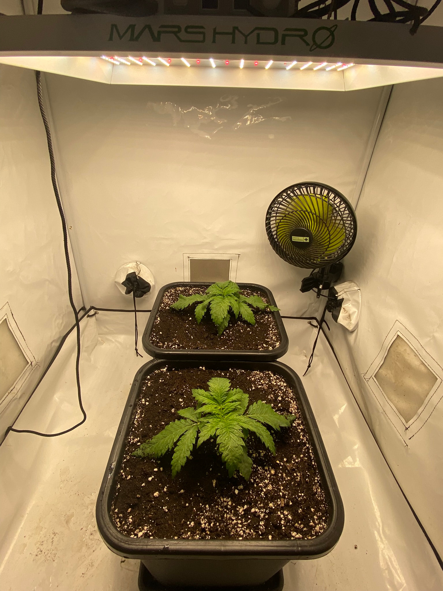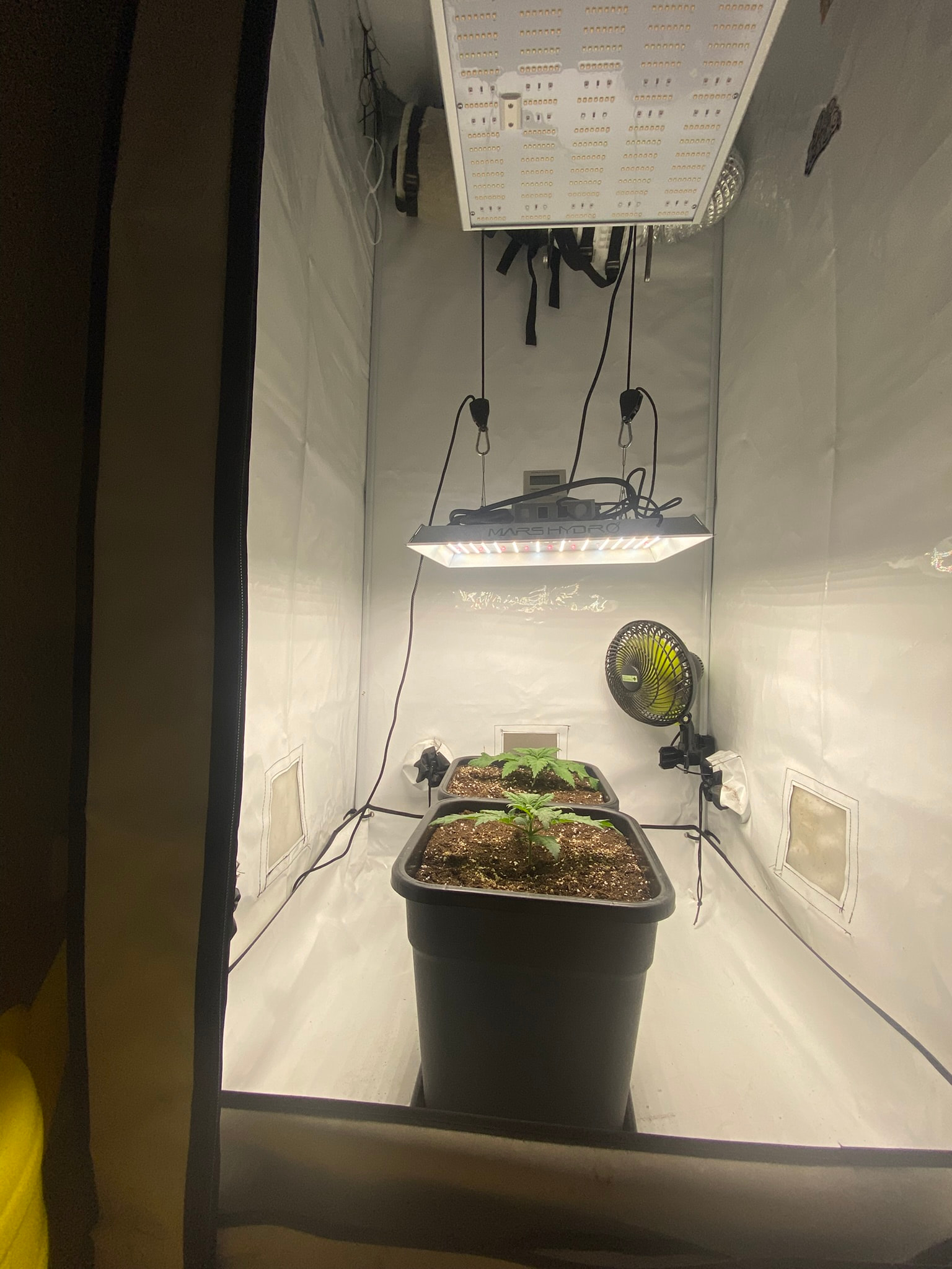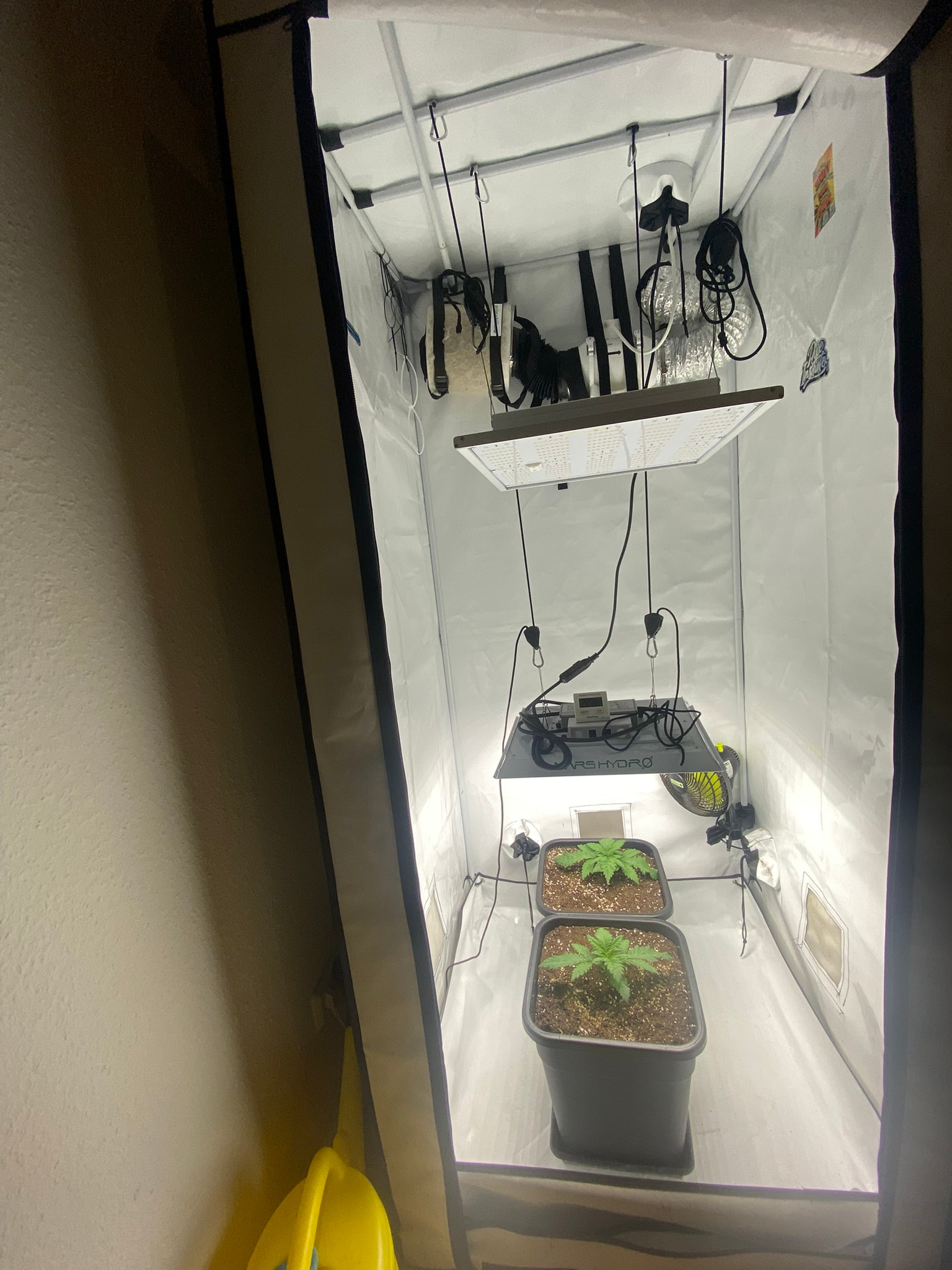 Außerdem Umzug ins 80x80 Tent, die Lampe Mars Hydro (150 Watt) läuft seit 5 Tagen auf 50%. Die Caluma Force 150 Watt würde ich dann zur Blüte mit einschalten.