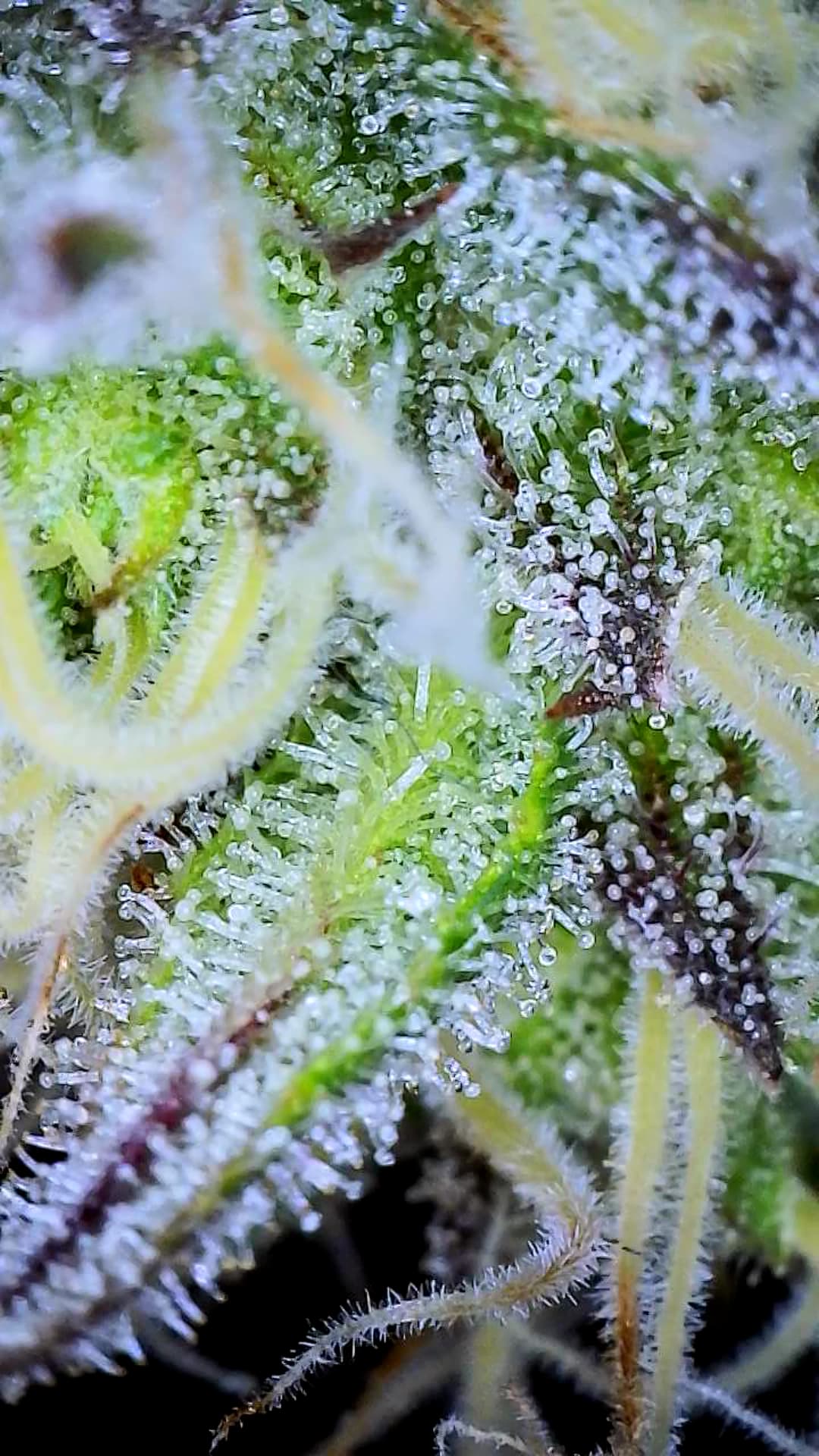 Alle drei sind jetzt in der Blüte. Bei der Royal Highness zeigen sich die ersten Trichome, es glitzert schon ganz leicht und der Stretch ist wohl auch ziemlich durch. Die White Widow scheint tendenziell kein Interesse am Stretchen zu haben und die Blueberry OG holt kräftig auf. Gut möglich, dass sie die Royal Highness noch überholt.