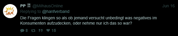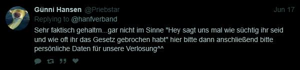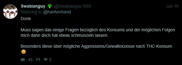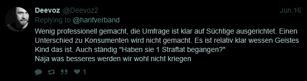 Aber ja – ist deine Sicht der Dinge, und sei dir unbenommen. Ich sage nur, dass es objektiv betrachtet eine der besseren Umfragen ist. Nicht zuletzt, weil sie solche Sachen, mit denen sich viele Konsumenten zusammen mit der Teillegalisierung selbst in ein schlechtes Licht gerückt hätten, weggelassen haben ![]()
