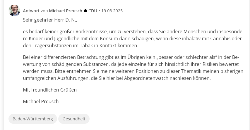 Herr Preusch von der CDU auf die Frage „In wie weit schade ich mit 51 Jahren anderen Menschen wenn ich ab und zu Cannabis konsumiere?“