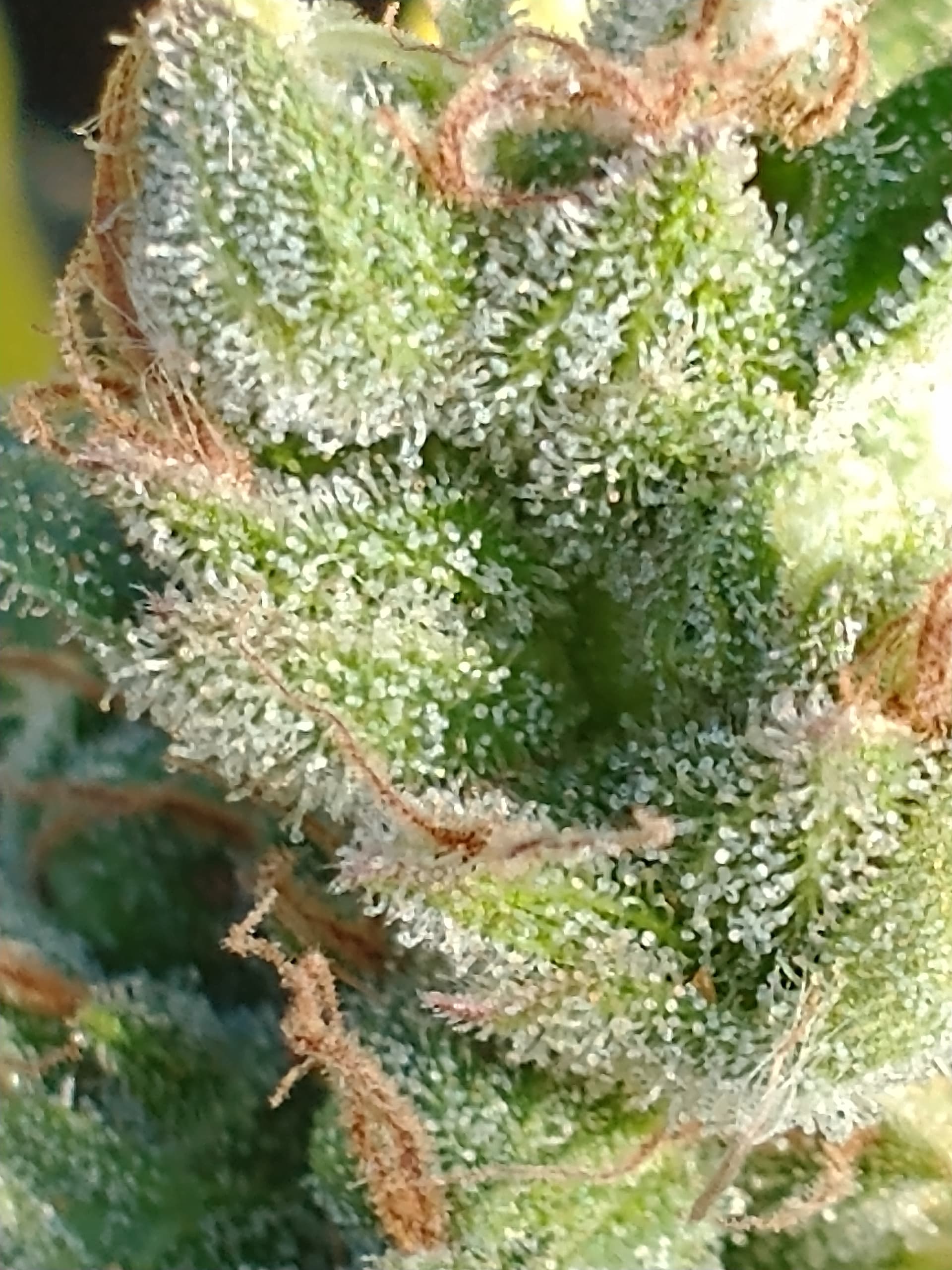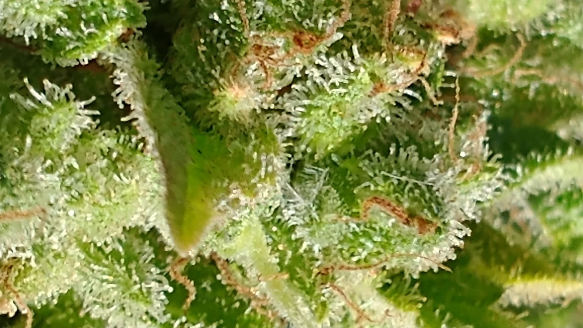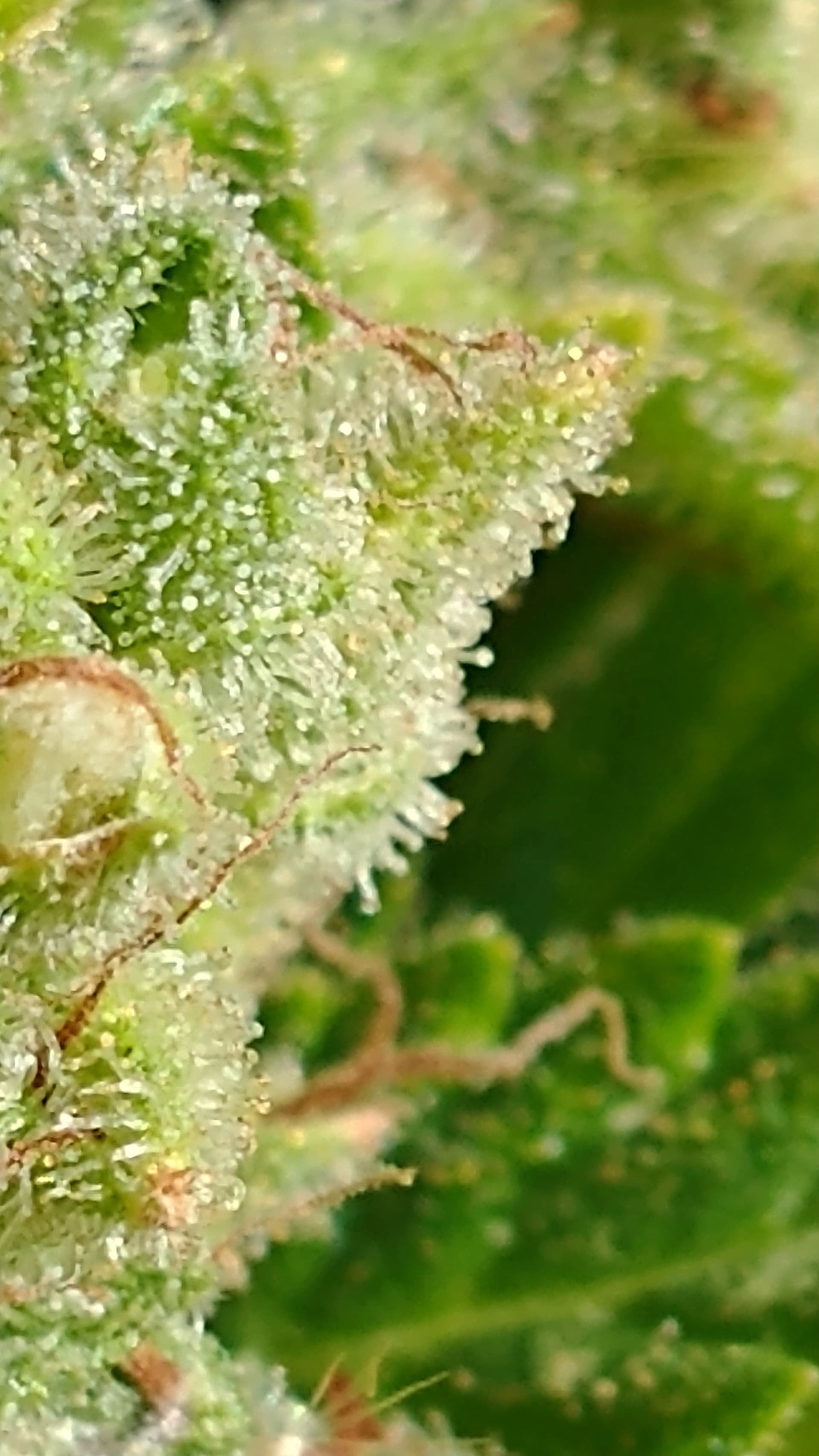 Man sagt ja, mit mehr Bernstein wird die Wirkung entspannender. Aber wenn die Trichomenköpfe ausgebildet sind, viele Teile sich dabei auch krümmen, und schon etwas Bernstein auftaucht, sind wir wohl in der reifen Phase. Also wirklich zu früh ist was anderes; aber Geschmackssache, wann man nun die Schere ansetzt.