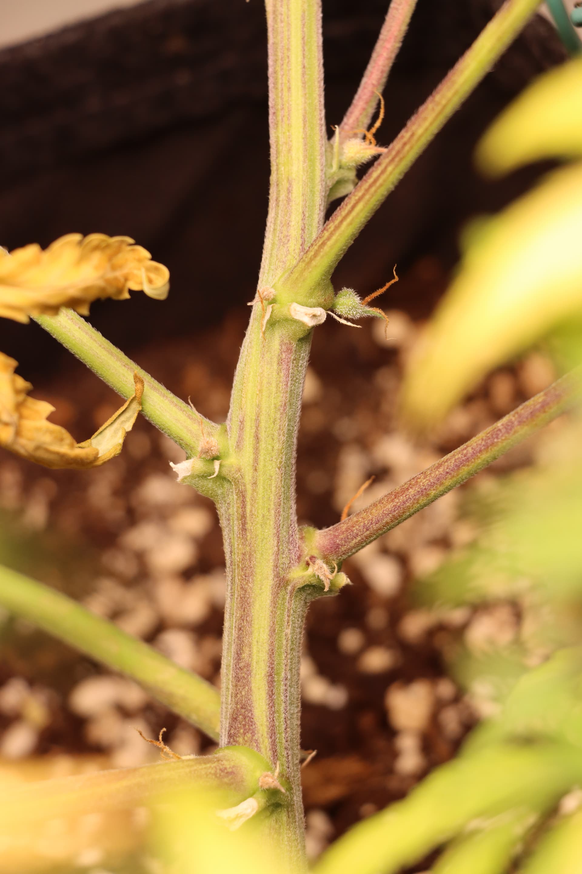 Die erste Vermutung war, auch aufgrund der „verbrannten“ Blattsptizen und der lila-färbung der Zweige und des Haupttriebes Nährstoffbrand.