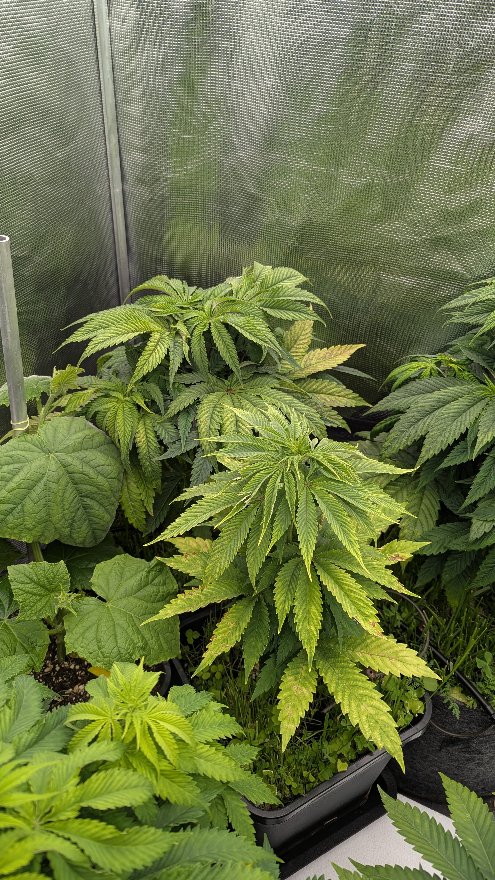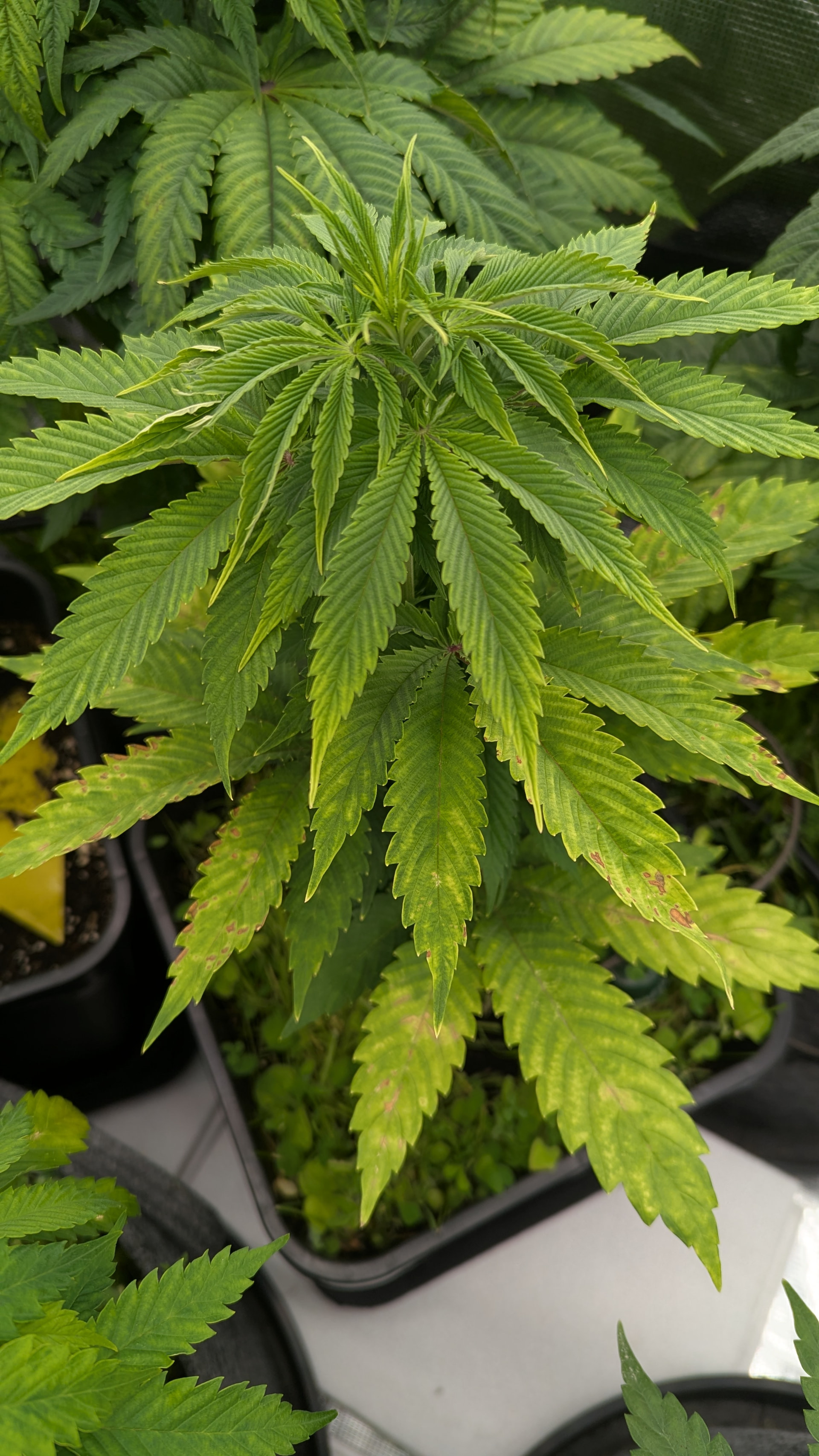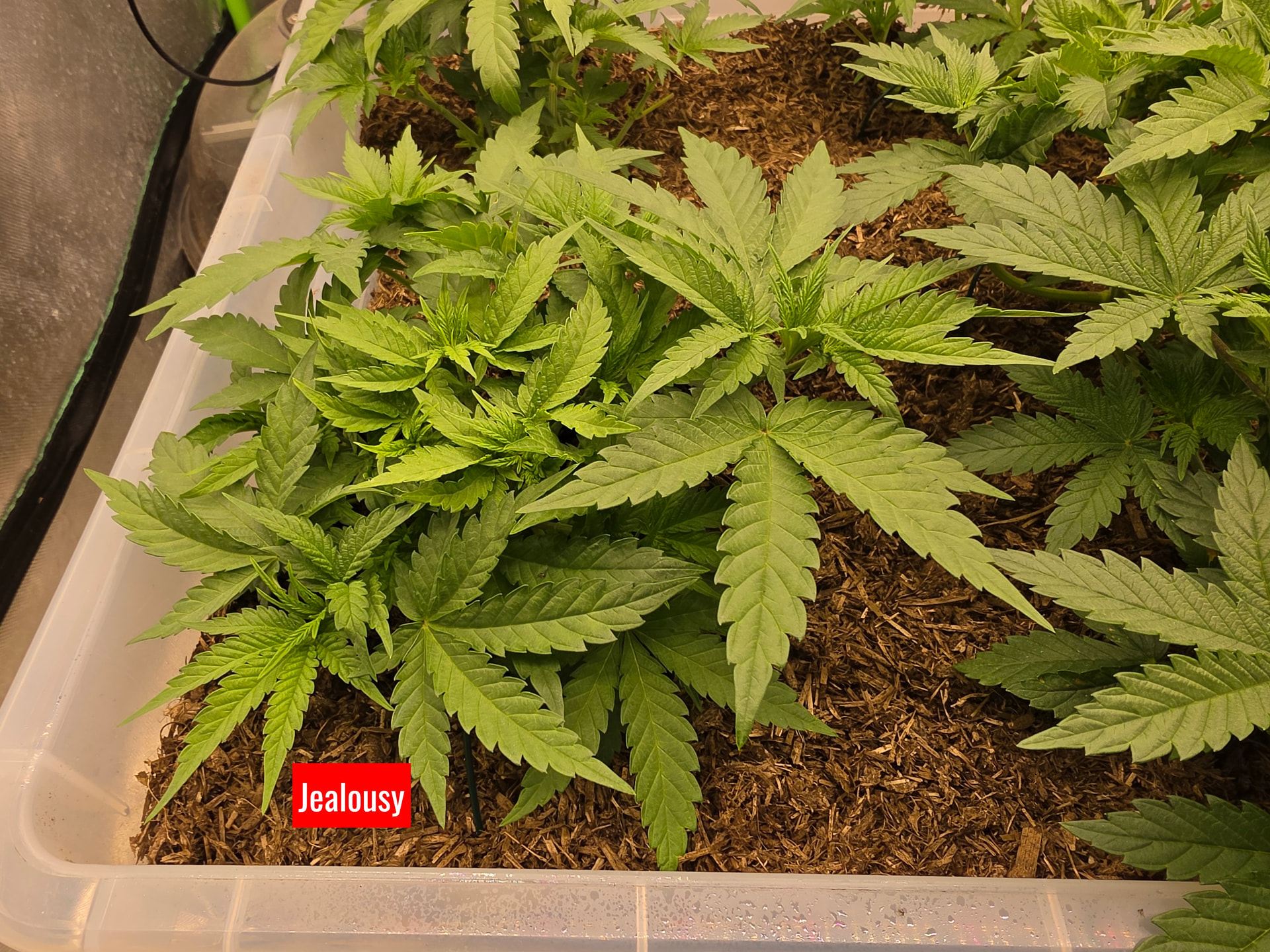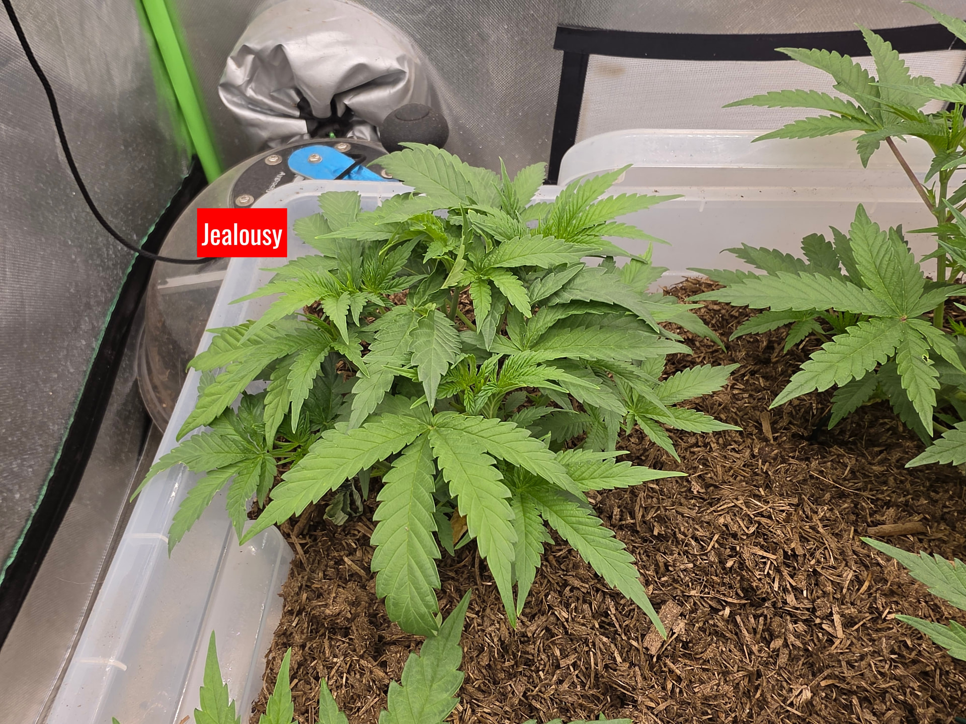 Die Blätter fangen an mehr Spannung zu bekommen, dafür schreiten die Mangelerscheinungen voran. Insbesondere bei der Hella Jelly deutlich an den unteren Blättern zu erkennen. Ich hatte über ca. 12 Stunden die Lichtleistung auch von 400 auf 500 angehoben, das war aber viel zu schnell erhöht und die Pflanzen haben mir signalisiert, das ist zu stressig. Bin jetzt auf 450 herunter und habe den Lampenabstand etwas erhöht. Vielleicht kann ich in ein paar Tagen nochmal versuchen auf 500 zu gehen, wenn die Erde richtig anfängt Nährstoffe auszuschütten. Bis dahin will ich die Pflanzen aber so wenig wie möglich stressen.