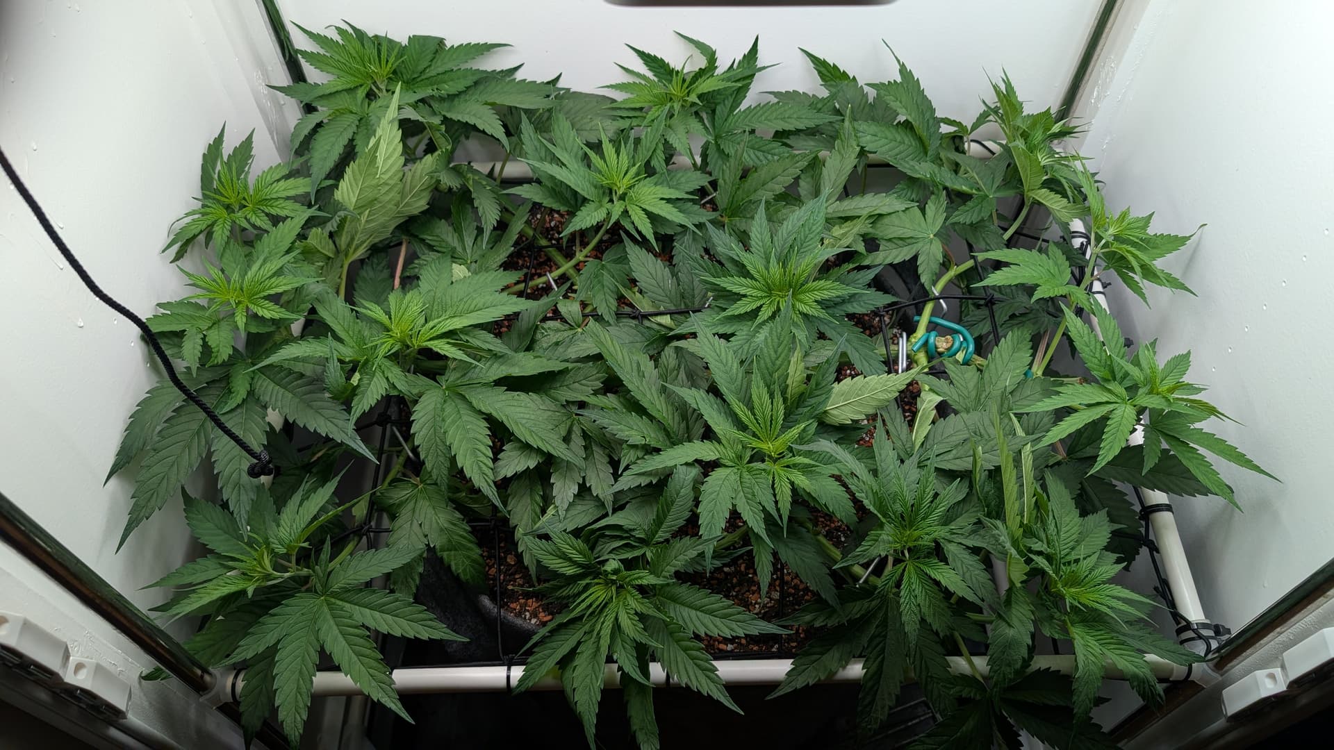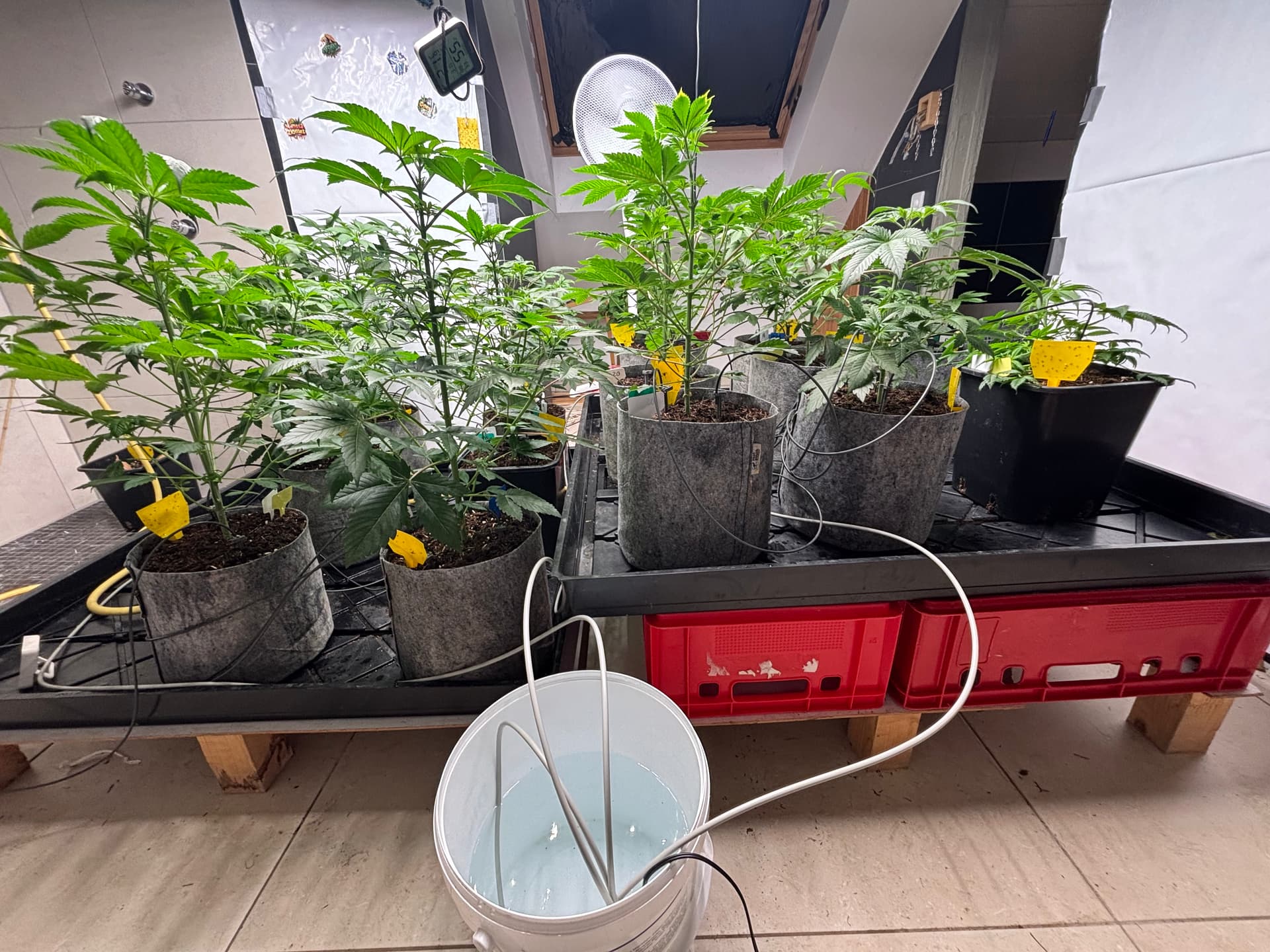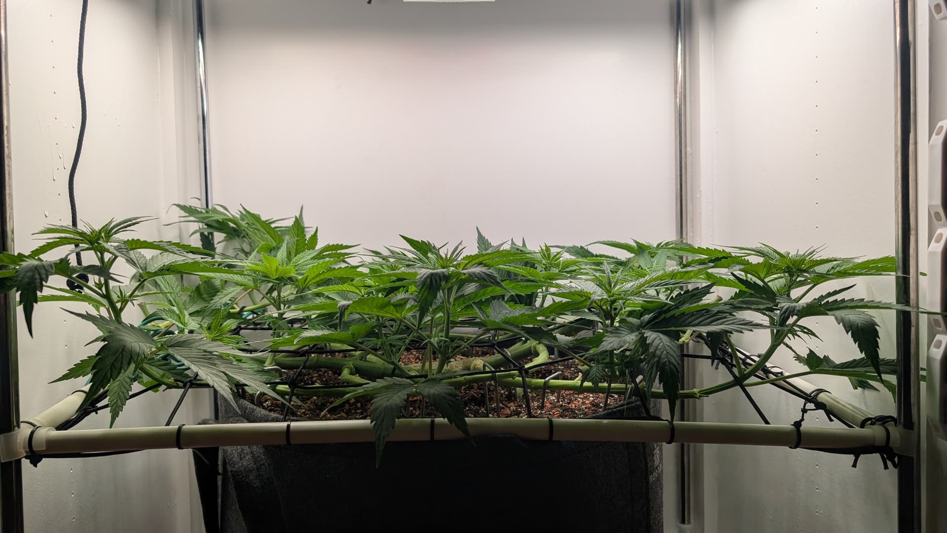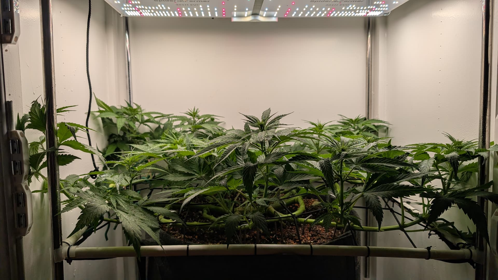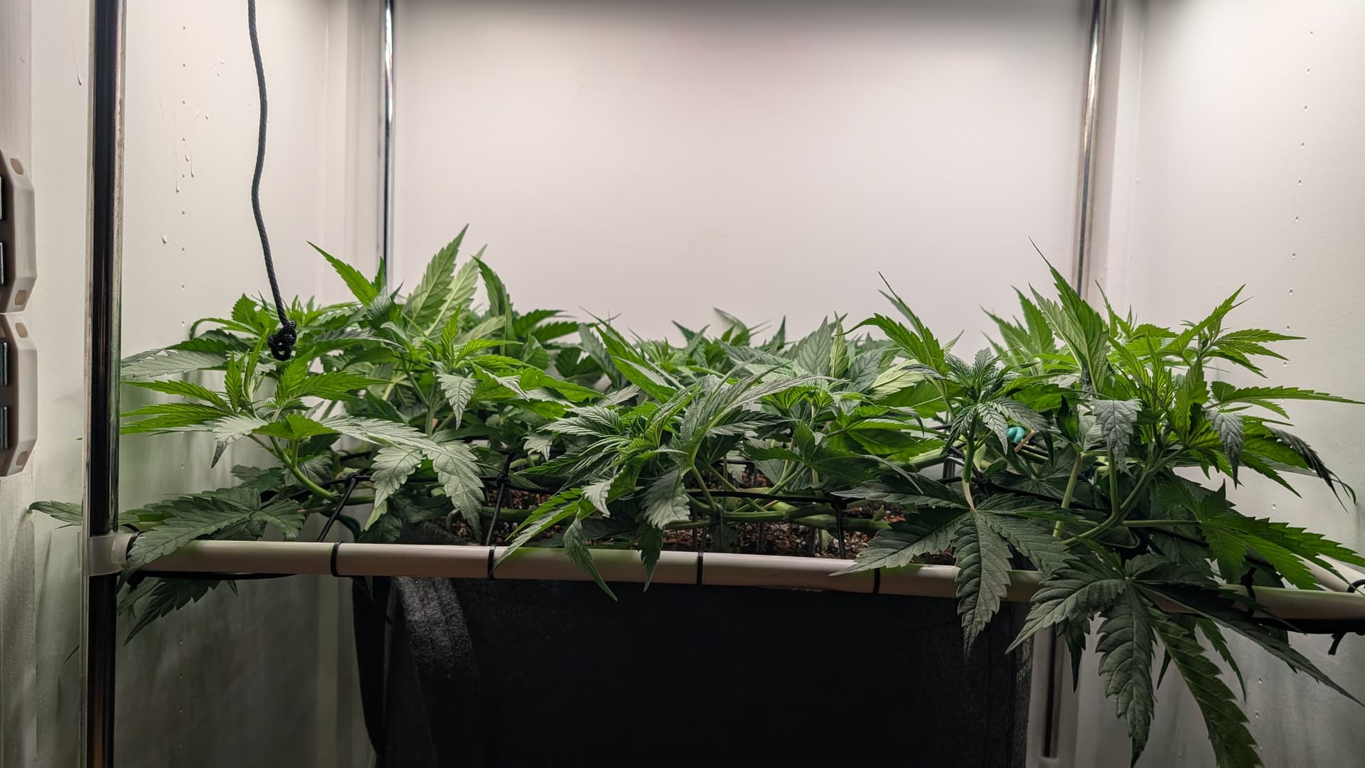 Das Licht steht aktuell bei etwa 980 µmol am Headbud und 660–680 µmol an der Seite, Autopot läuft im Wechsel zwischen 20 und 50 mbar, damit die Wurzeln aktiv bleiben.