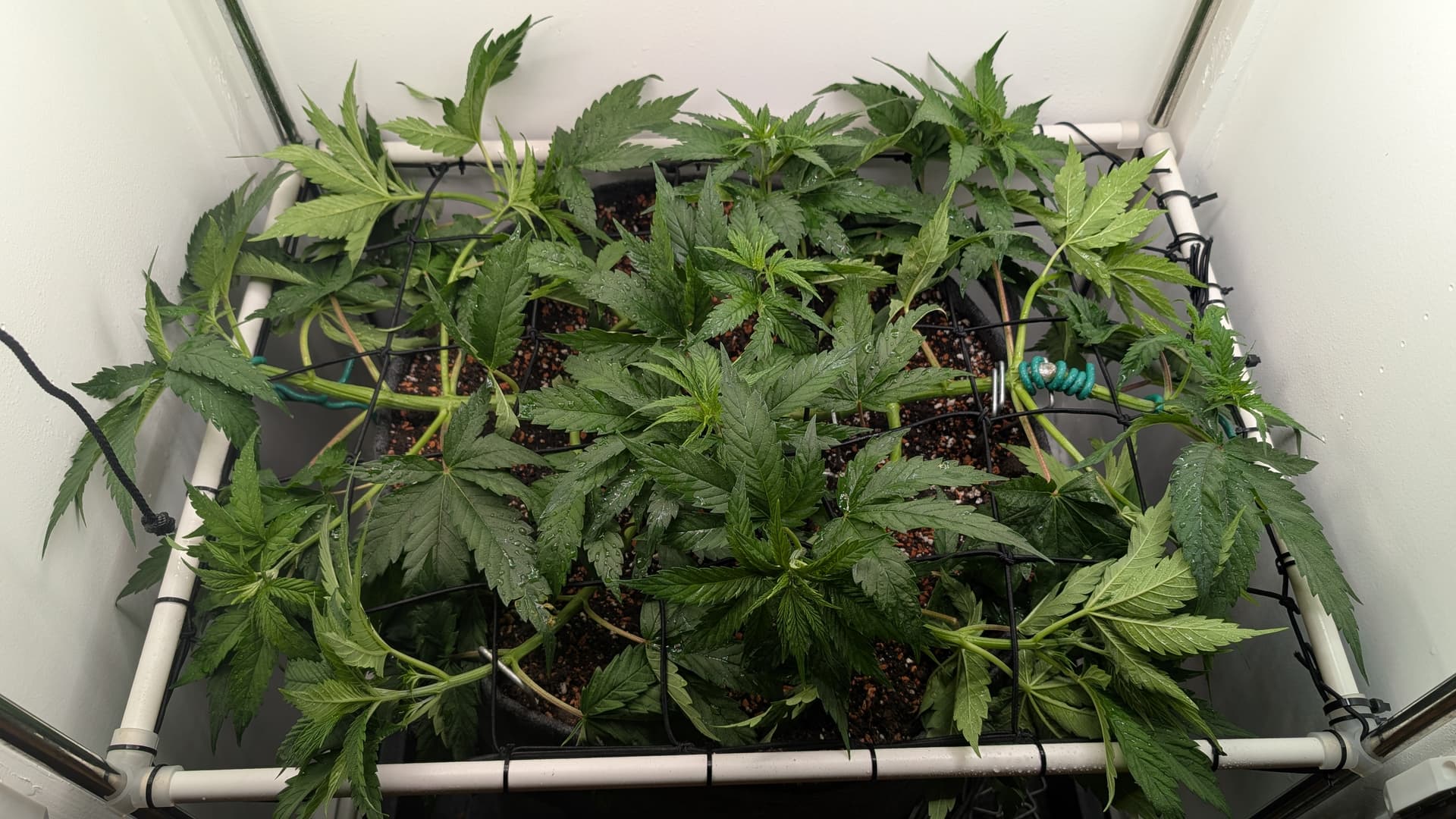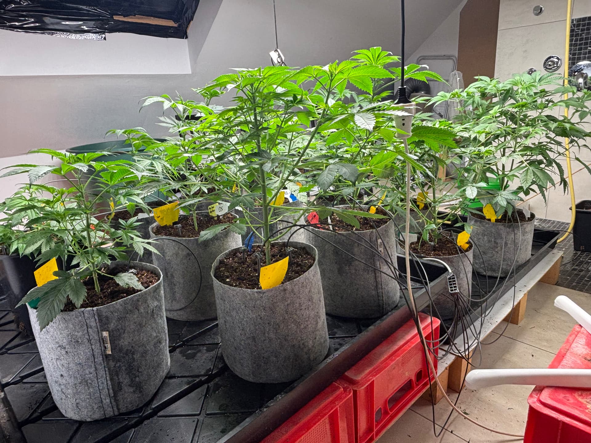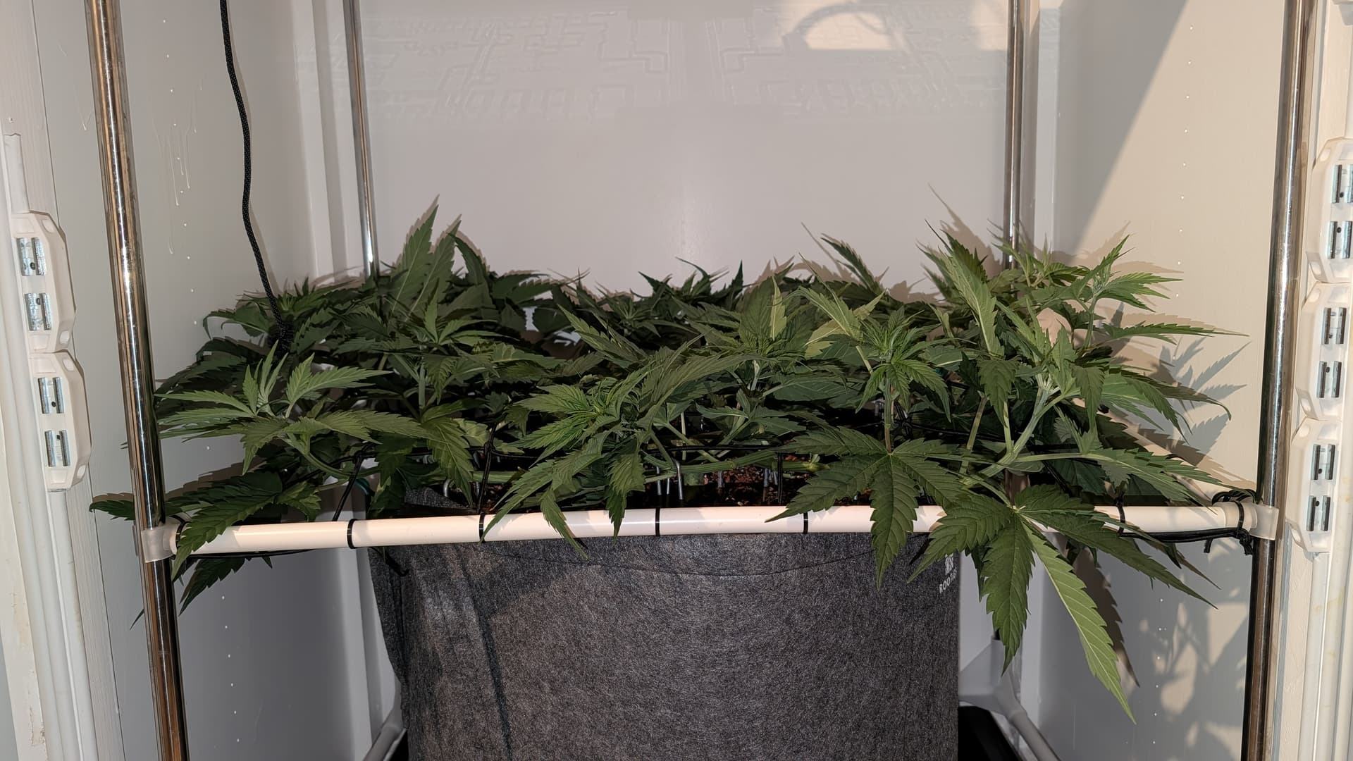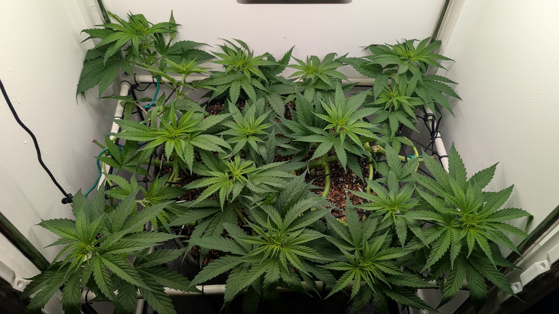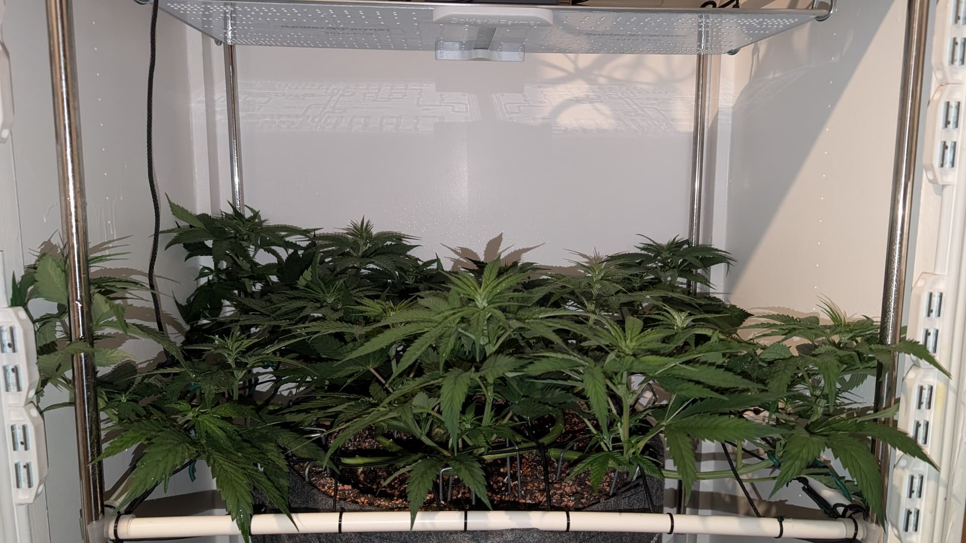 Das Licht steht aktuell bei etwa 980 µmol am Headbud und 660–680 µmol an der Seite, Autopot läuft im Wechsel zwischen 20 und 50 mbar, damit die Wurzeln aktiv bleiben.