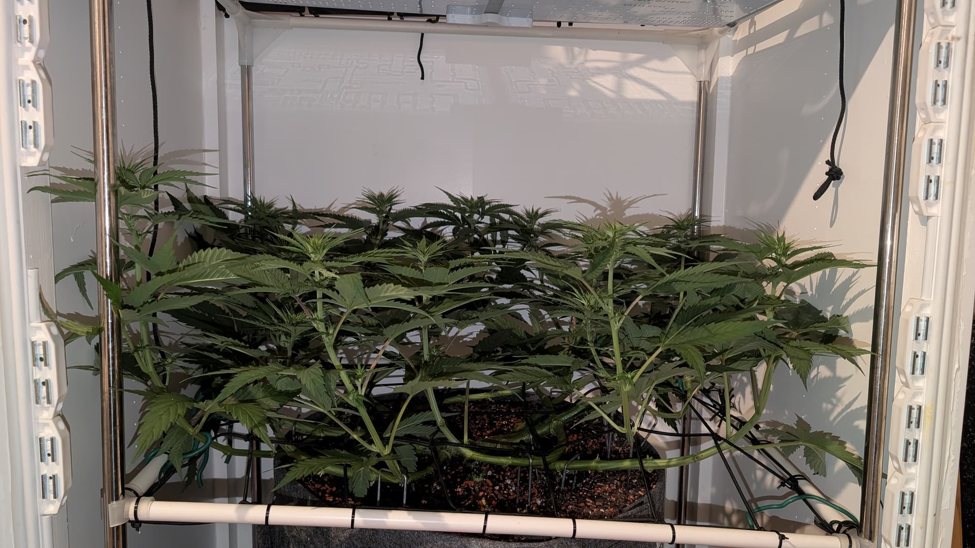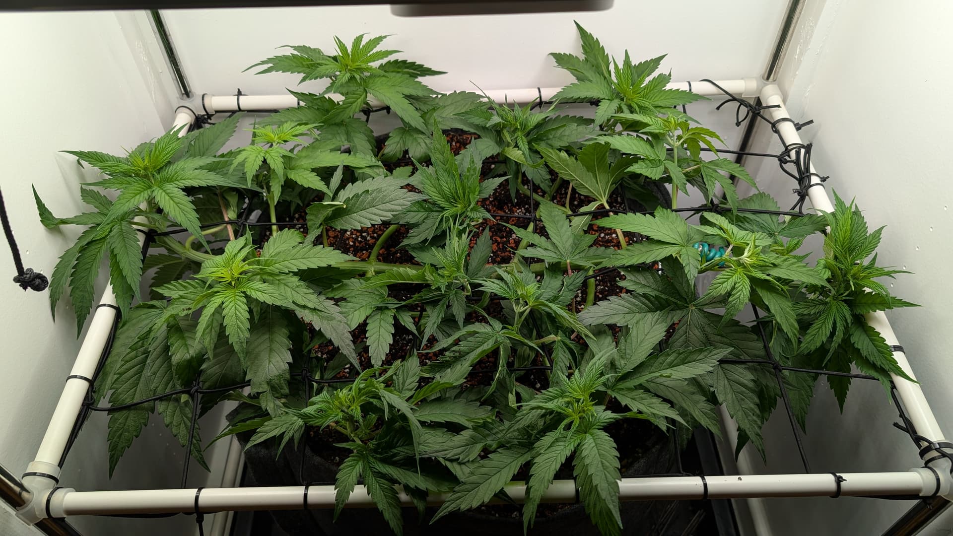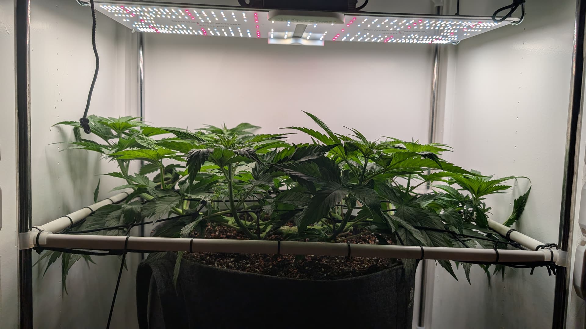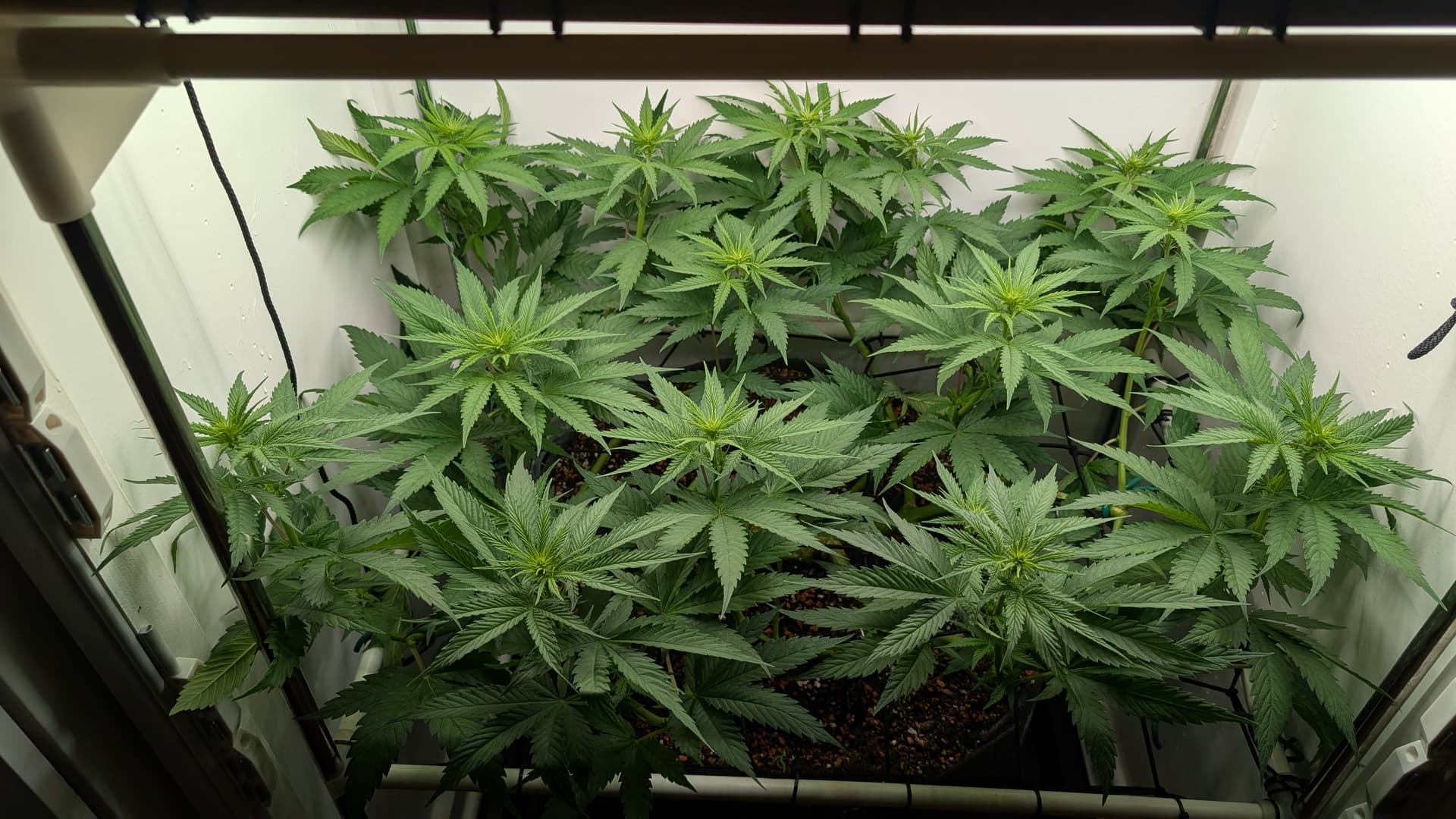 Das Licht steht aktuell bei etwa 980 µmol am Headbud und 660–680 µmol an der Seite, Autopot läuft im Wechsel zwischen 20 und 50 mbar, damit die Wurzeln aktiv bleiben.