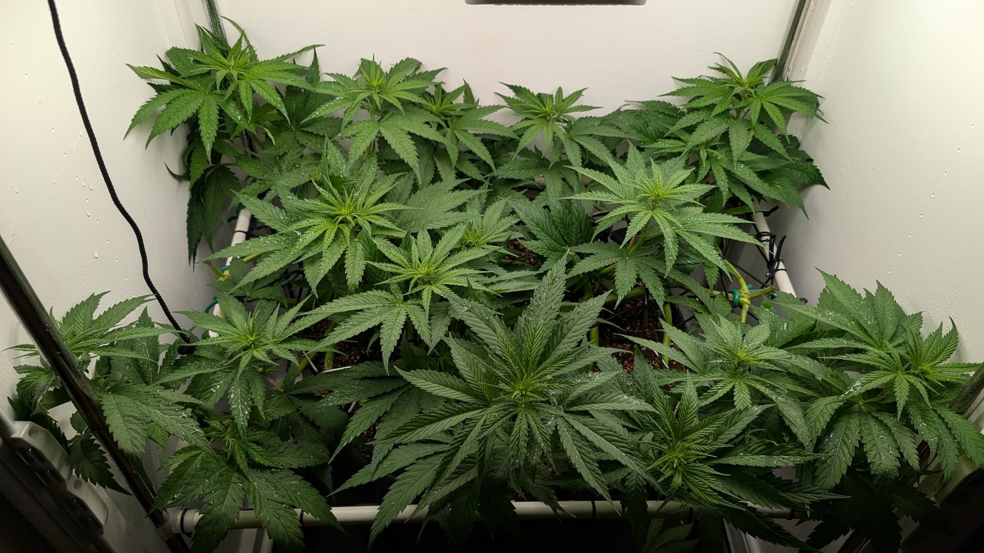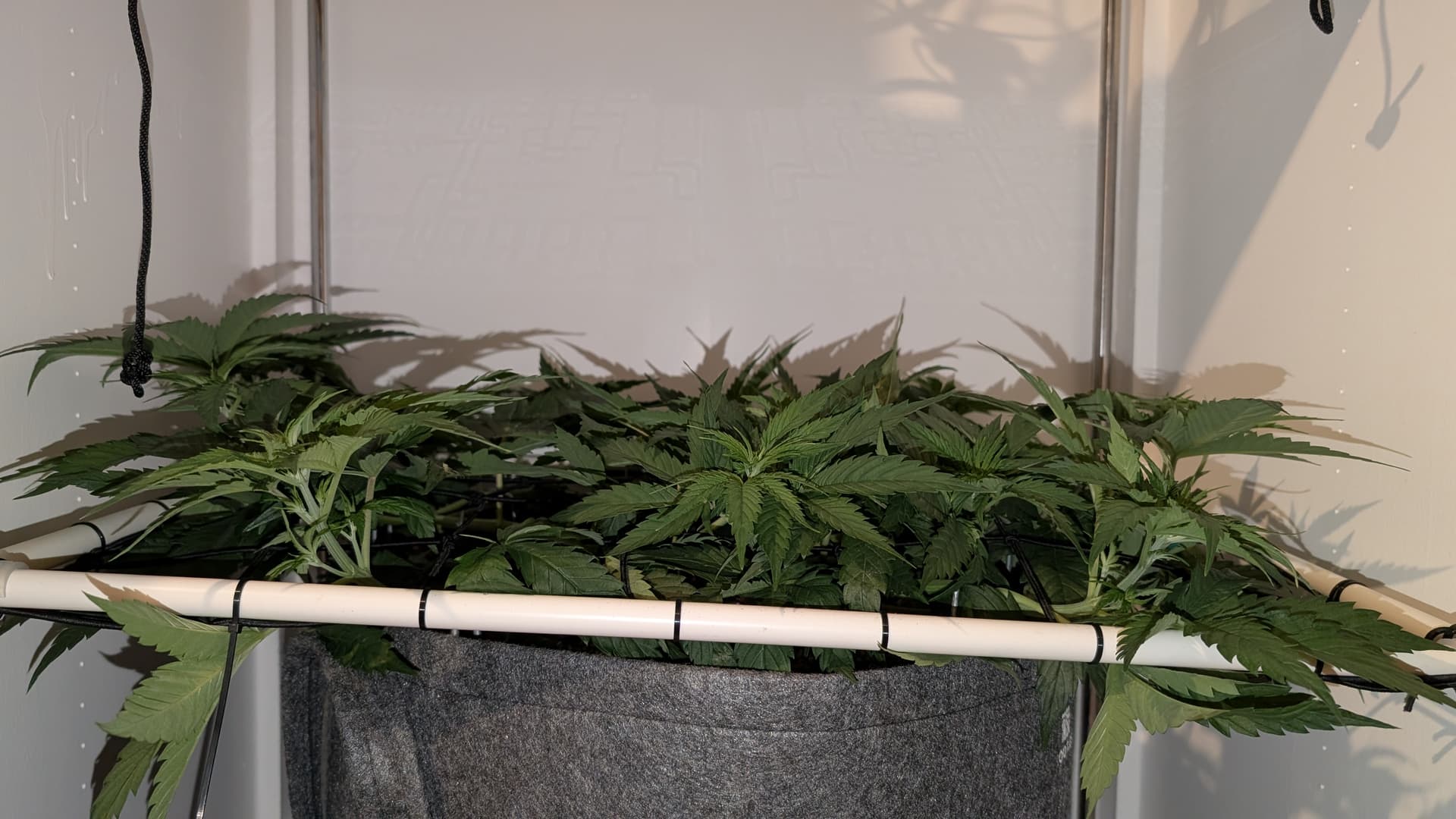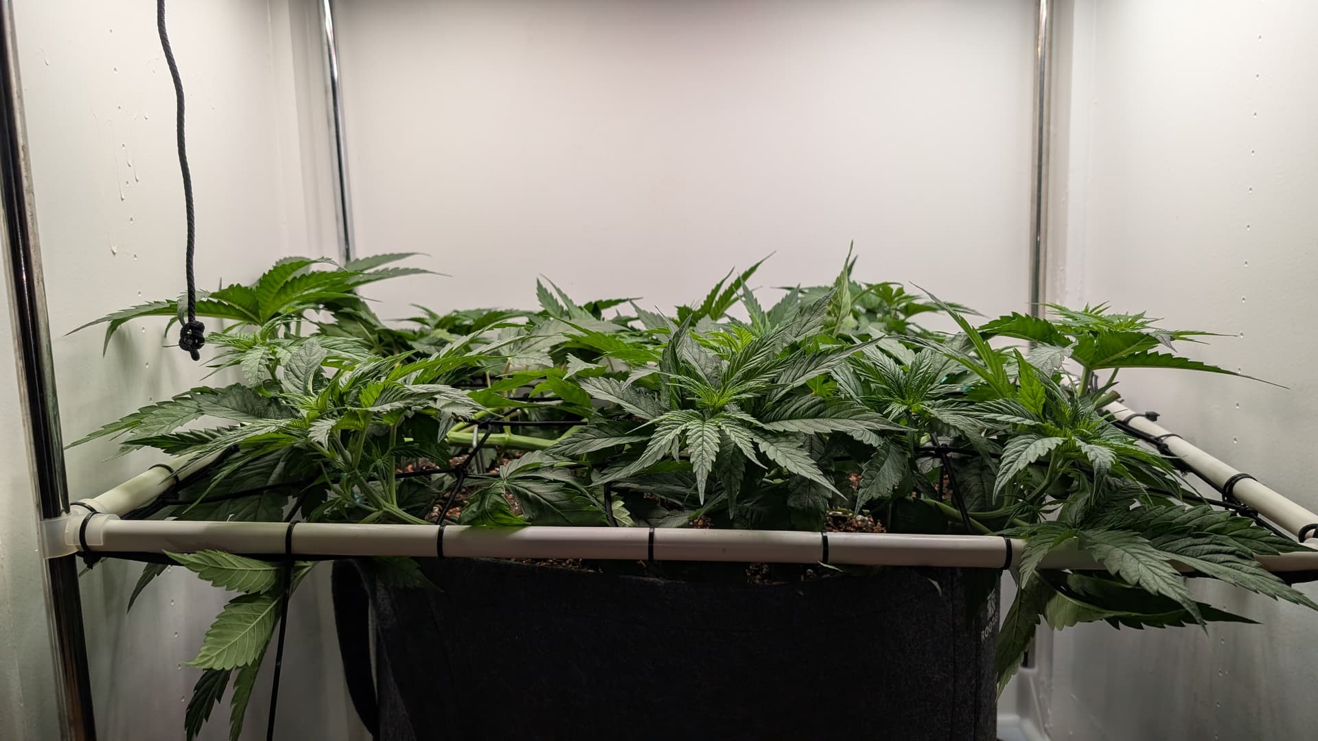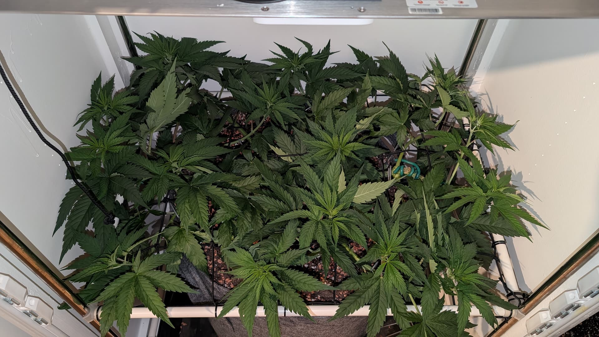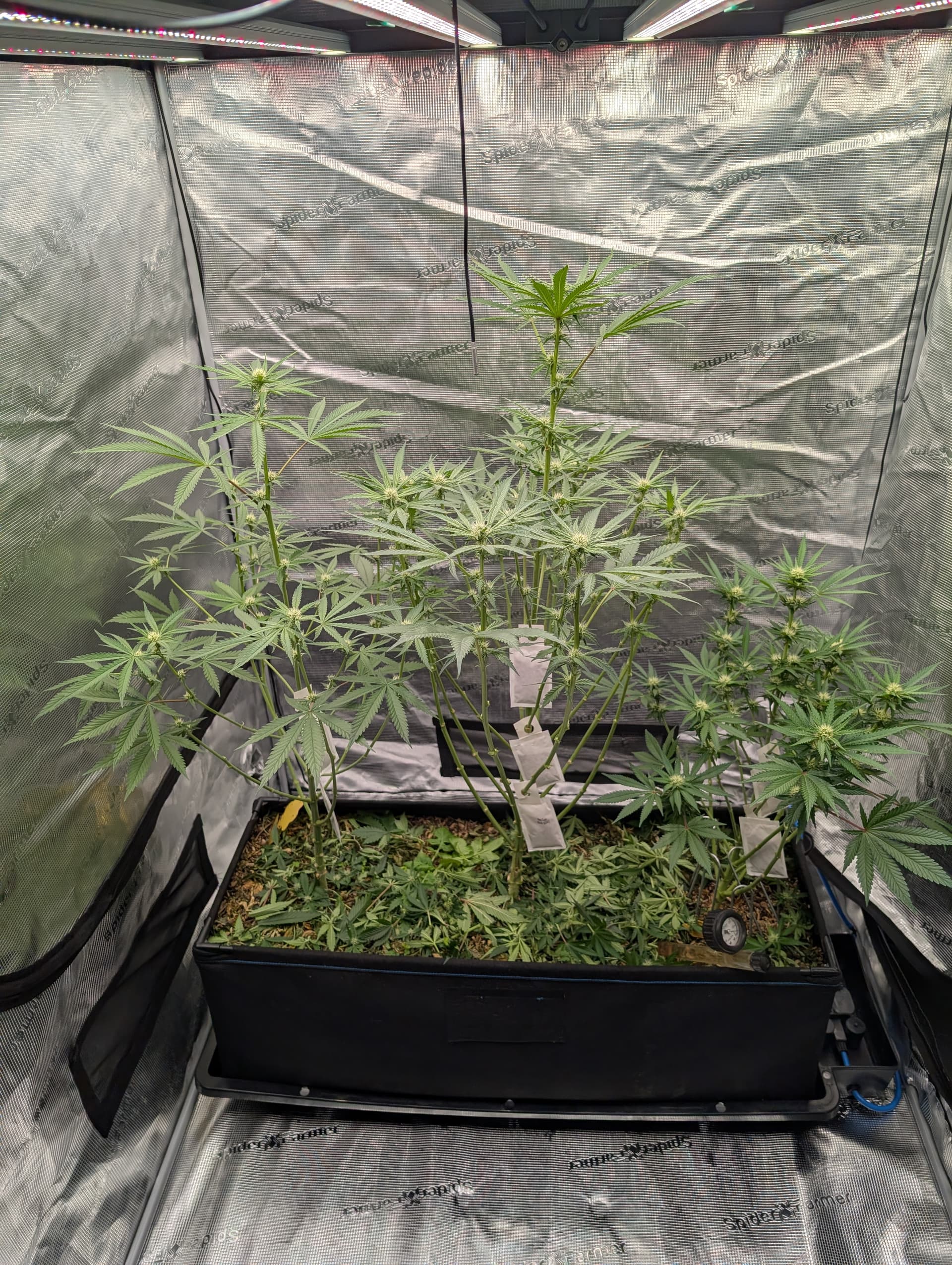 Das Licht steht aktuell bei etwa 980 µmol am Headbud und 660–680 µmol an der Seite, Autopot läuft im Wechsel zwischen 20 und 50 mbar, damit die Wurzeln aktiv bleiben.
