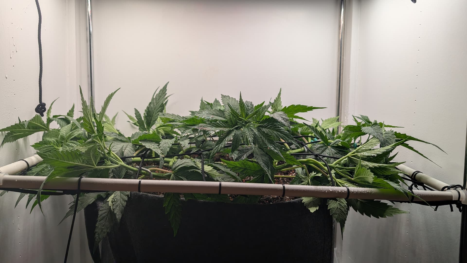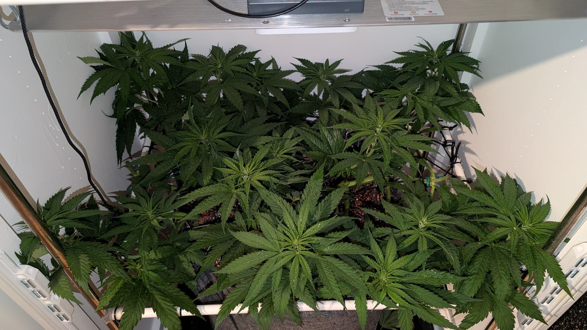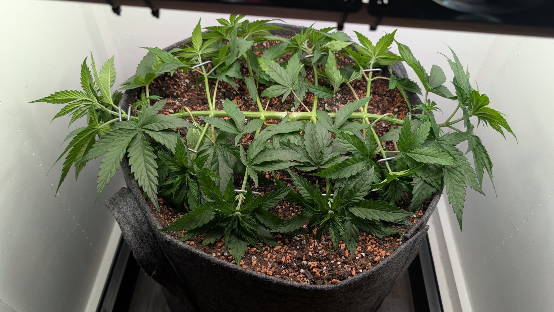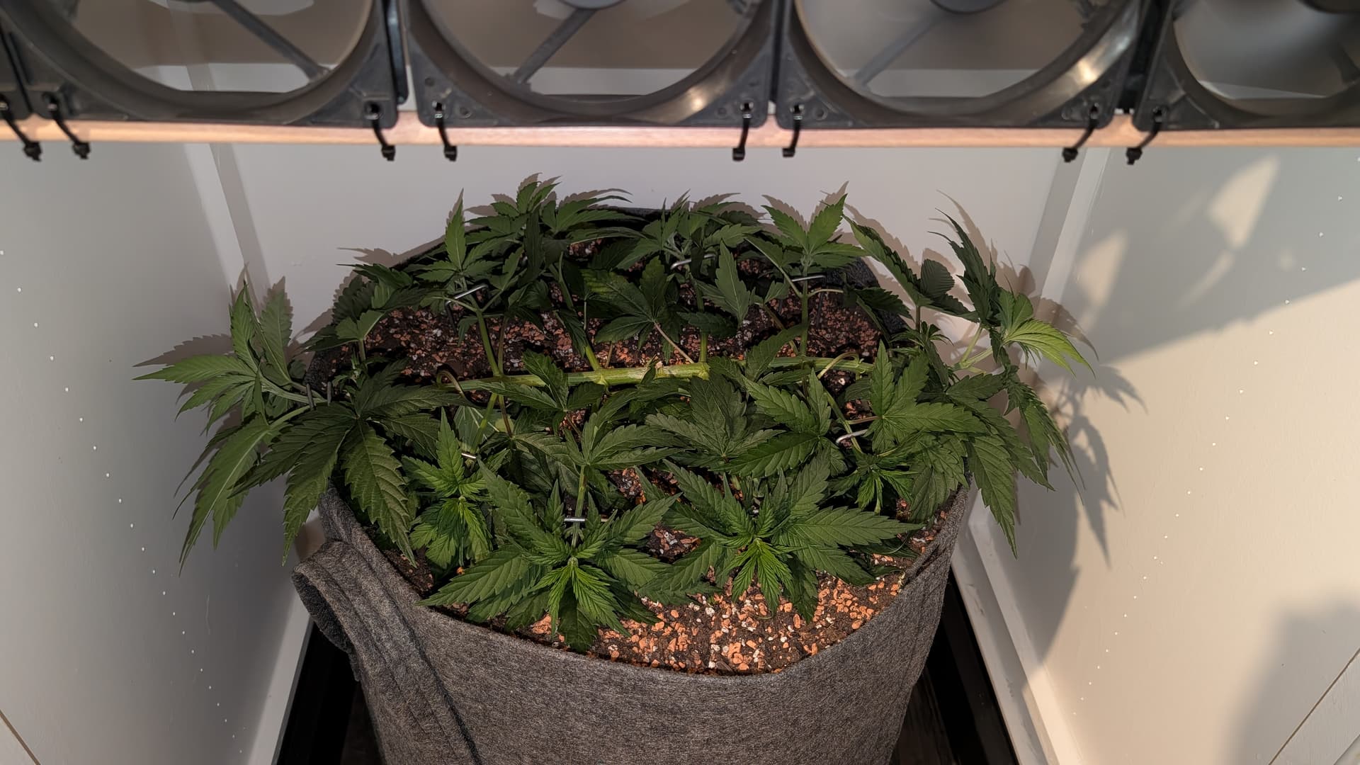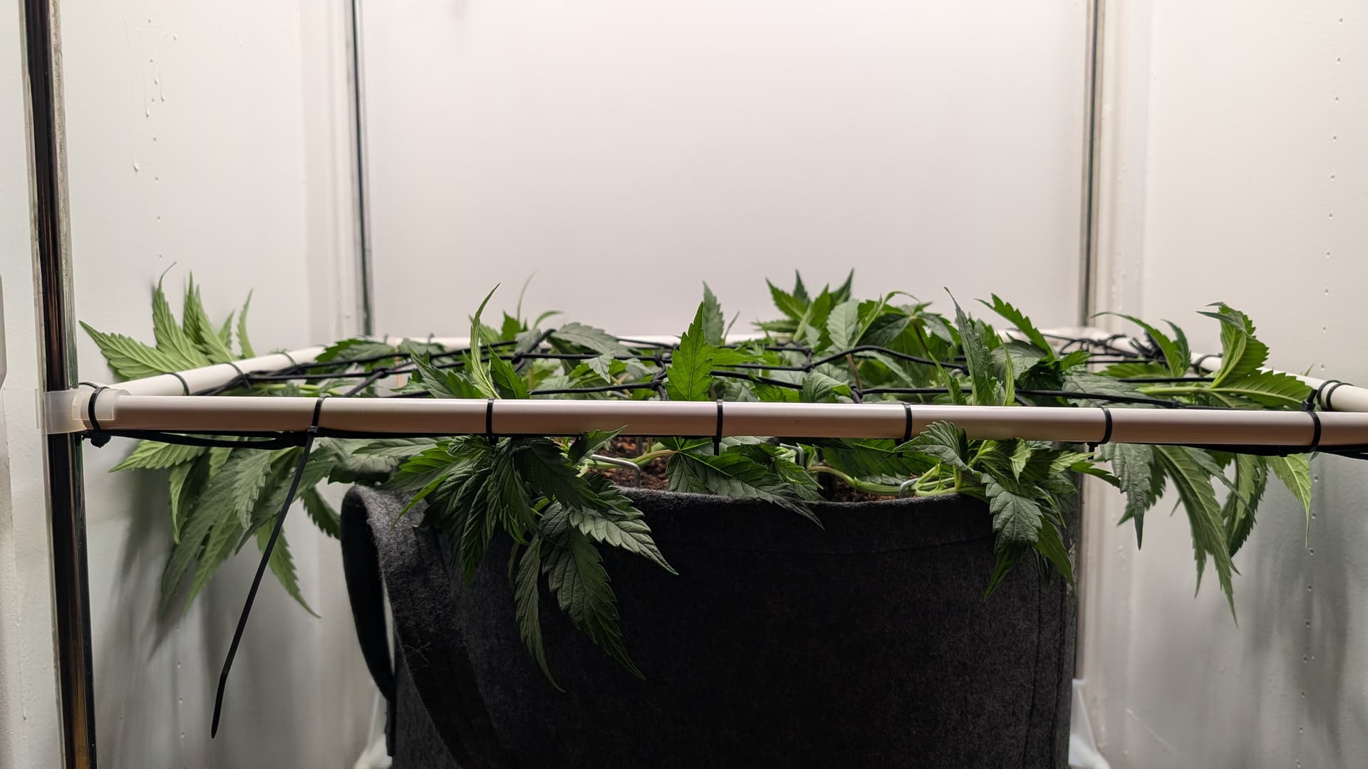 Das Licht steht aktuell bei etwa 980 µmol am Headbud und 660–680 µmol an der Seite, Autopot läuft im Wechsel zwischen 20 und 50 mbar, damit die Wurzeln aktiv bleiben.