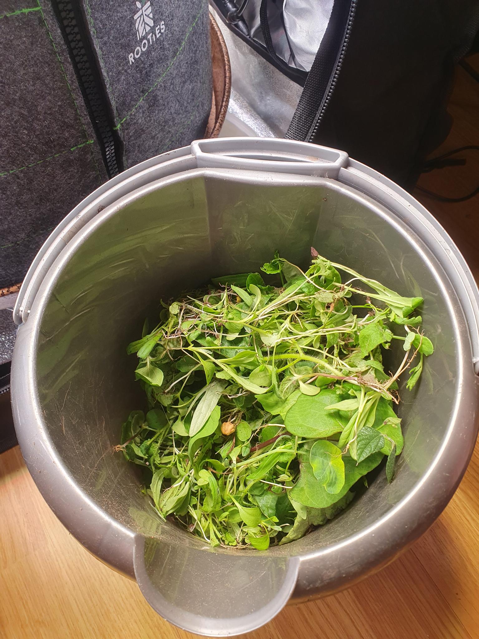 Der Rest lagert in einem 20L Topf (Rooties) als Ersatz oder Auffüllung, genauso wie die Erde aus der 2. Mischung (Root Riot 75 L) und die Mischung für die Zimmerpflanzen (Root Riot 45 L und Rooties 55 L Kartoffeltopf).