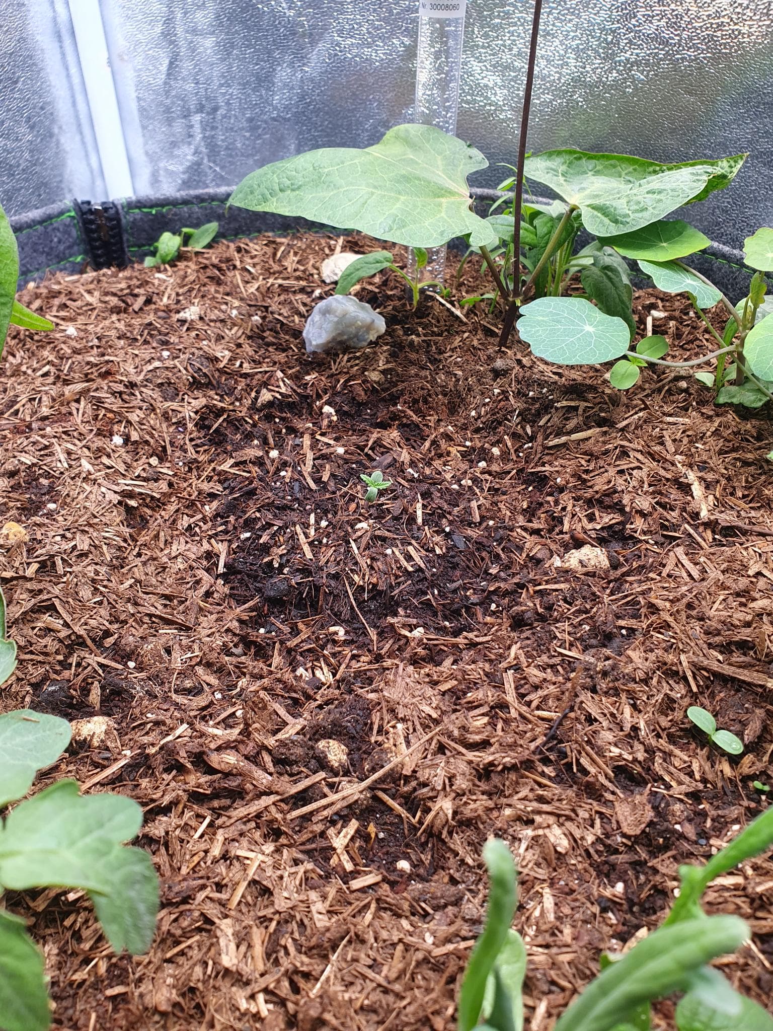 Am vergangenen Montag, ca, 2 Wochen später, habe ich dann die meisten Pflanzen rausgemacht und ein Pflanzloch mit Anzuchterde oben und gemischt mit der richtigen Erde unten vorbereitet und einen Samen eingesetzt.