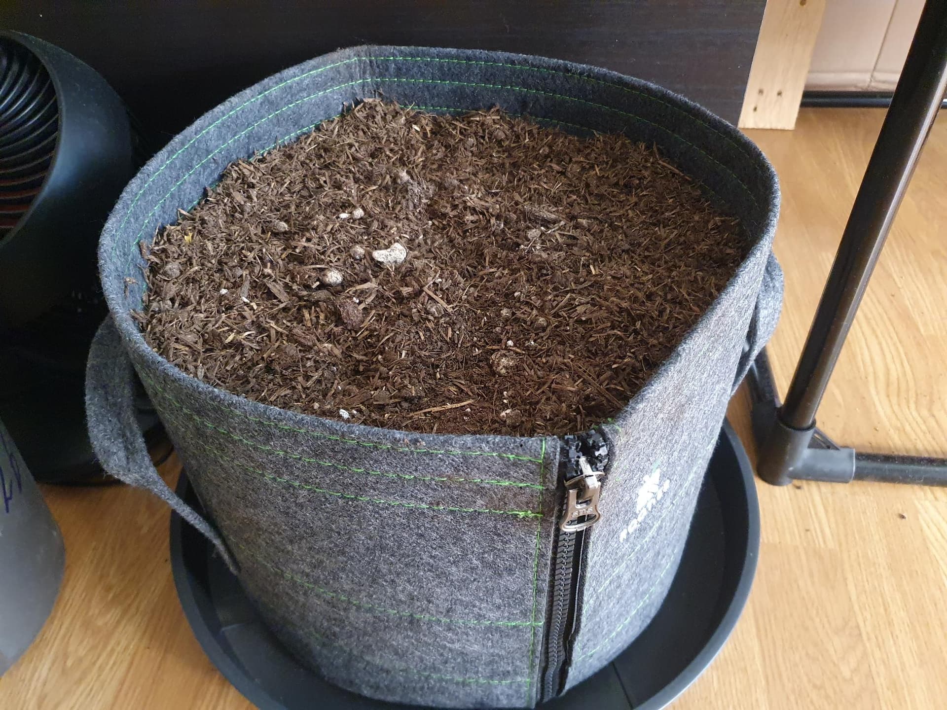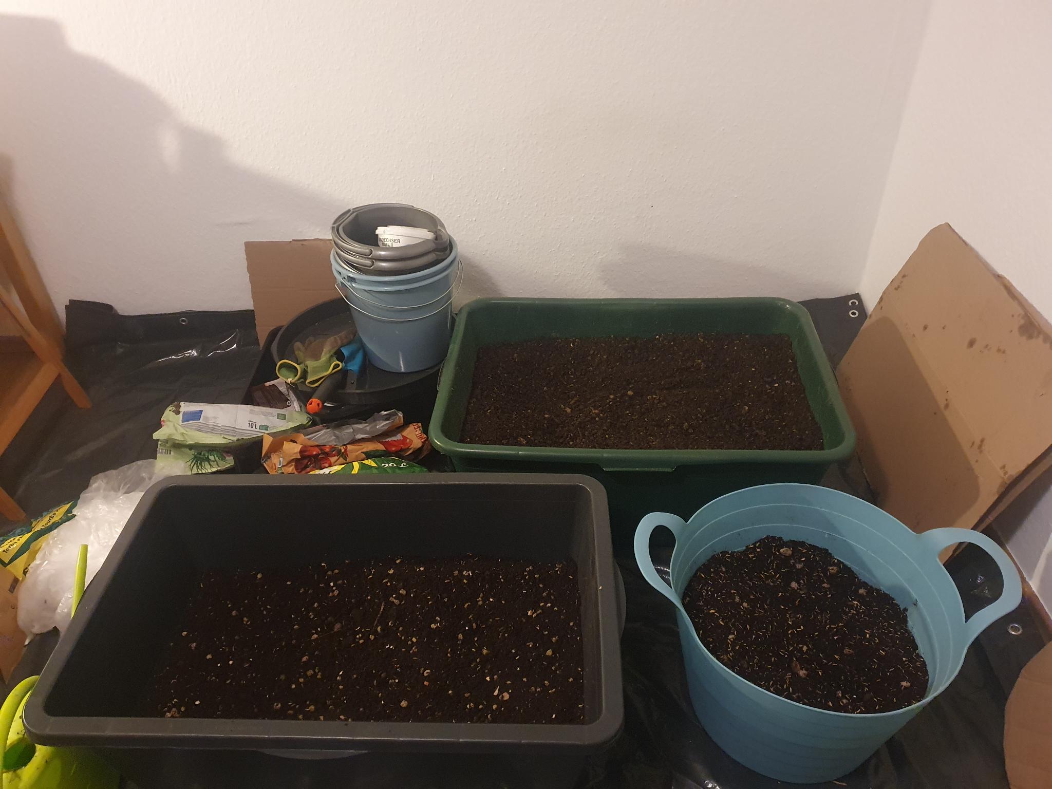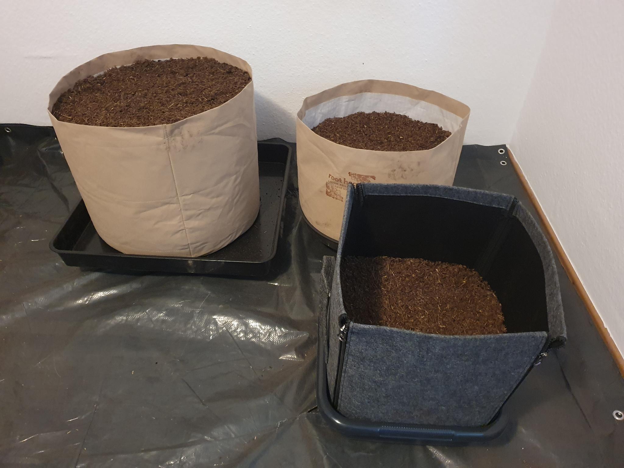 Die Erde habe ich ca. 3 Wochen „kochen“ lassen, danach habe ich, wie gesagt, noch Humus und die Sonnerde reingemischt und nochmal Mykos und die Bakterien und danach in 3 Stofftöpfe gefüllt.