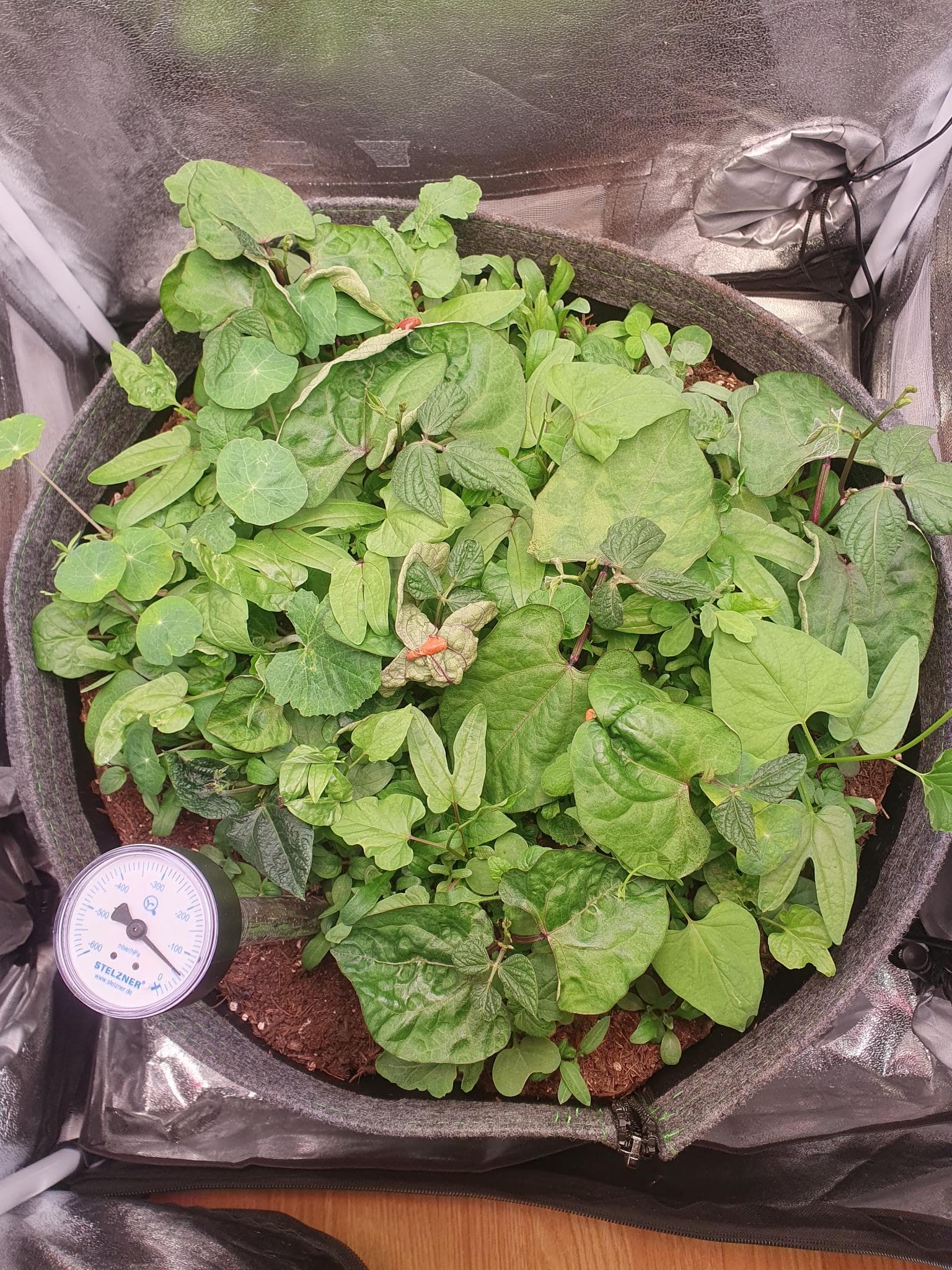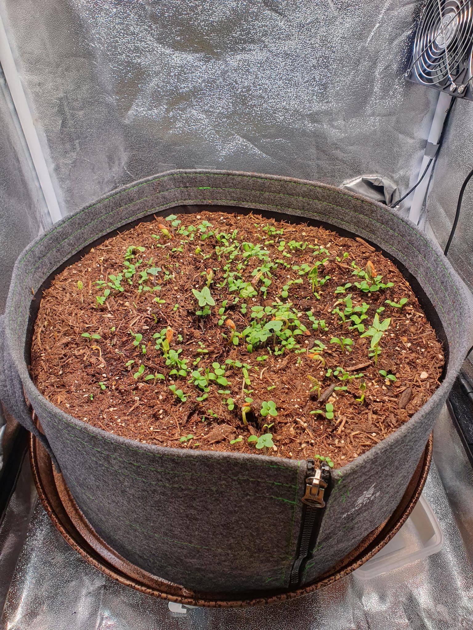 In den 40 L habe ich dann verschiedene Samen, die ich hier hatte, eingepflanzt (Tomaten, Wiesenblumen, Bohnen) und den Topf ins Zelt gestellt. Die LED habe ich auf 40% und 12 h Licht eingestellt.