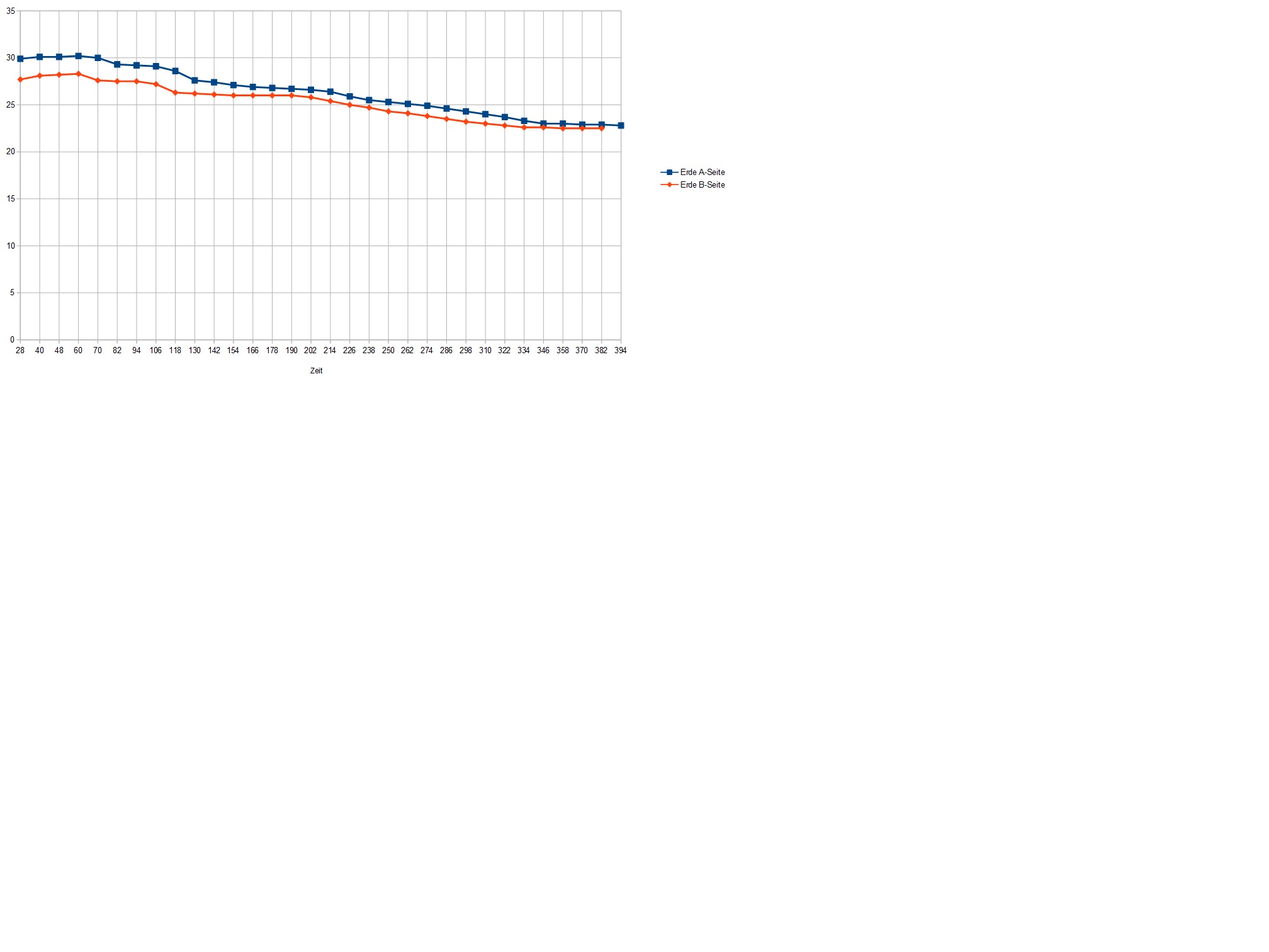 Die Temperatur an der Außenwand (Kerntemperatur nach einem Tag war 42°) habe ich immer wieder mal gemessen, Messpunkte dazwischen habe ich extrapoliert.