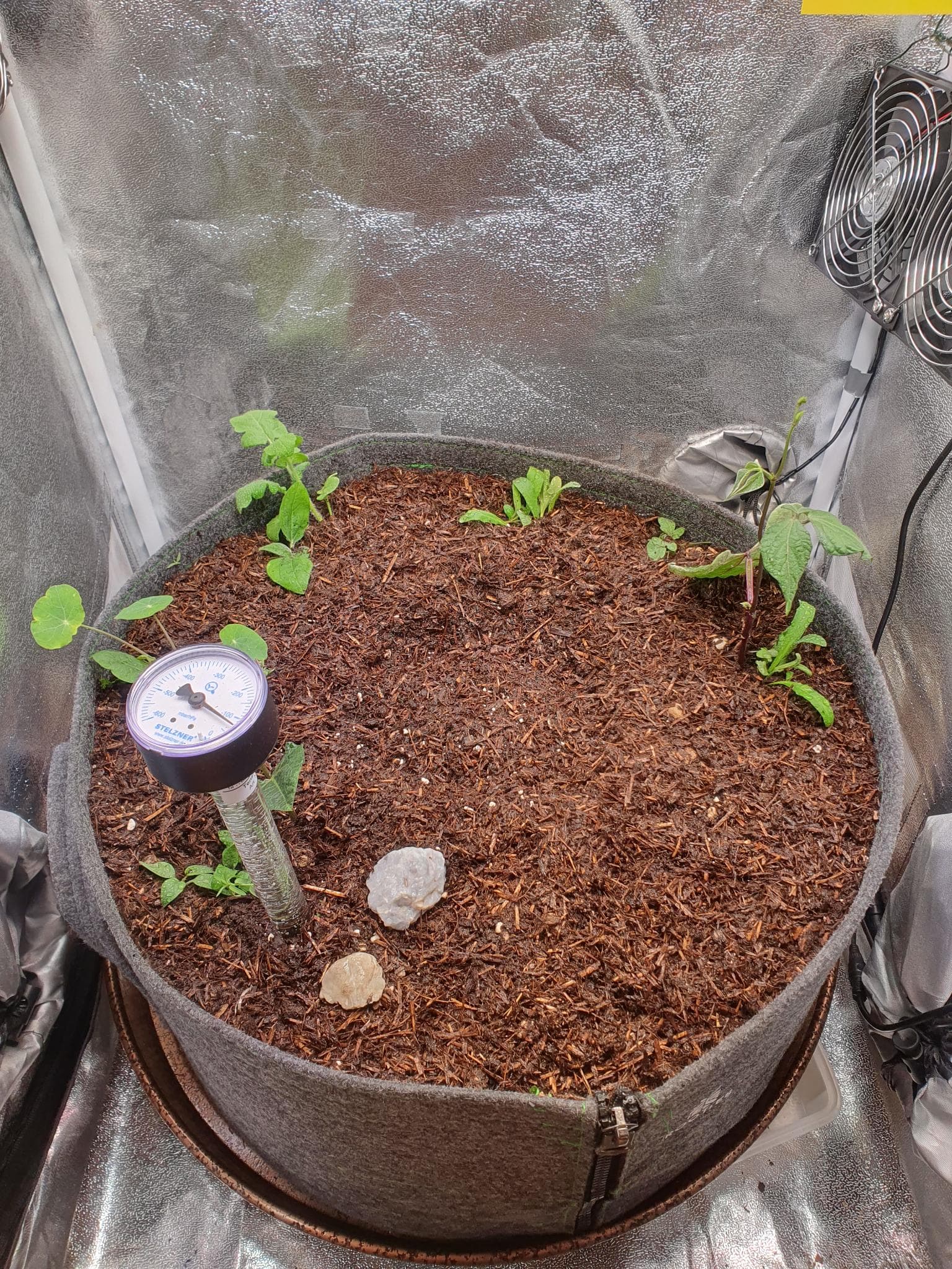 In den 55 L Topf habe ich auch Samen eingepflanzt, aber ein paar Tage später und der Topf steht vor dem Fenster, nicht unter der LED, da das große Zelt noch belegt ist. Der Unterschied beim Wachstum ist enorm!