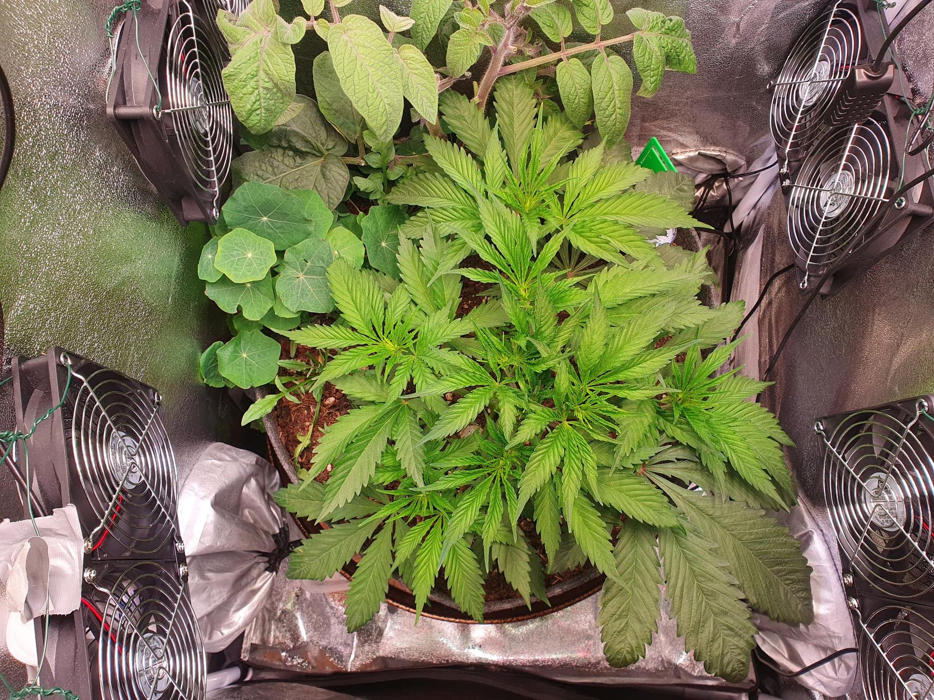 Die Abstimmung ist sehr knapp und dem Geist der Abstimmung entsprechend, habe ich ein großes Fächerblatt abgeschnitten. Es war das tiefste von den 3. Die anderen 2 sind ziemlich weit oben, die Belüftung sollte also auch mit diesen 2 Blättern OK sein, denke ich.